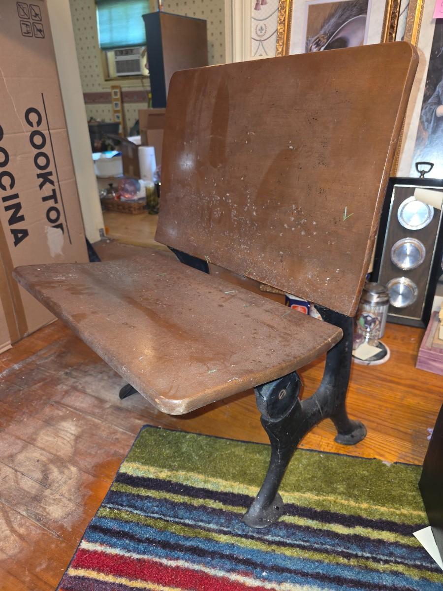 Cast iron base. Folds. 21 inches wide. Back to floor is 26 inches.