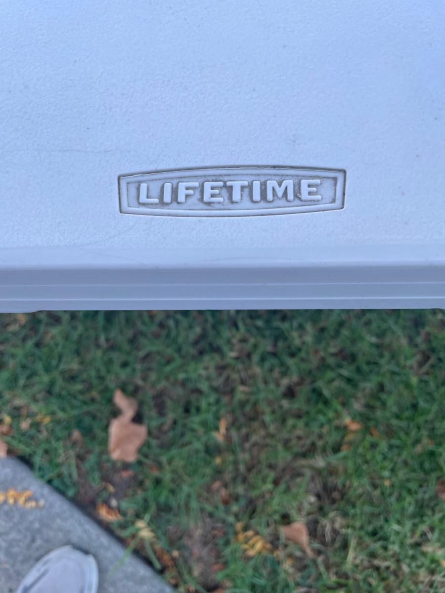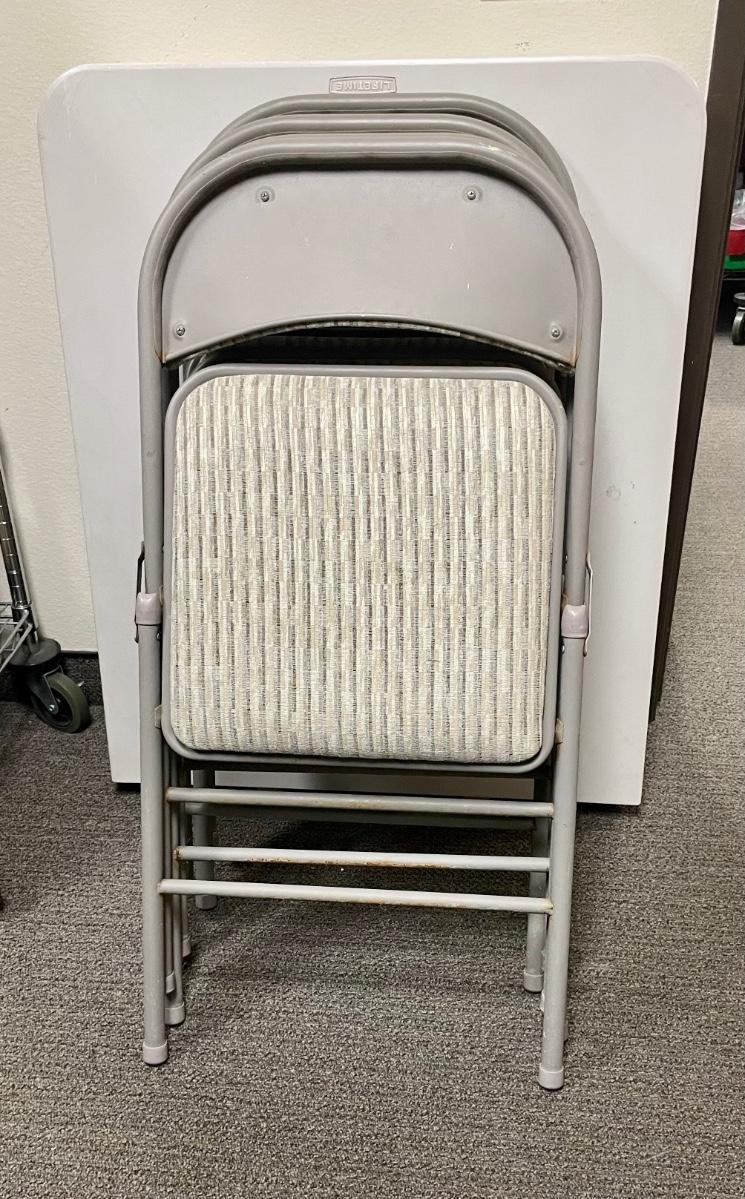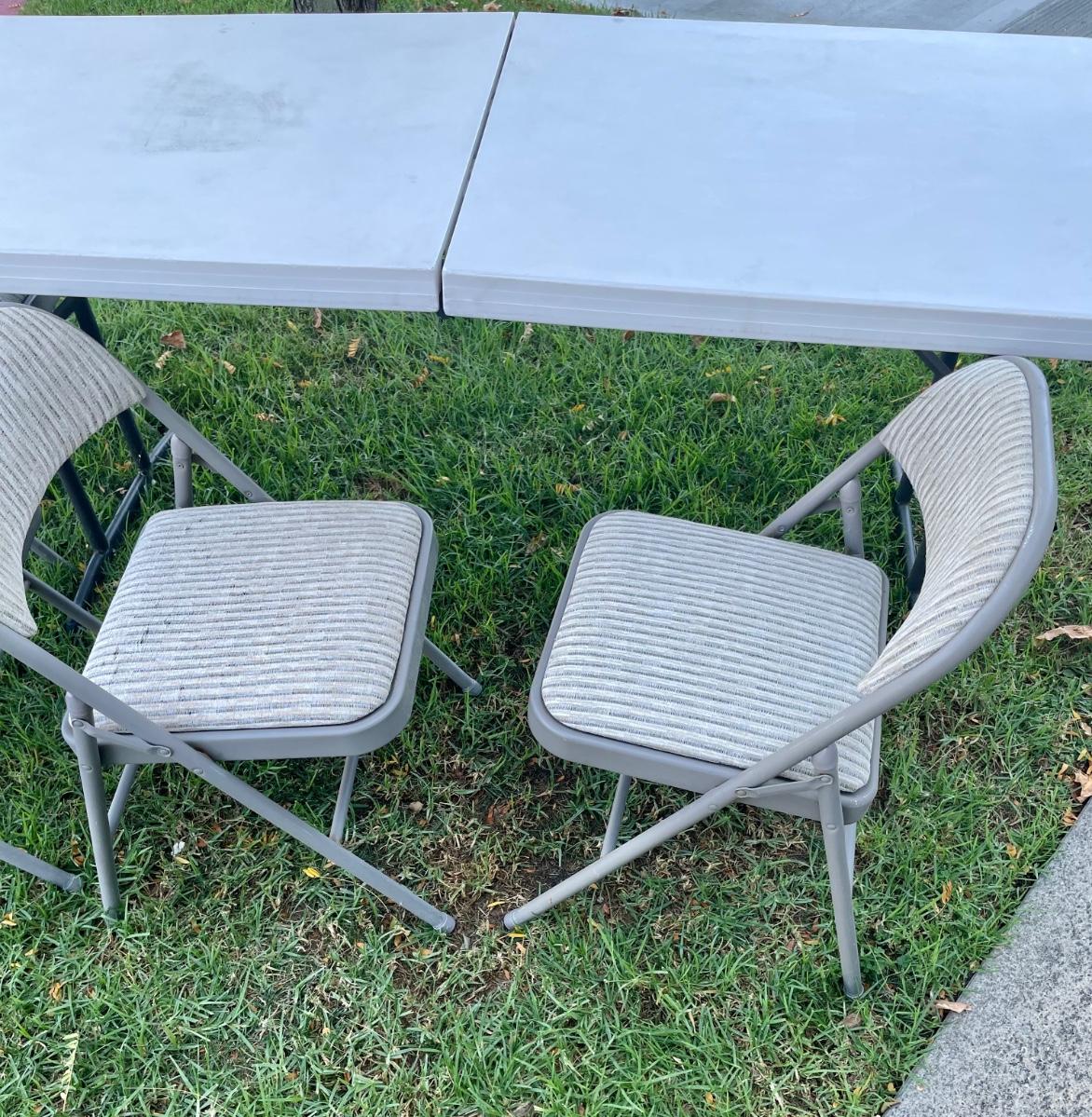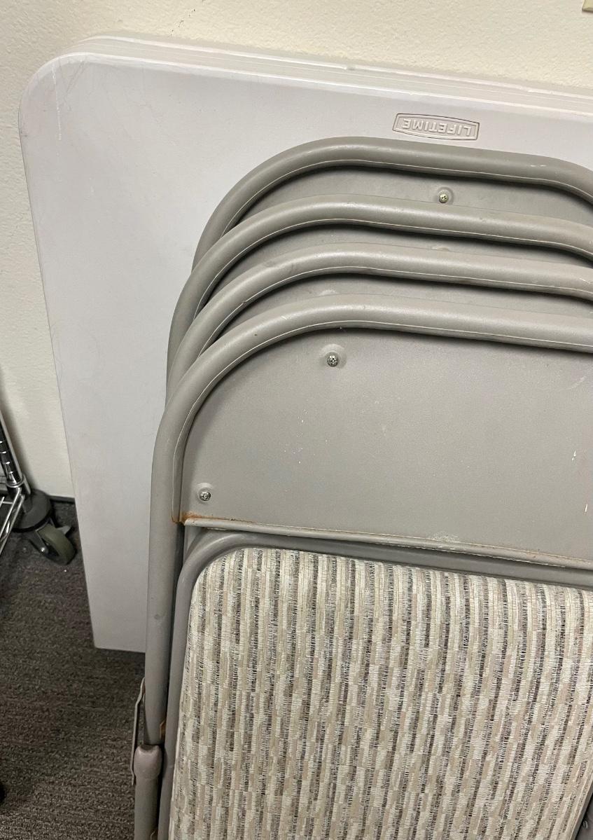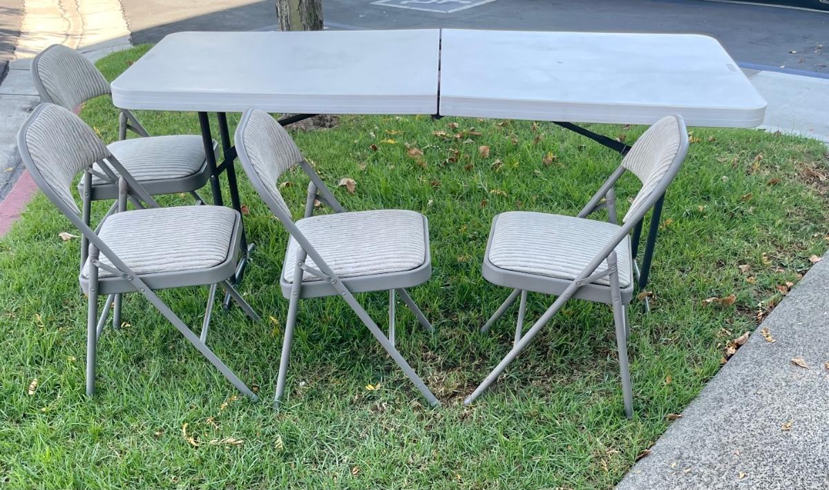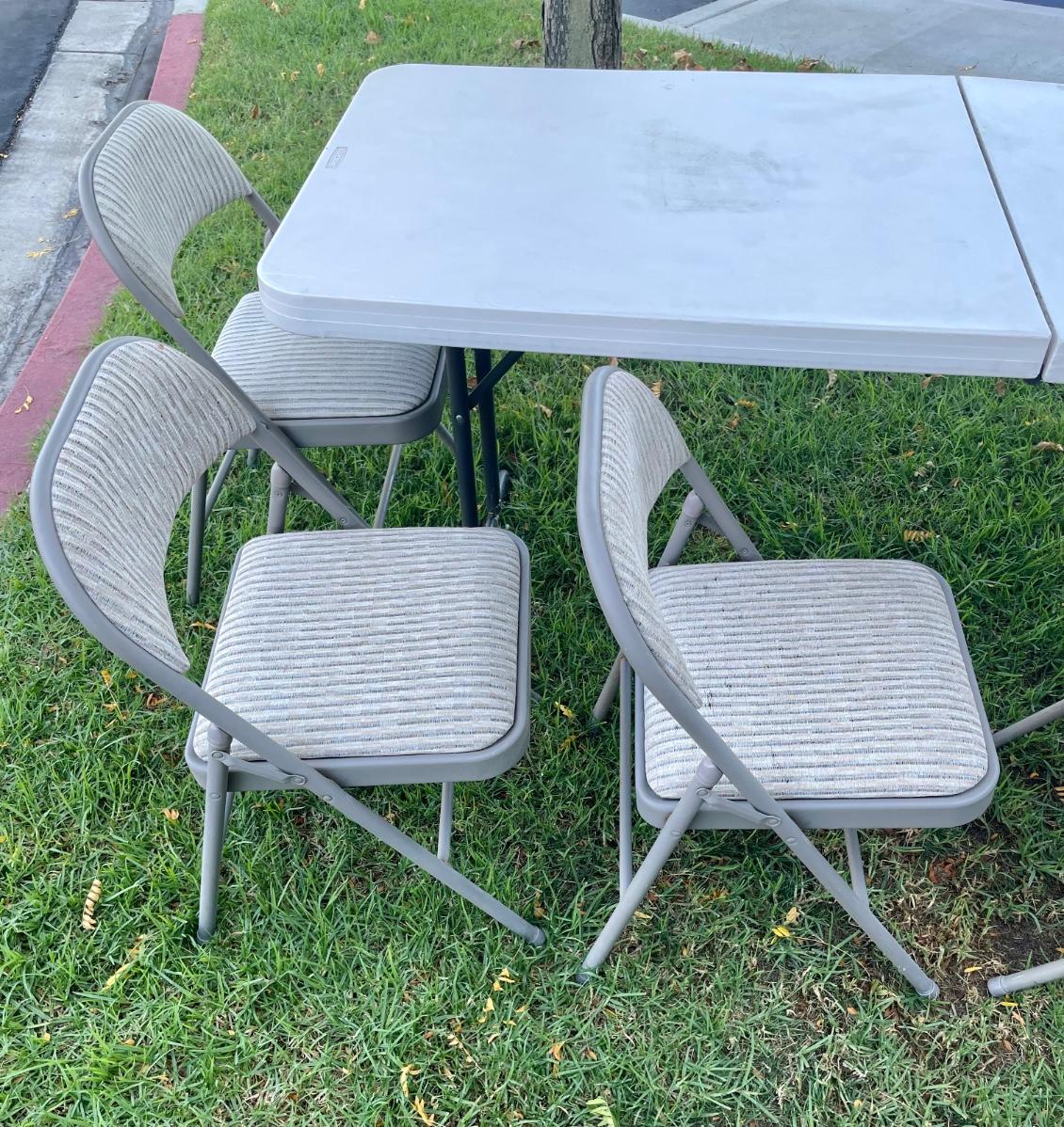 30” x 72” folding table by Lifetime. Also 4 padded folding chairs.