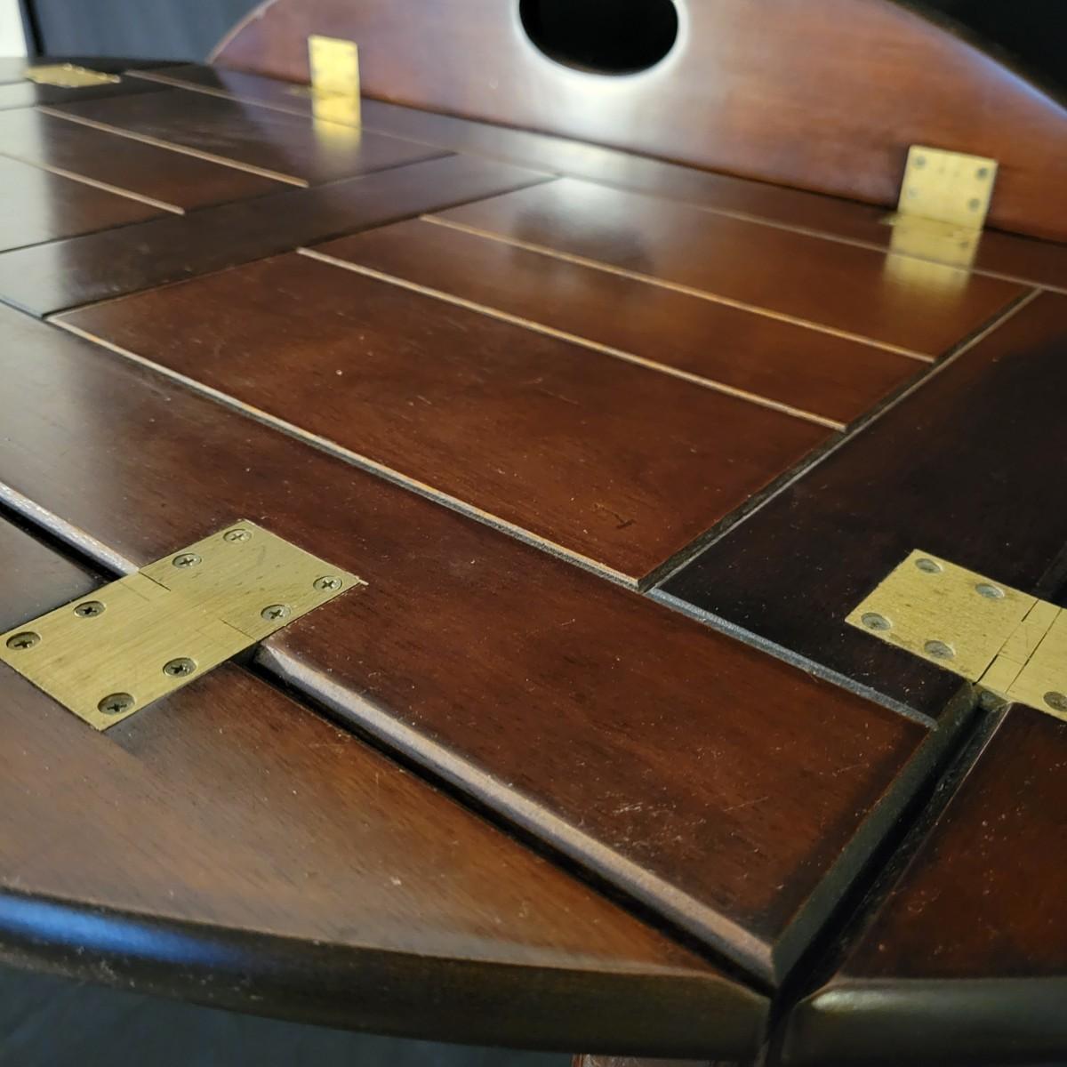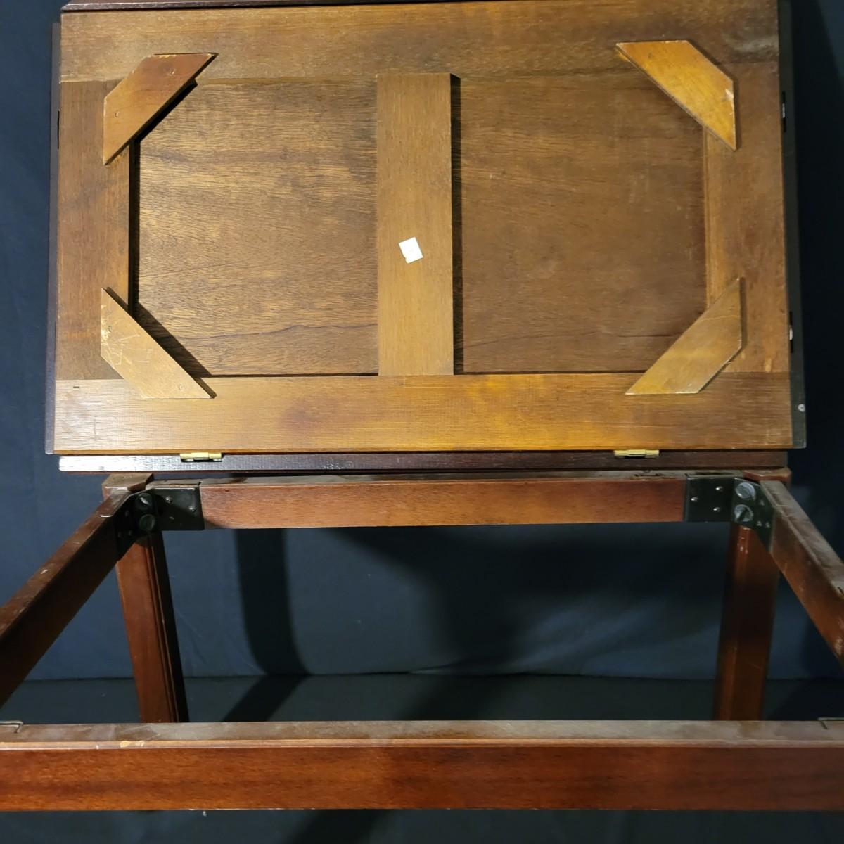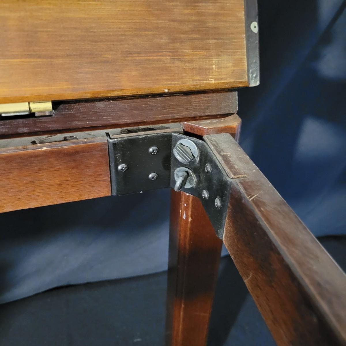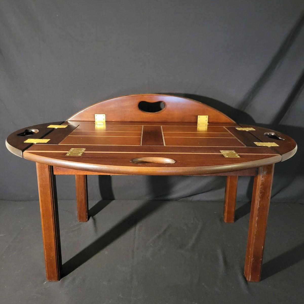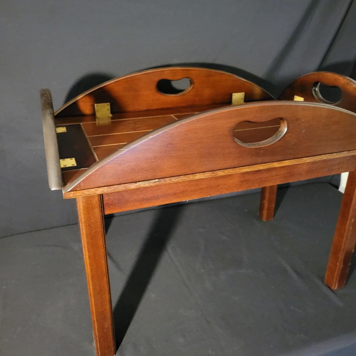 A small folding tea table with a detached top and folding edges with handles in good condition with some minor blemishes. A table perfect for setting up tea and moving it to a different location with a top that is not anchored to its base. Measures approximately 35" x 25.5" x 16" Local pickup only