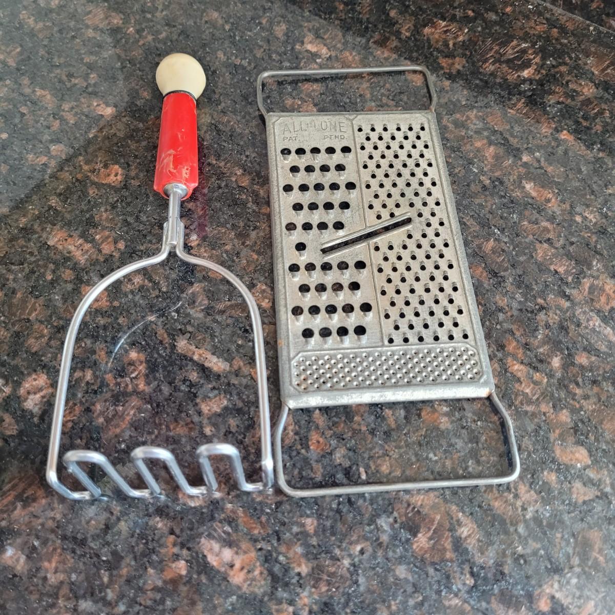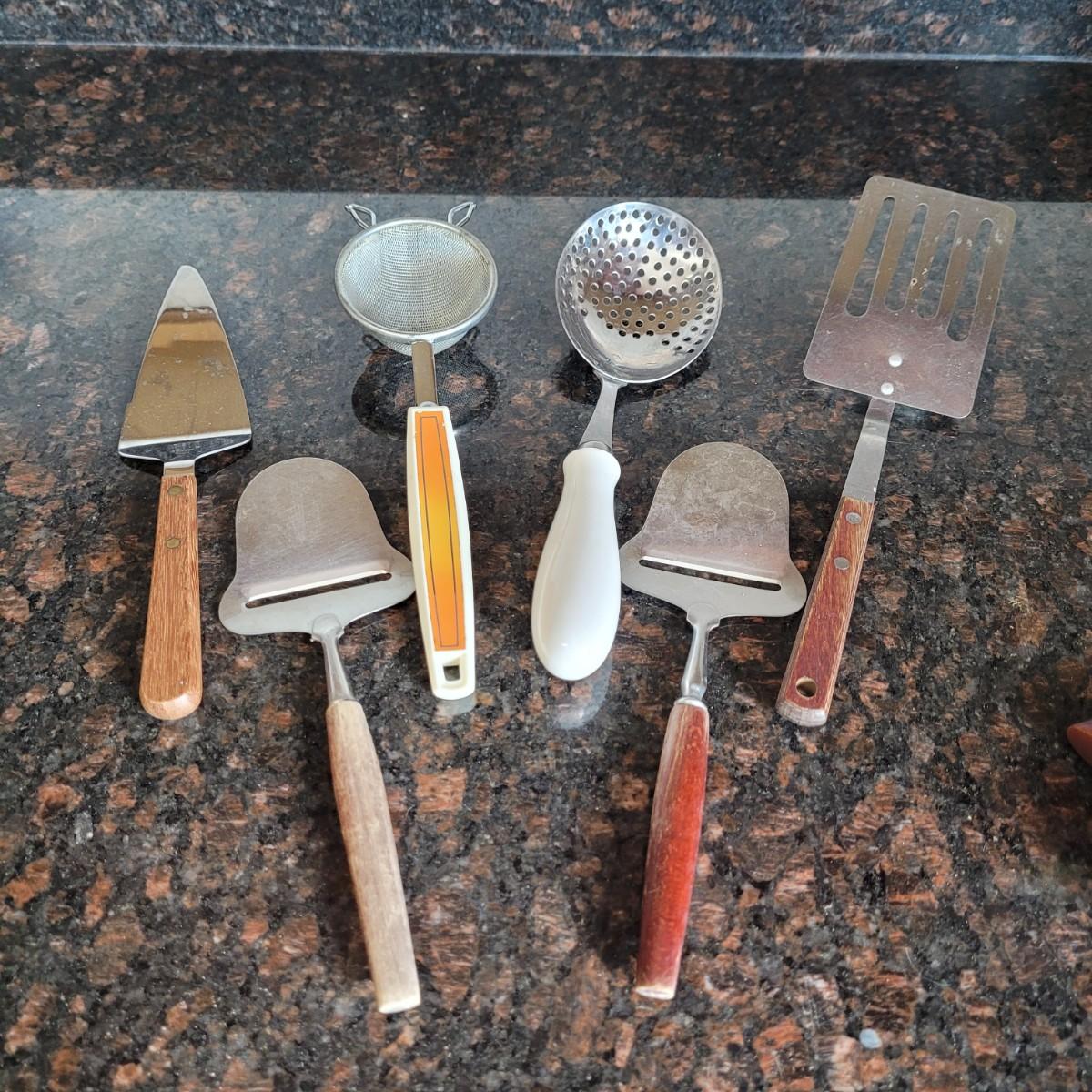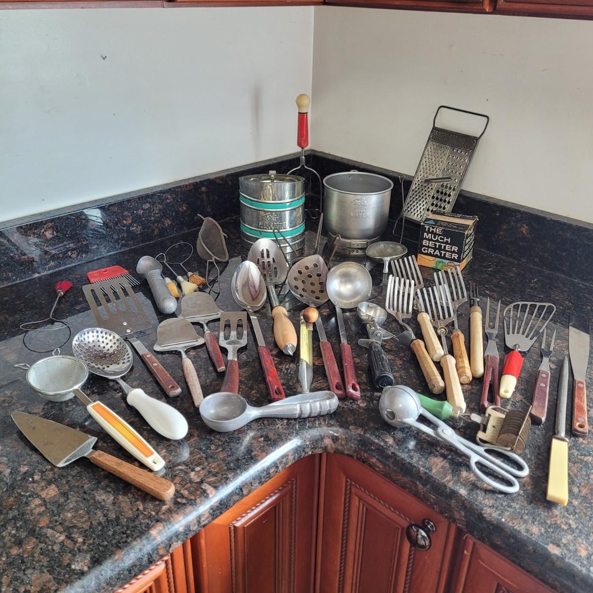This fun assortment of vintage kitchen utensils includes two Foley flour sifters, graters, ice cream servers, spatulas, serving spoons and much, much more. Sifters measure approximately 5.5”D x 5”H. Please see photos for details. Shipping available.