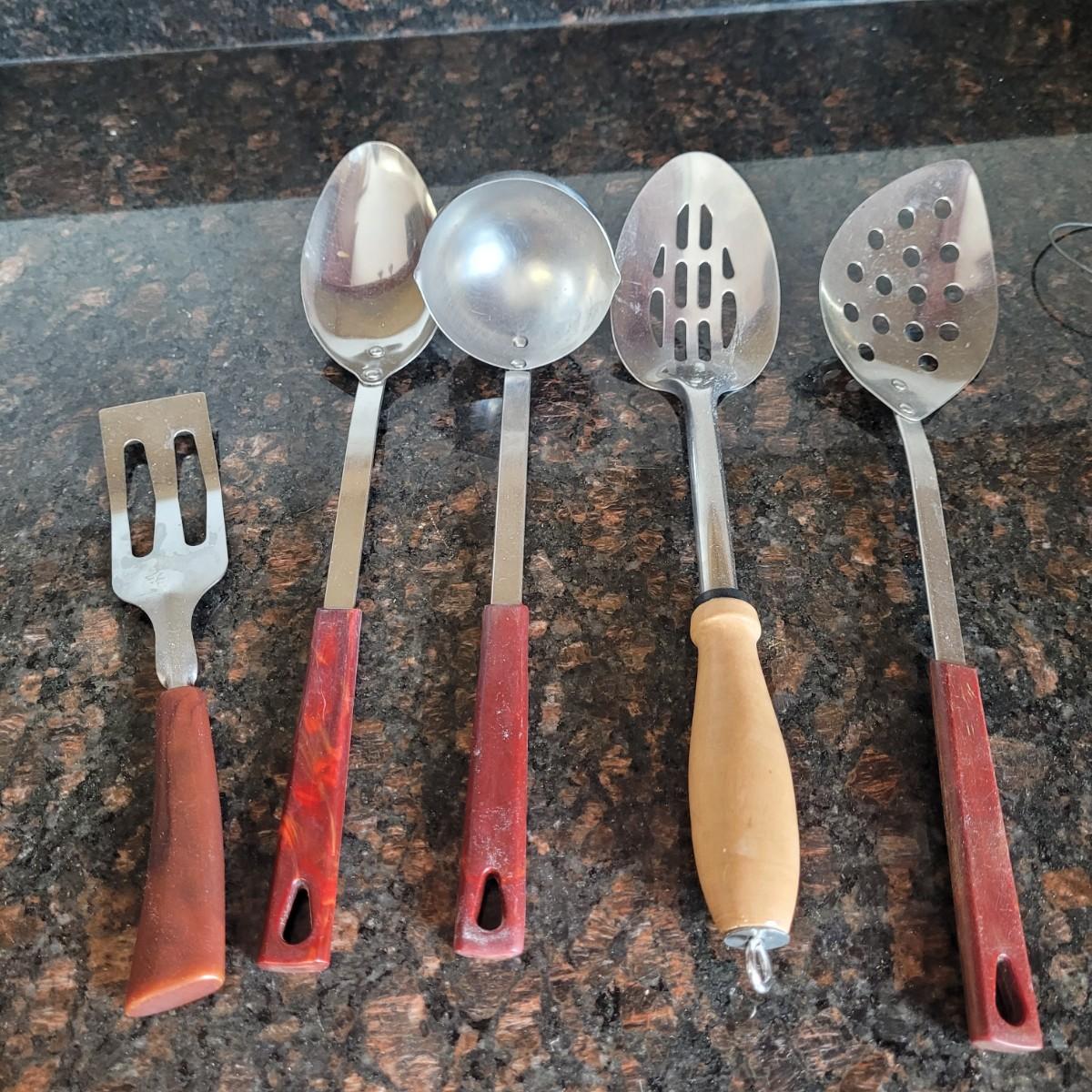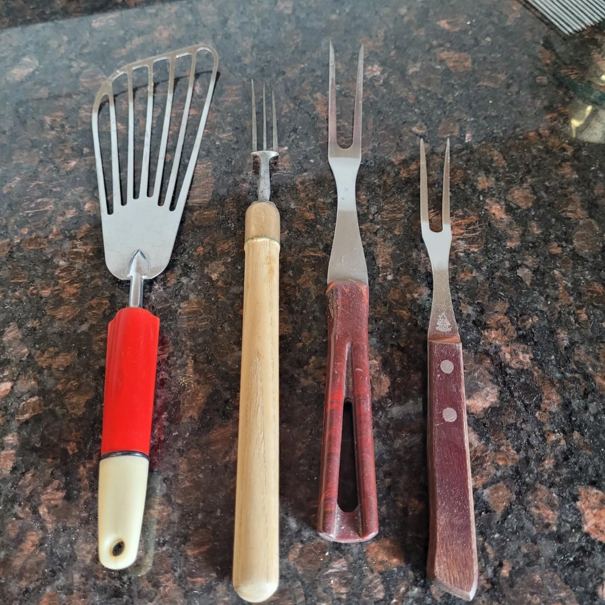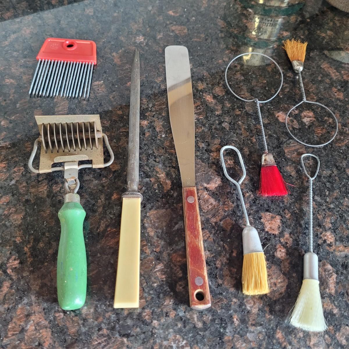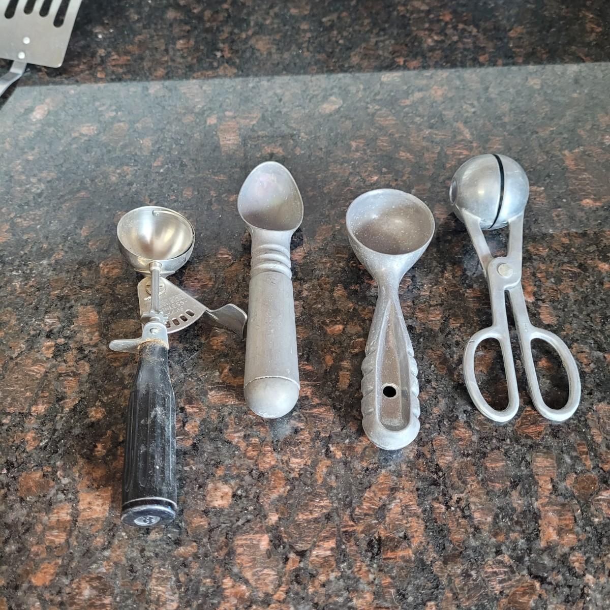 This fun assortment of vintage kitchen utensils includes two Foley flour sifters, graters, ice cream servers, spatulas, serving spoons and much, much more. Sifters measure approximately 5.5”D x 5”H. Please see photos for details. Shipping available.