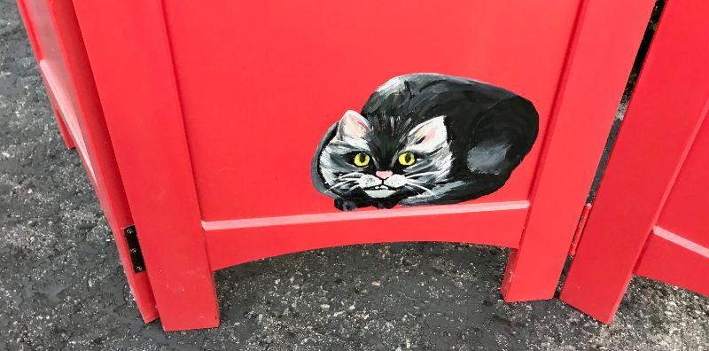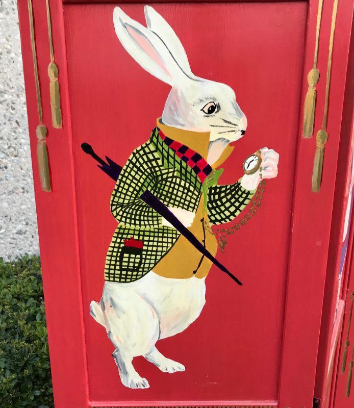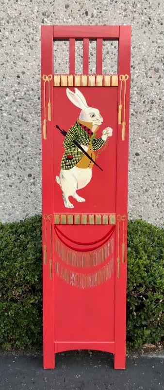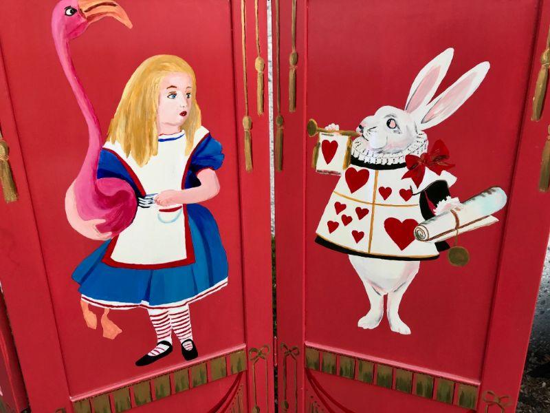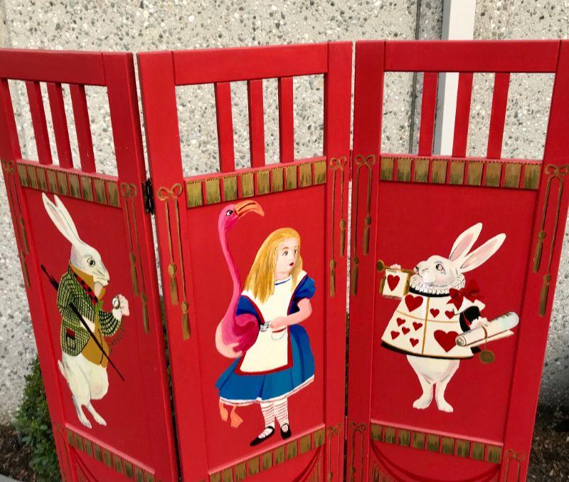 Alice in Wonderland themed paint room divider. Wood divider has been painted red with Alice, the White Rabbit. and the Cheshire Cat. 3 panel divider. Good condition. Measures about 71"x54"x1".