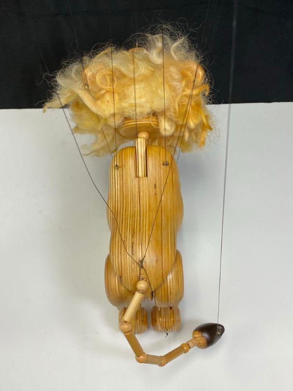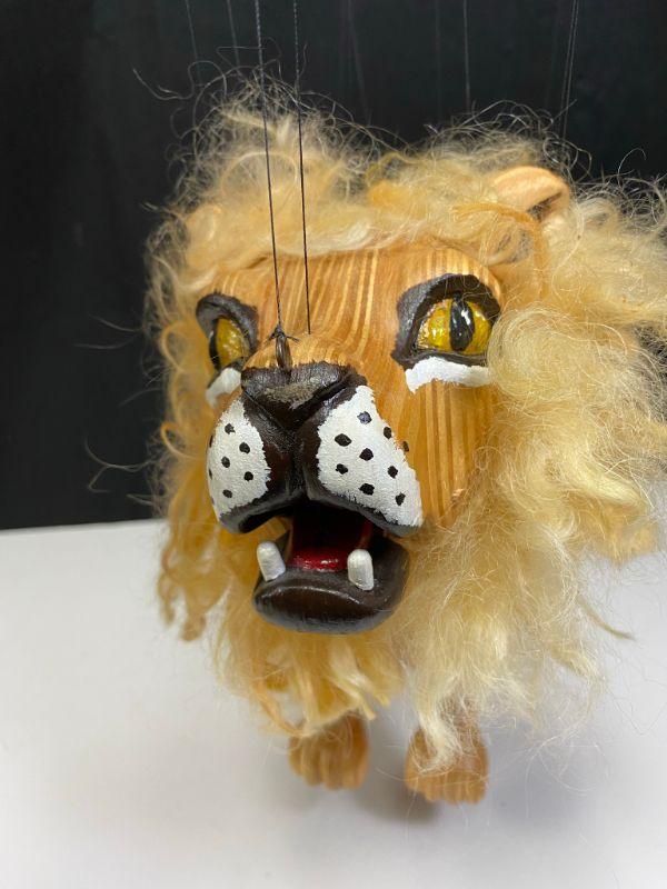 Folk art style articulated lion marionette puppet. Double handle control string puppet. Mouth opens and closes with string control. Fully articulated, moves great. Wild and crazy mane. Measures about 8"x12" without strings. On the heavier side, solid wood pieces. No markings but research has it coming from an artist in England. Faint scuff on the nose.
