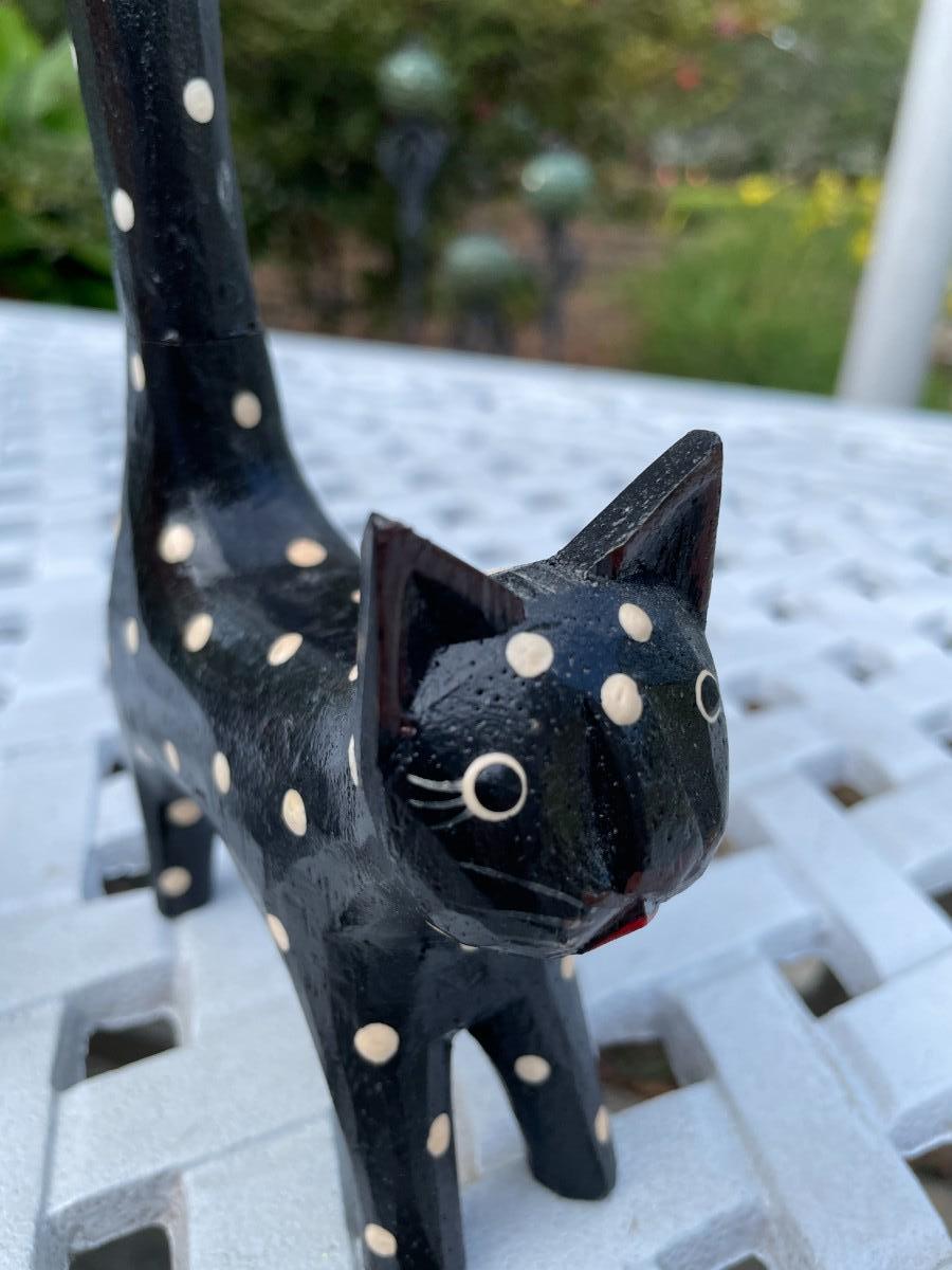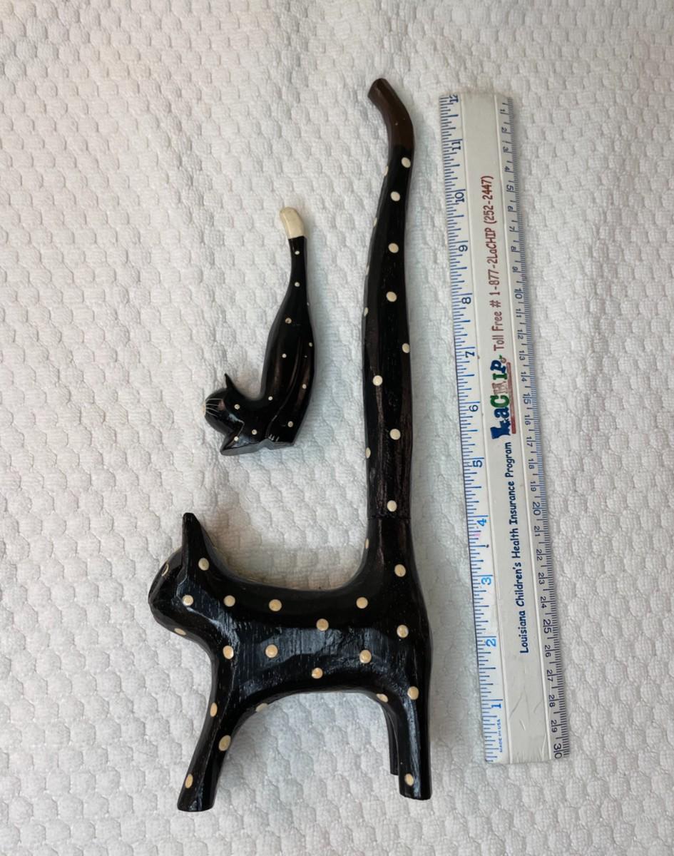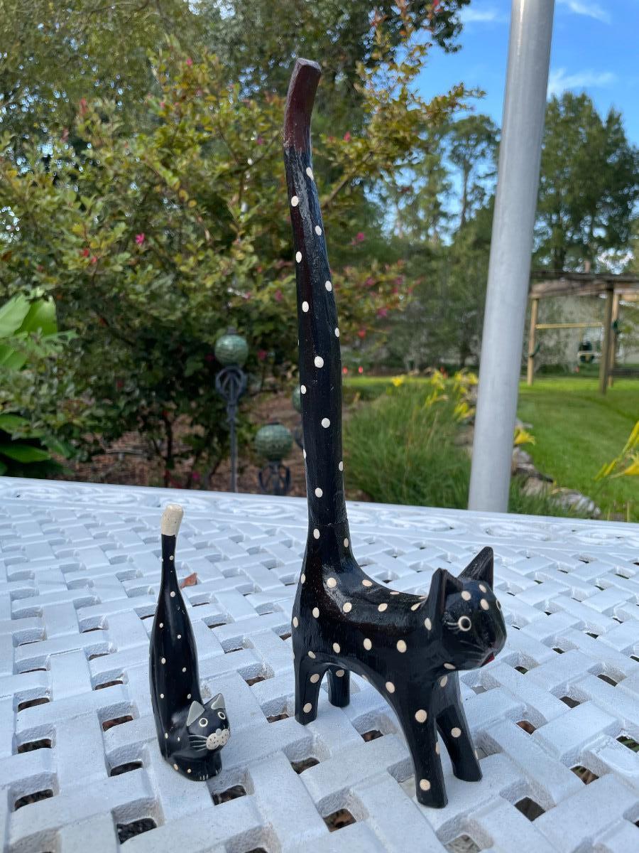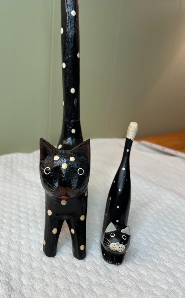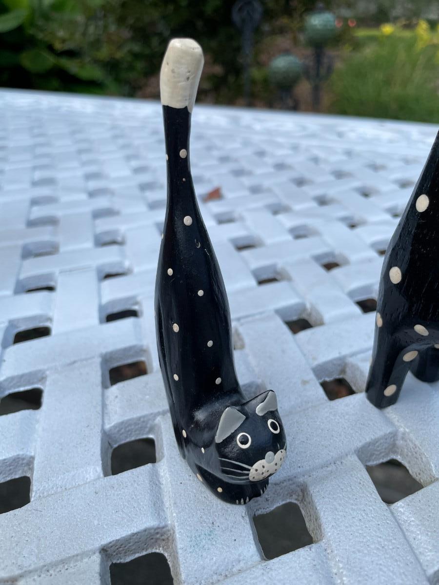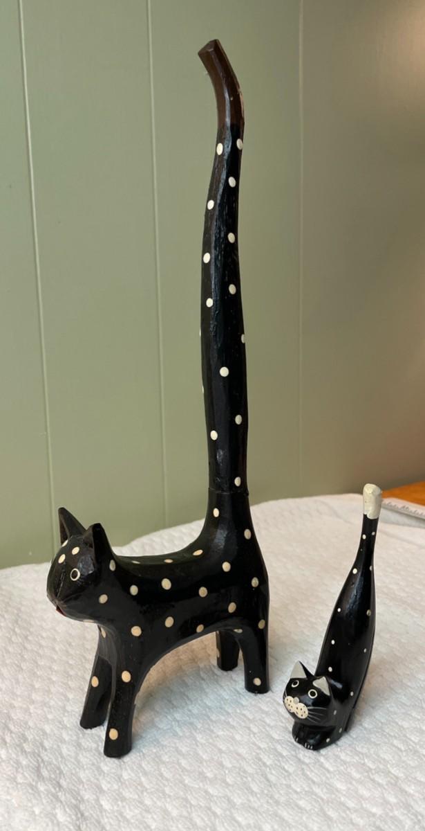 Two folk art type, black with white polka dot cats. No markings. Tall cat is 12.5" high with a removable tail for storage, short cat is 4.25" high. Allergy free, non-shedding!