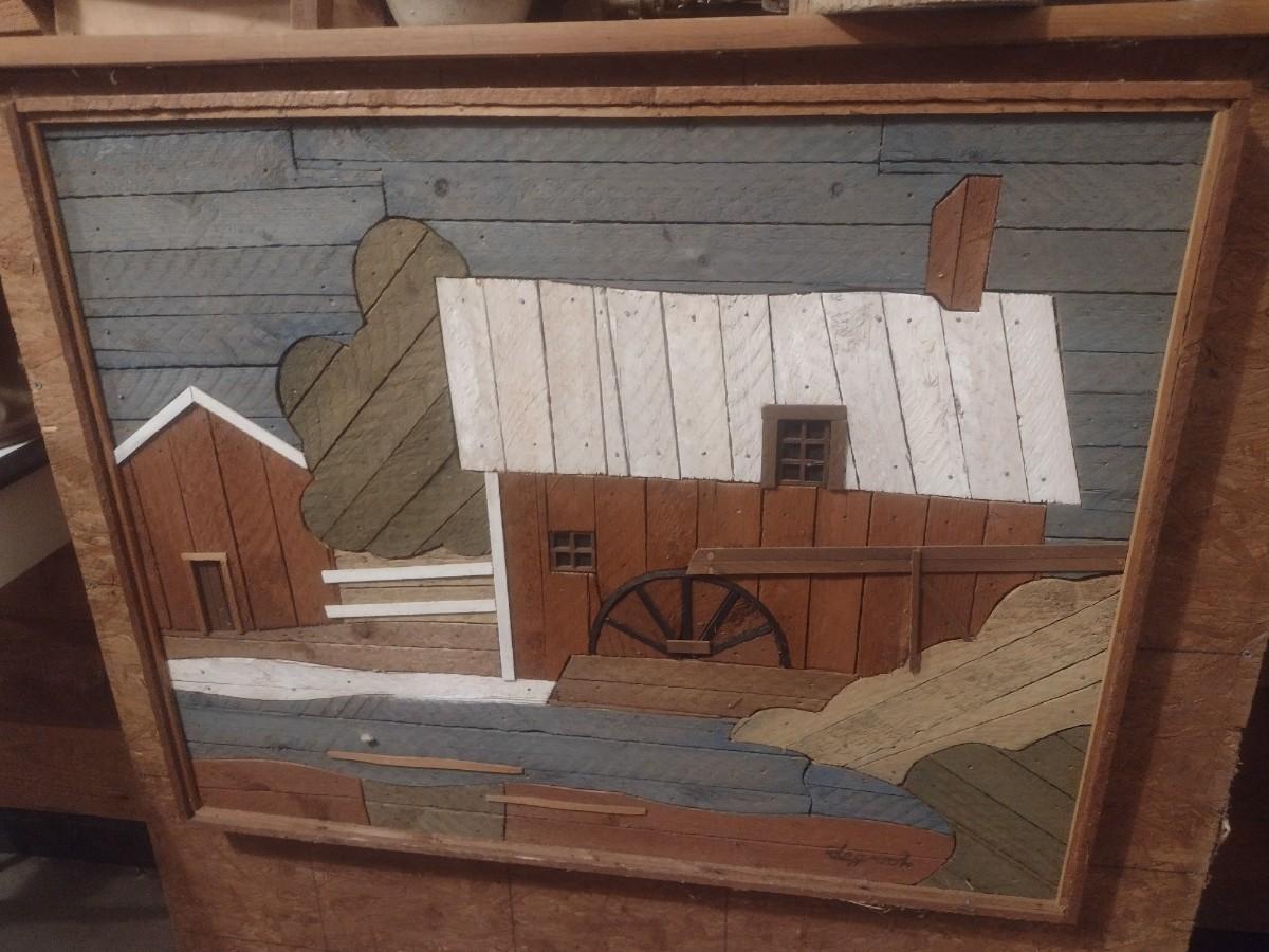 Folk Art Framed Wood Pieces Barn and Grist Mill. Shipping is by third party only such as UPS Store. Auction firm will make sure item is available for buyer's shipper of choice to pick item up and who will do all packing and shipping for the buyer. Buyer agrees to pay all fees associated with the shipping of this item.