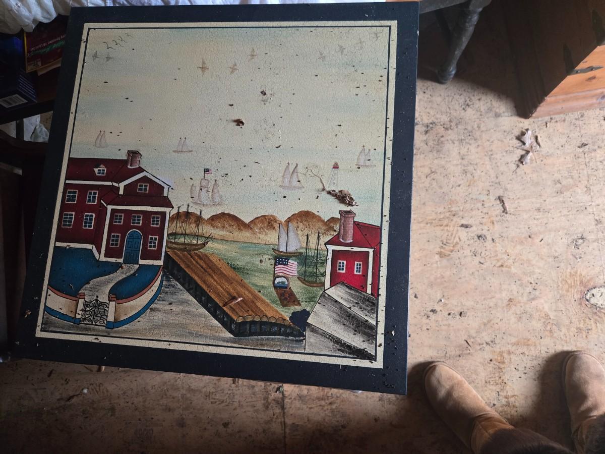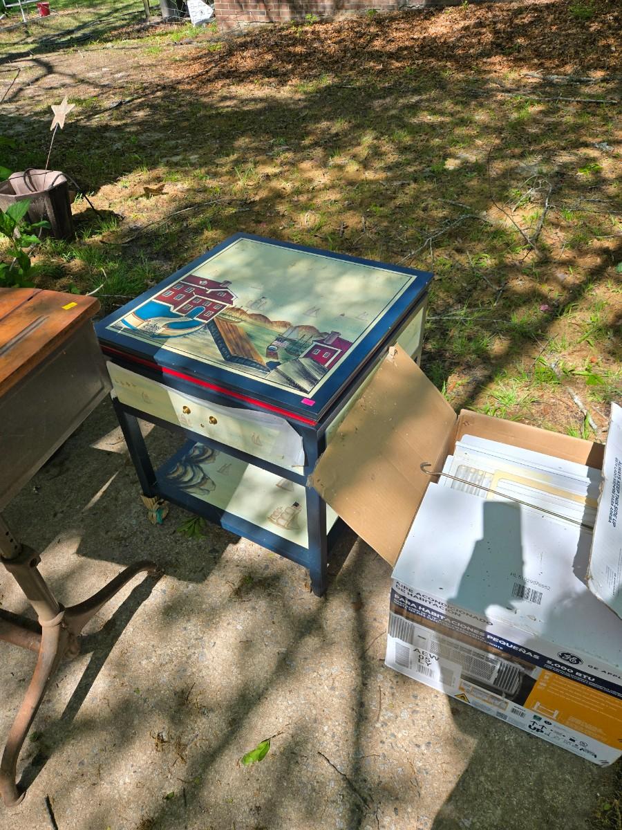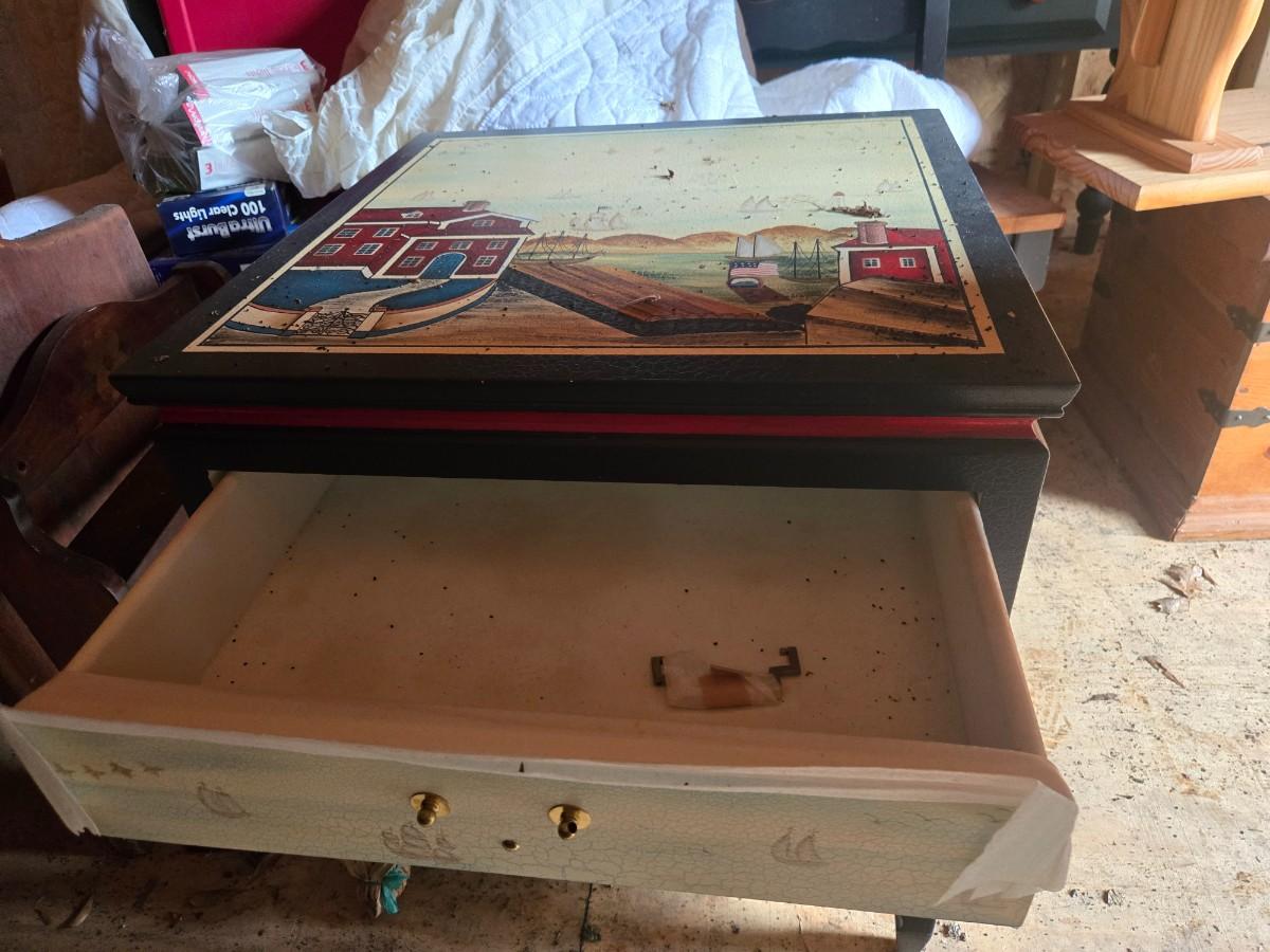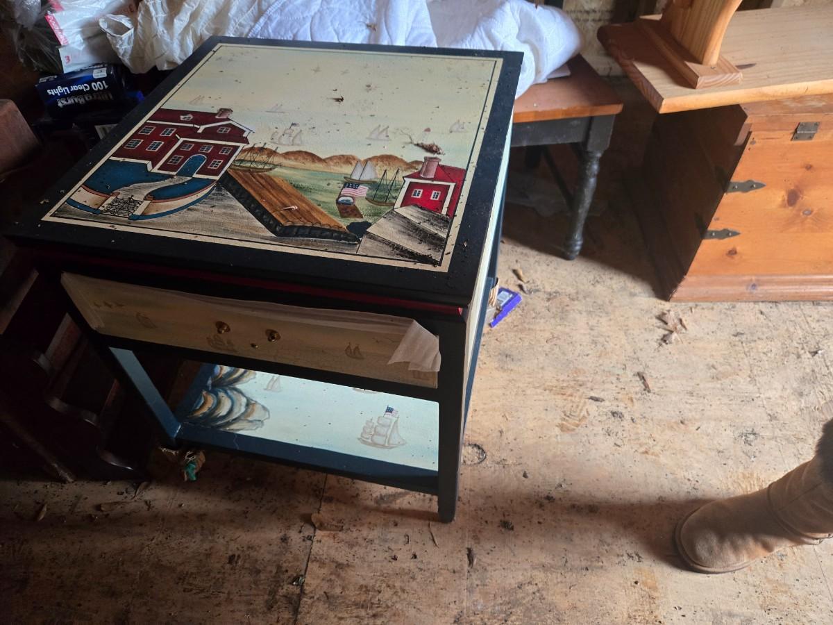 Unique hand-painted side table featuring a coastal village and ships. Distressed finish and whimsical style make this perfect for cottage, lake house, or coastal-themed décor.