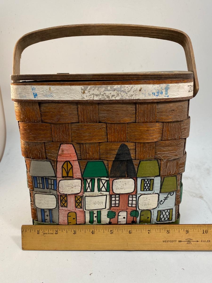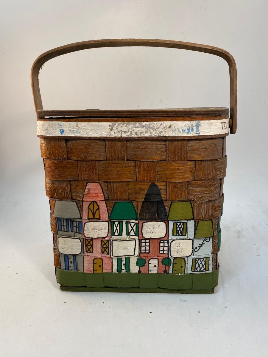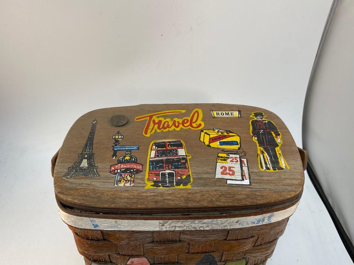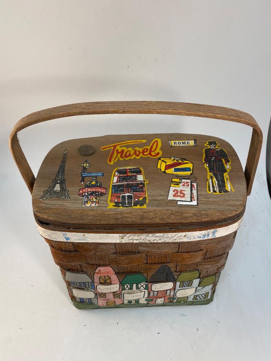 Folk Art Painted Small Picnic Style Basket with Gardening Gloves & Accessories. Cute travel themed folk art. In slightly weathered condition. Comes with some garden gloves, clippers and other items inside.