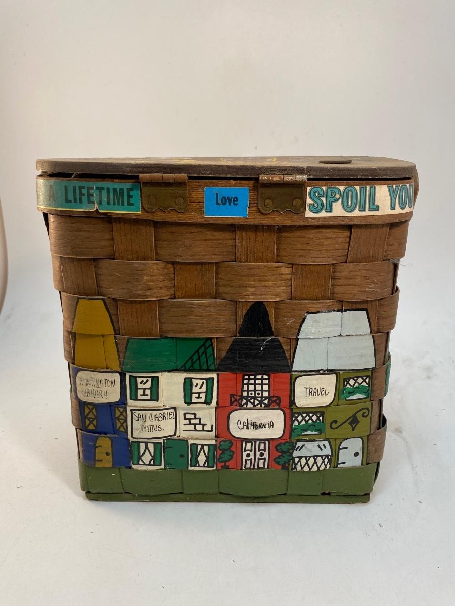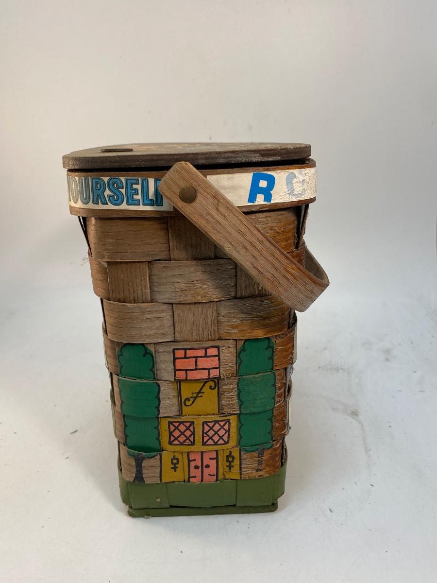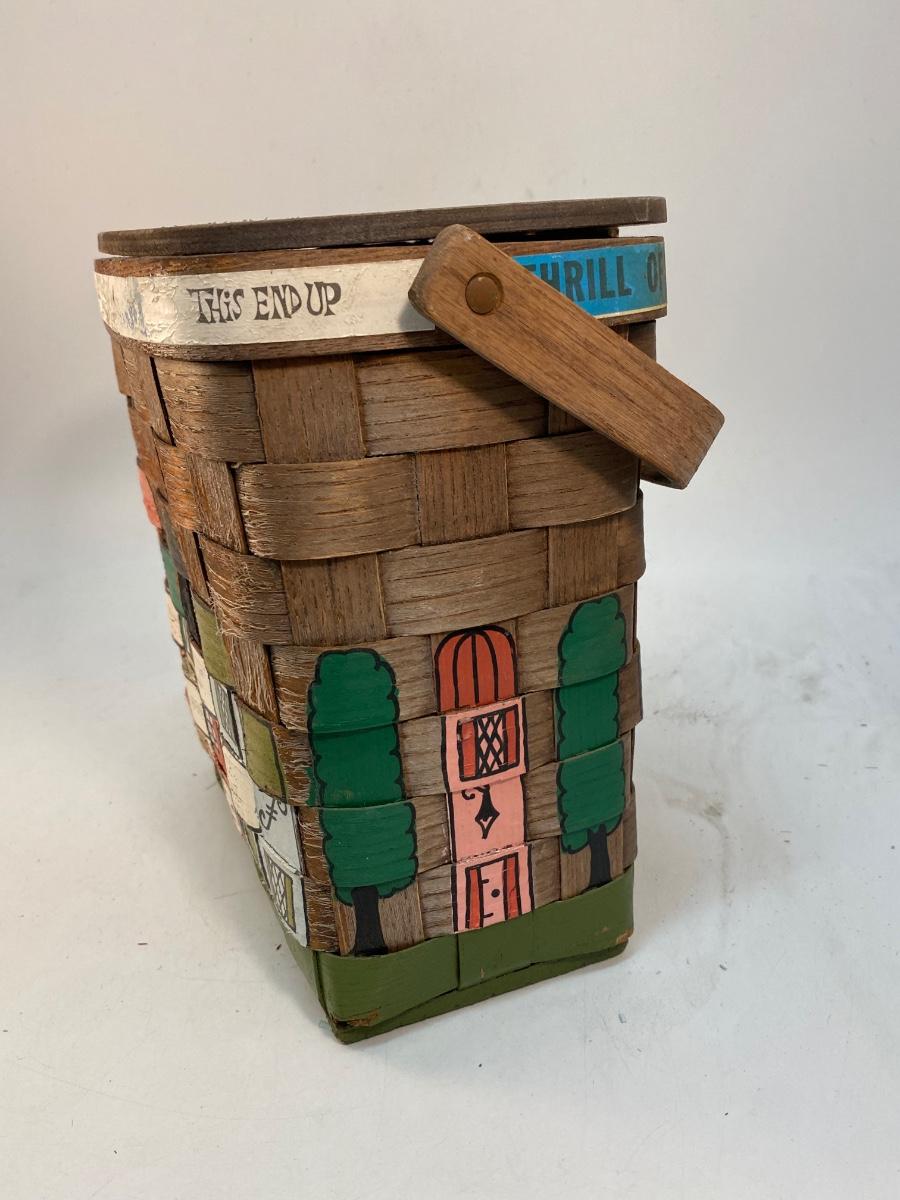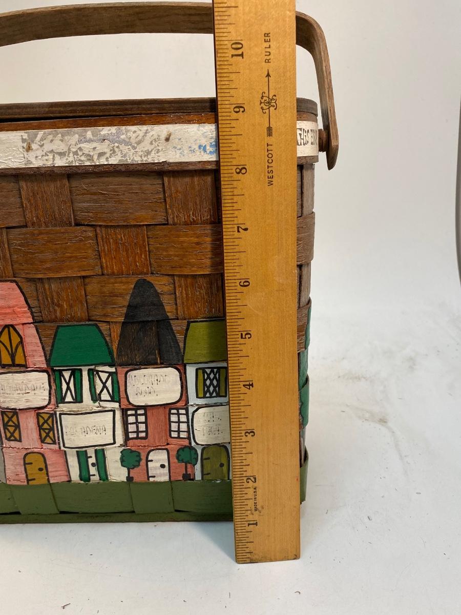 Folk Art Painted Small Picnic Style Basket with Gardening Gloves & Accessories. Cute travel themed folk art. In slightly weathered condition. Comes with some garden gloves, clippers and other items inside.