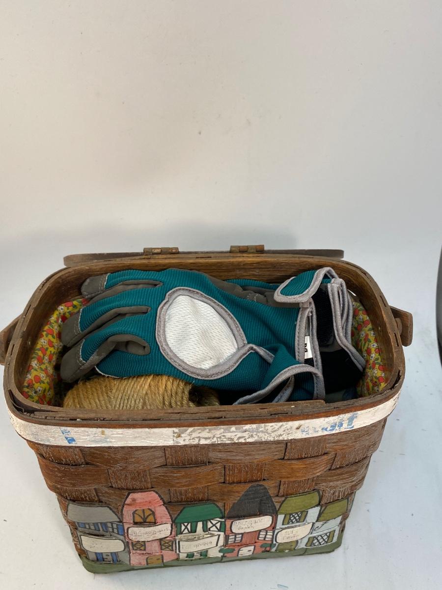 Folk Art Painted Small Picnic Style Basket with Gardening Gloves & Accessories