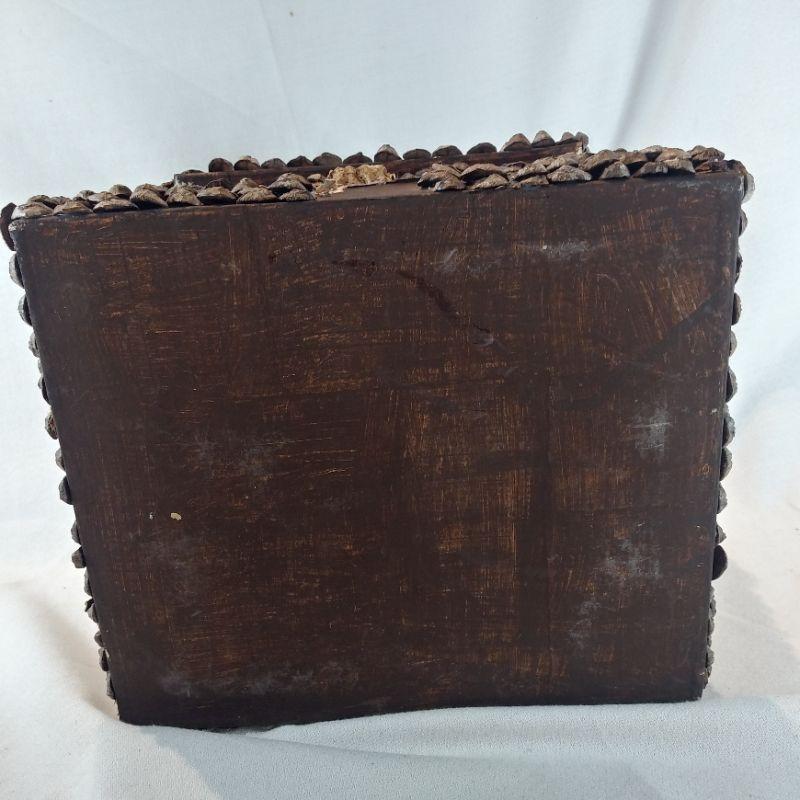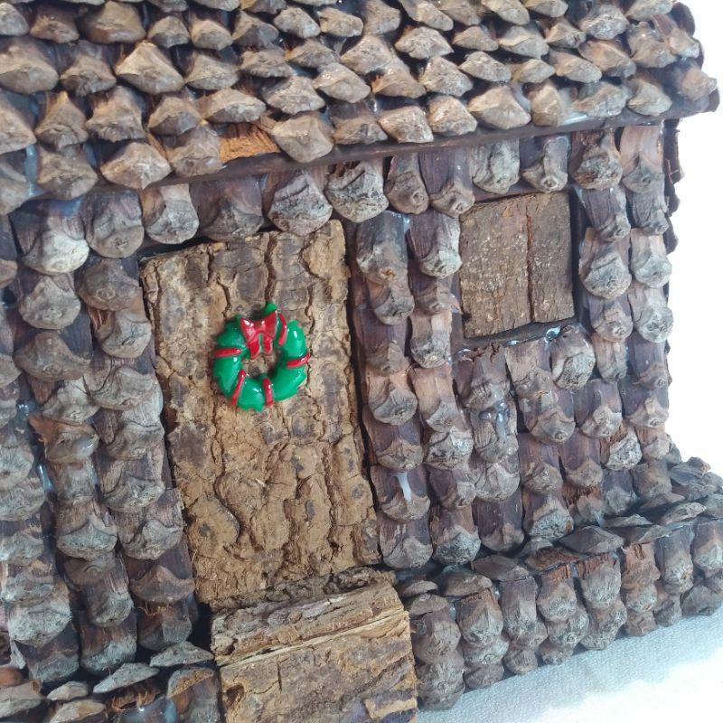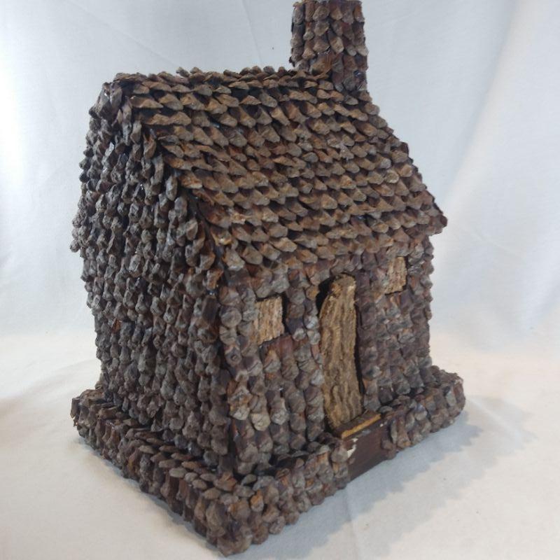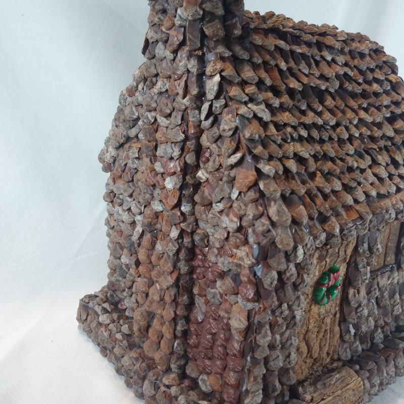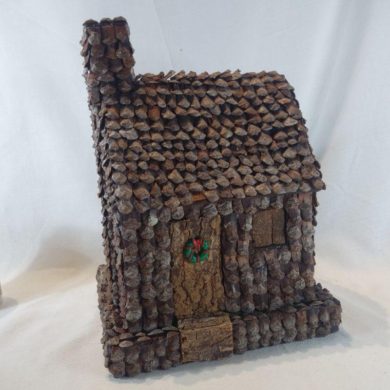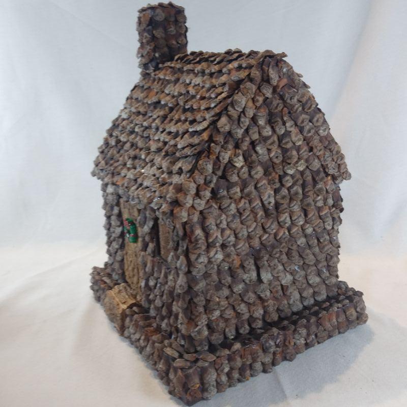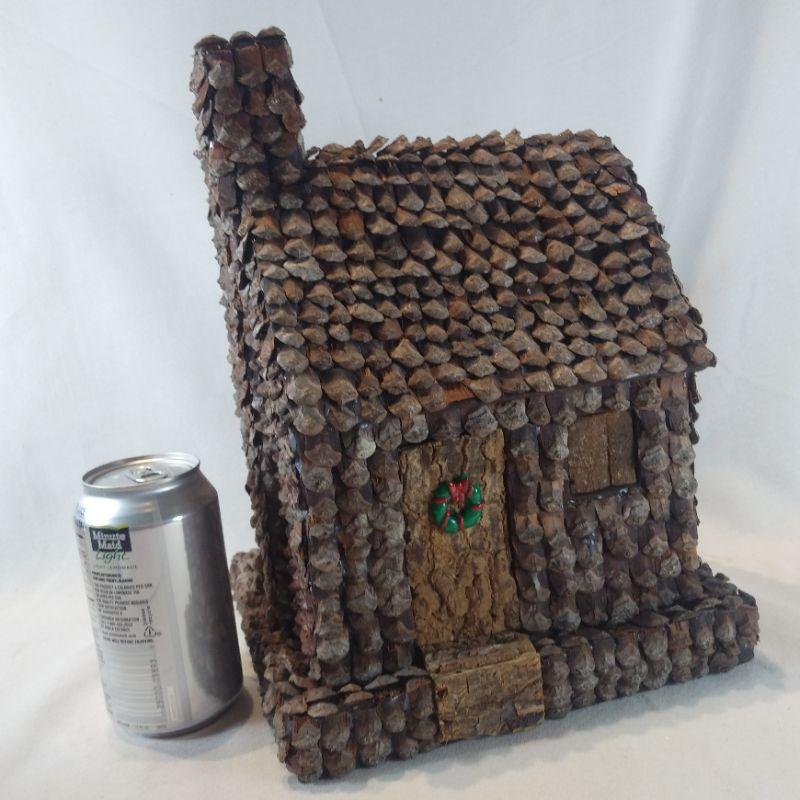 This is an amazing miniature cabin structure hand-crafted from pinecones. We can't believe the amount of work and time it took. It is 12-inches tall X 8-inches deep X 9 1/2-inches wide. So very neat. A wonderful addition to many settings, holiday or otherwise.