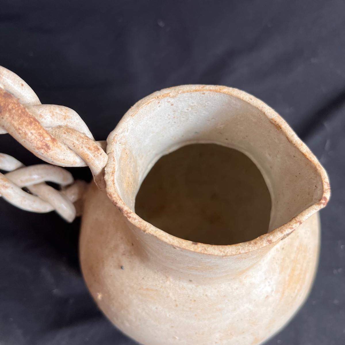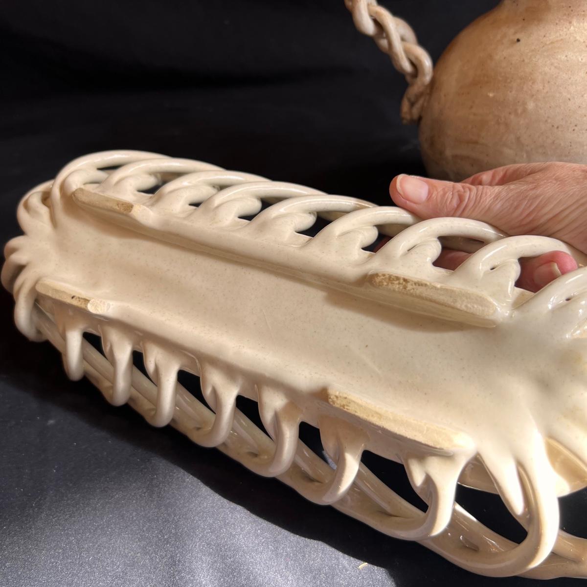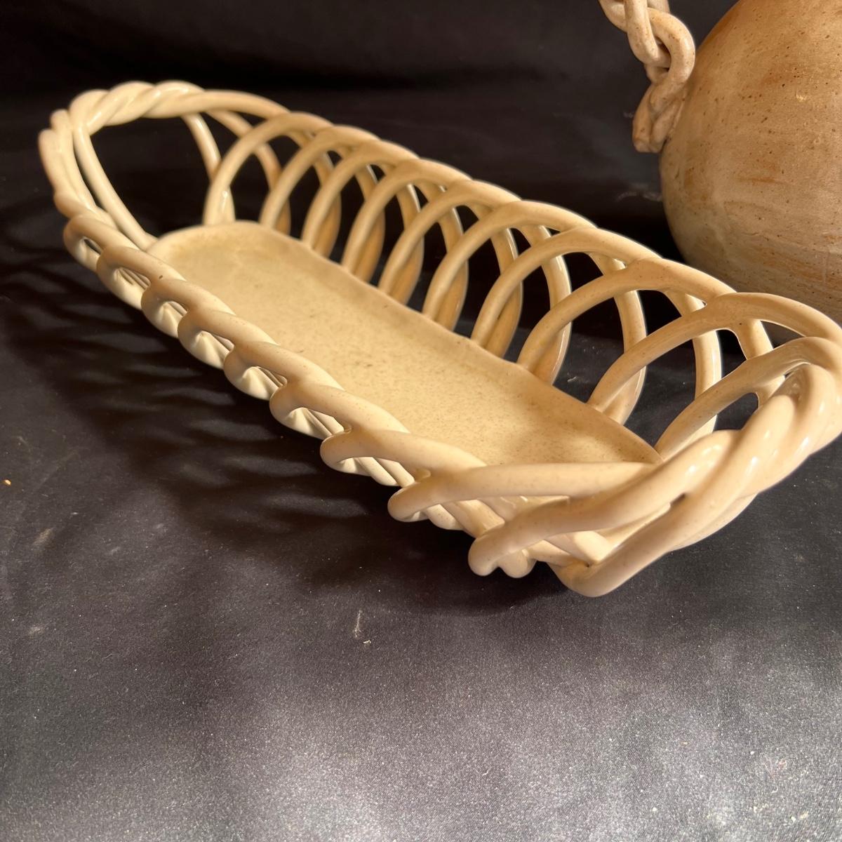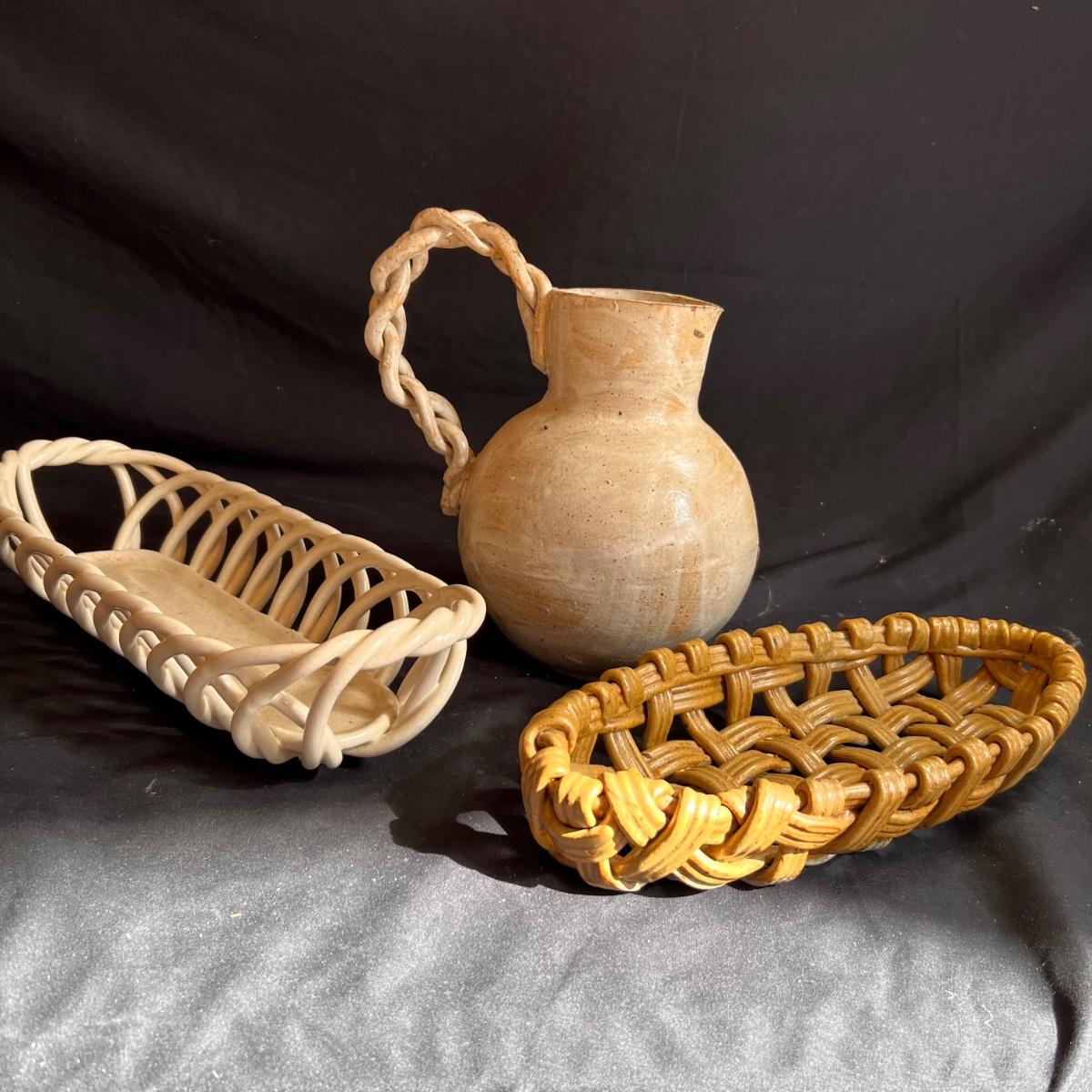 Three pottery items includes a unique folk art jug with a braided handle. One of the two bread baskets has a small chip on the underside which does not affect it and isn’t seen when in place.