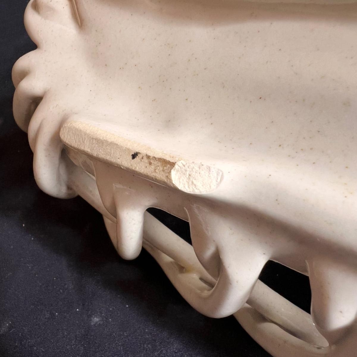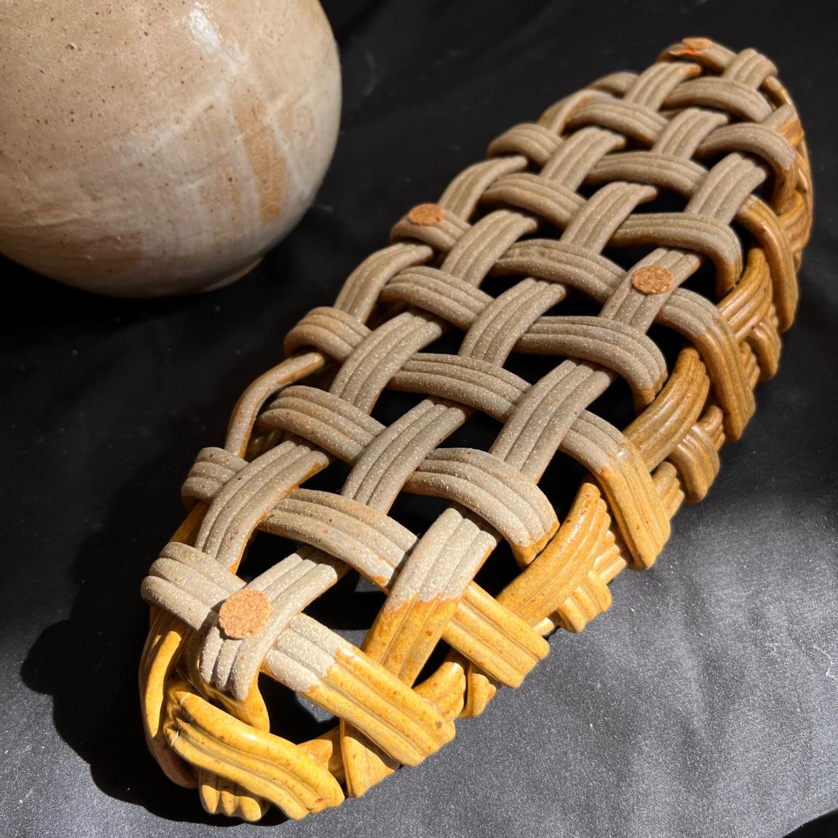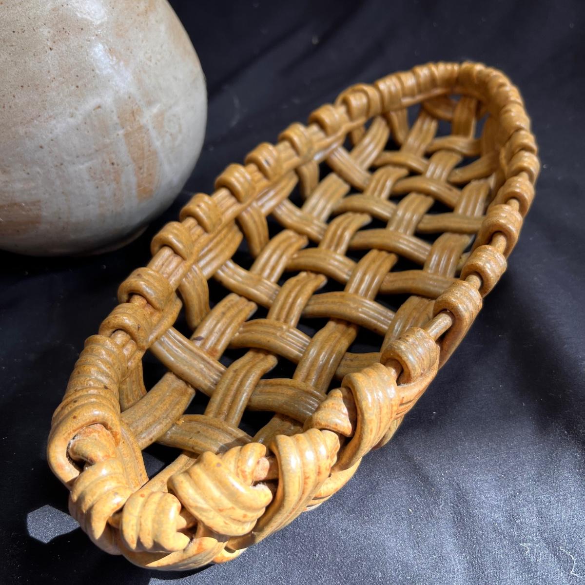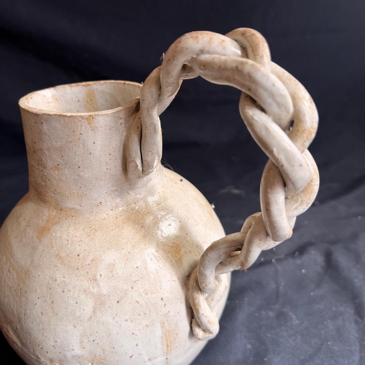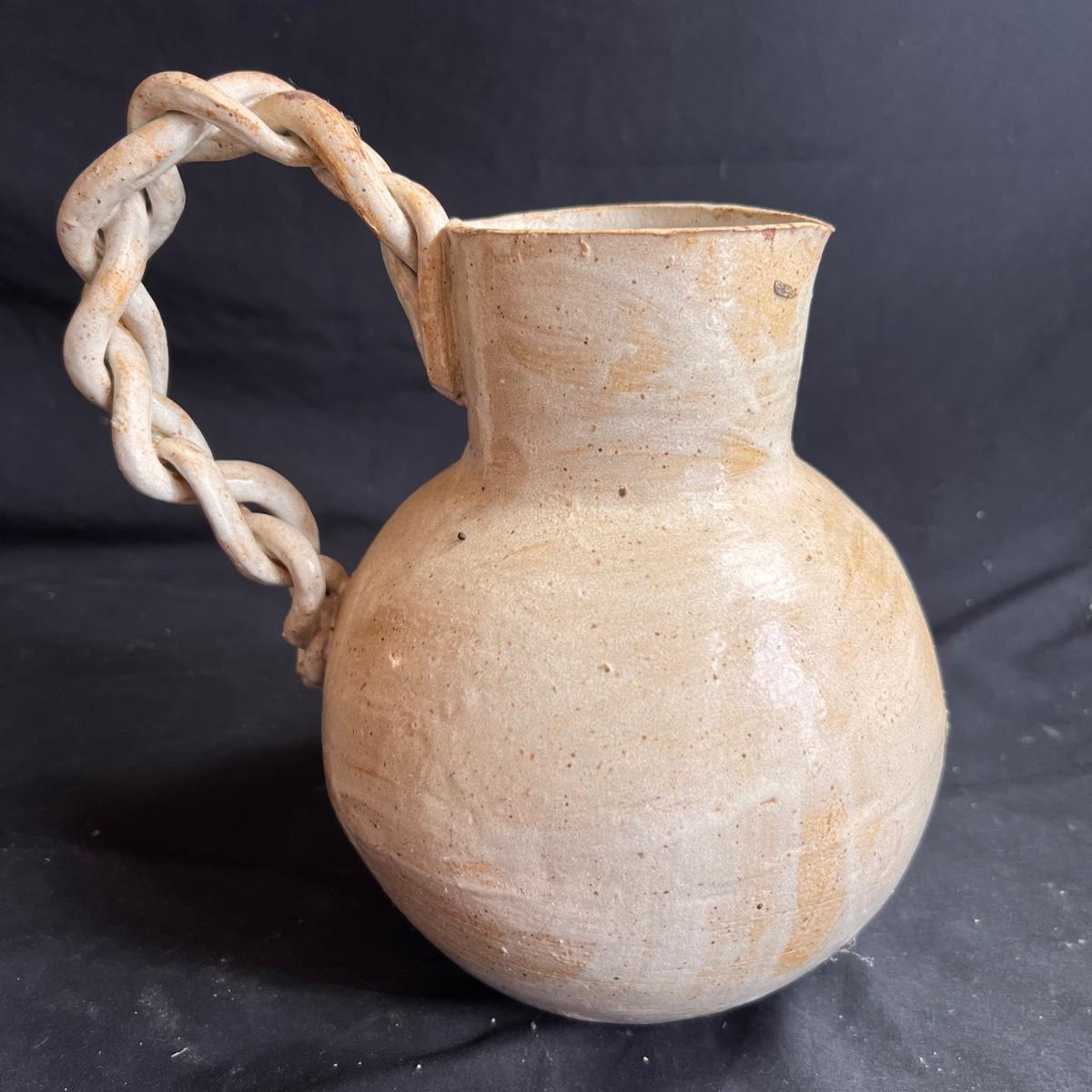 Three pottery items includes a unique folk art jug with a braided handle. One of the two bread baskets has a small chip on the underside which does not affect it and isn’t seen when in place.