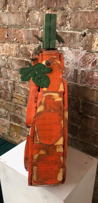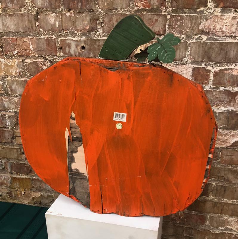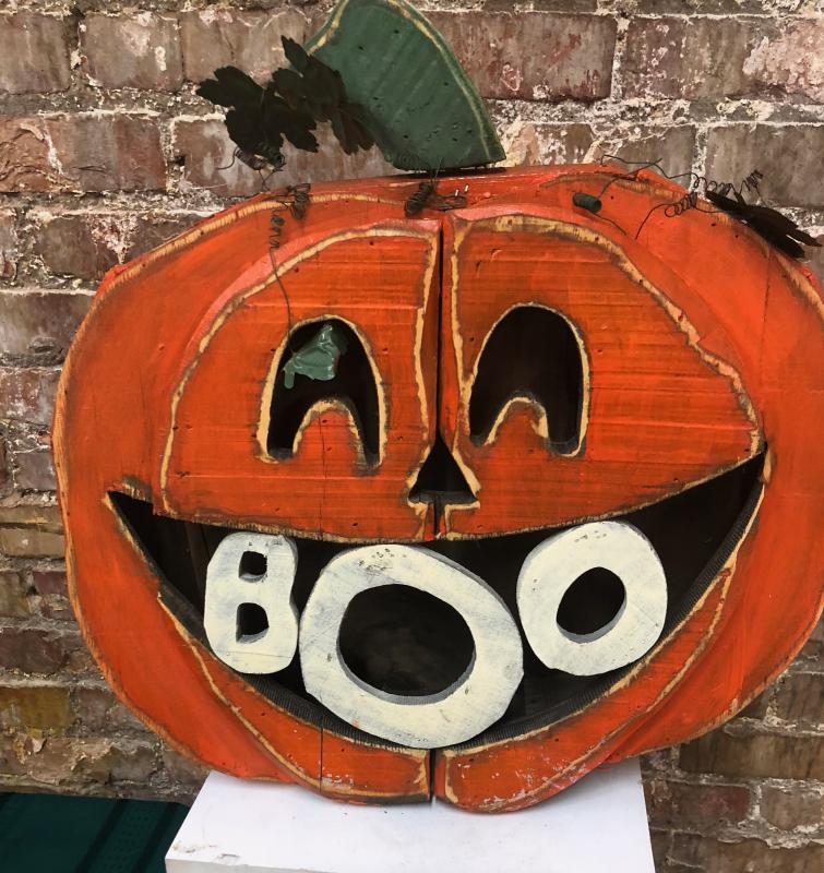 Folk Art style Halloween Pumpkin made of wood...Missing a swatch of painted veneer on back..easily remedied...Otherwise very good condition...Boo! 19"