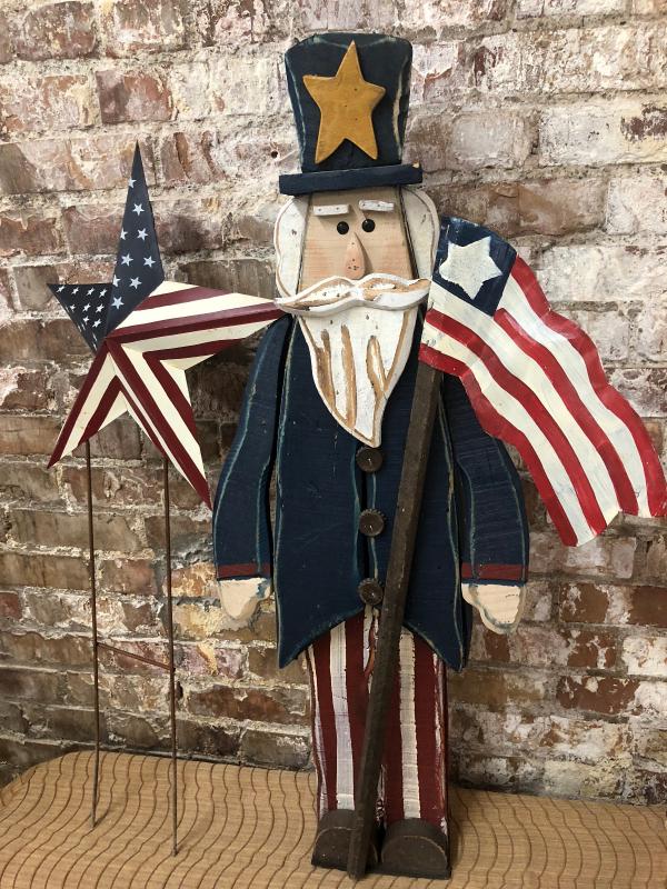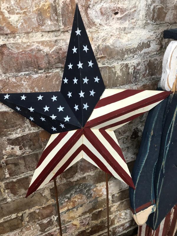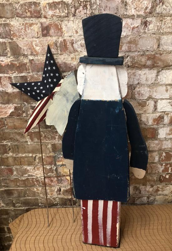 Here is some patriotic yard art constructed out of wood and metal...33" and 35" high...Very good condition..Little sign of use...Perfect for the Fourth of July....