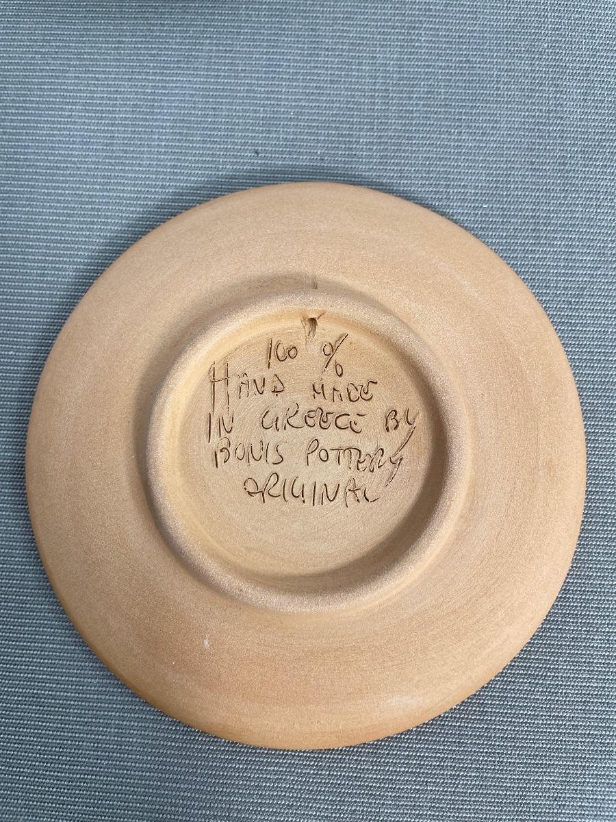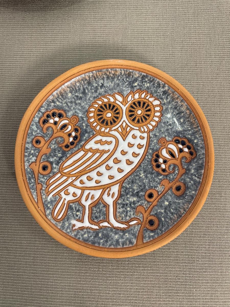 Enameled clay Owl plate is hand made in Greece.
