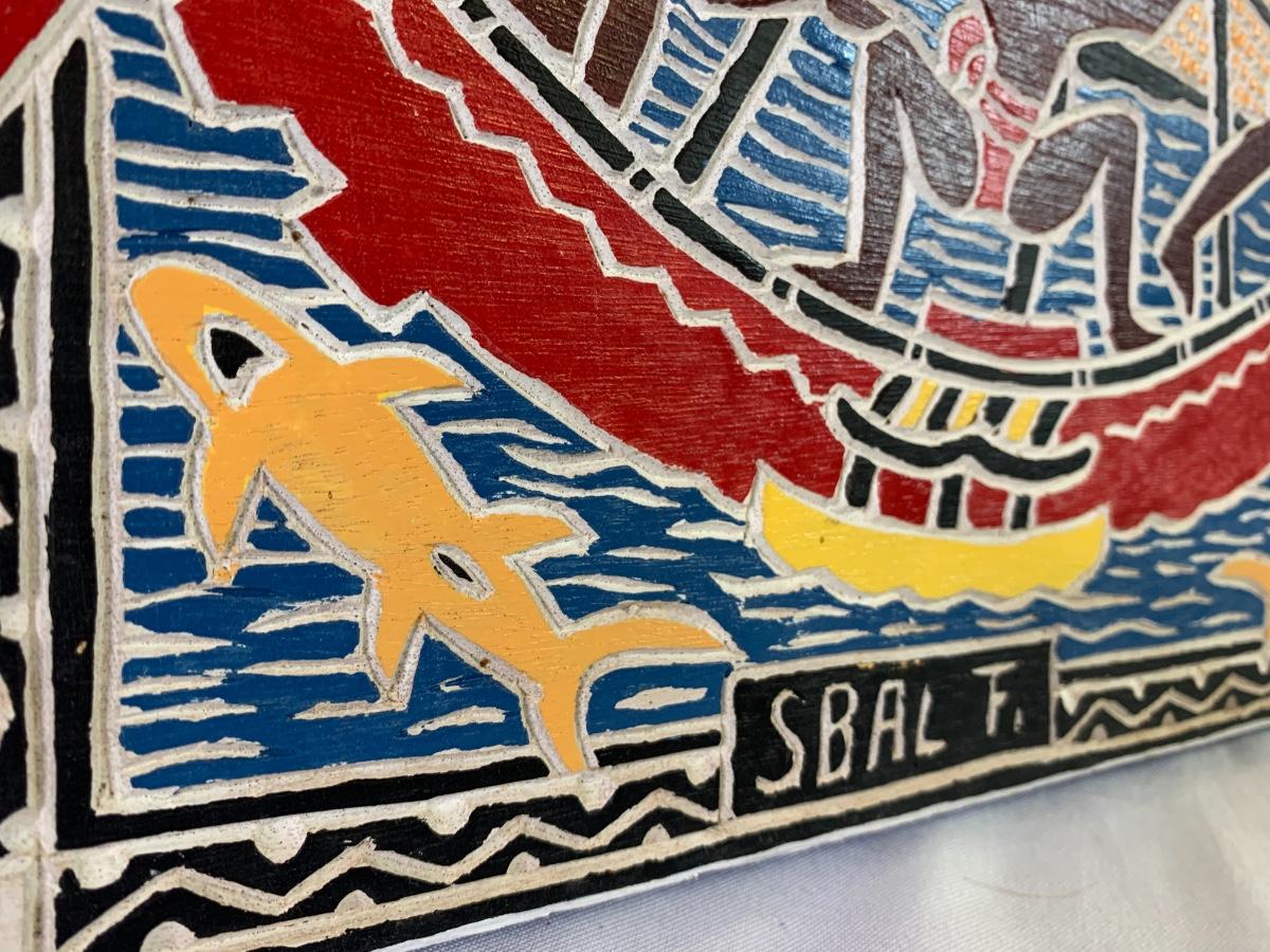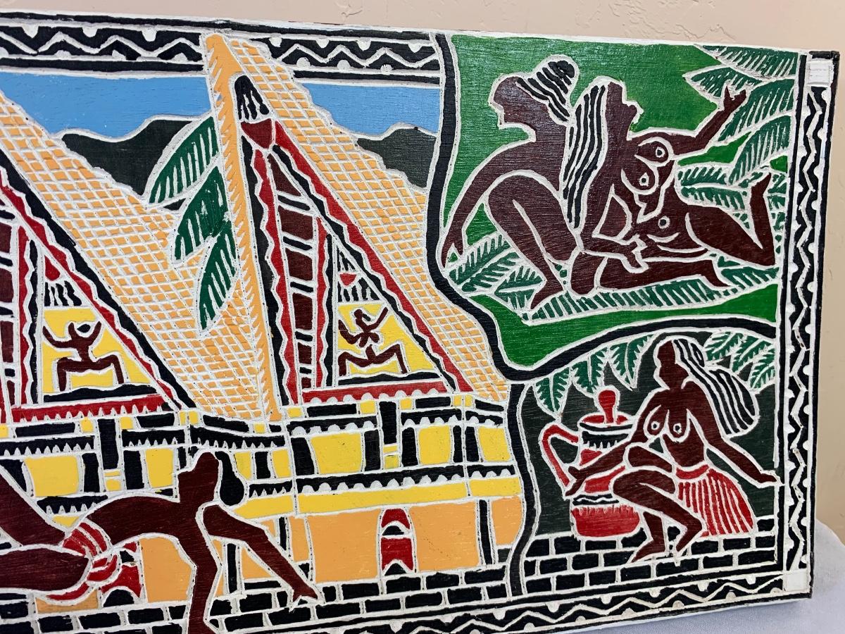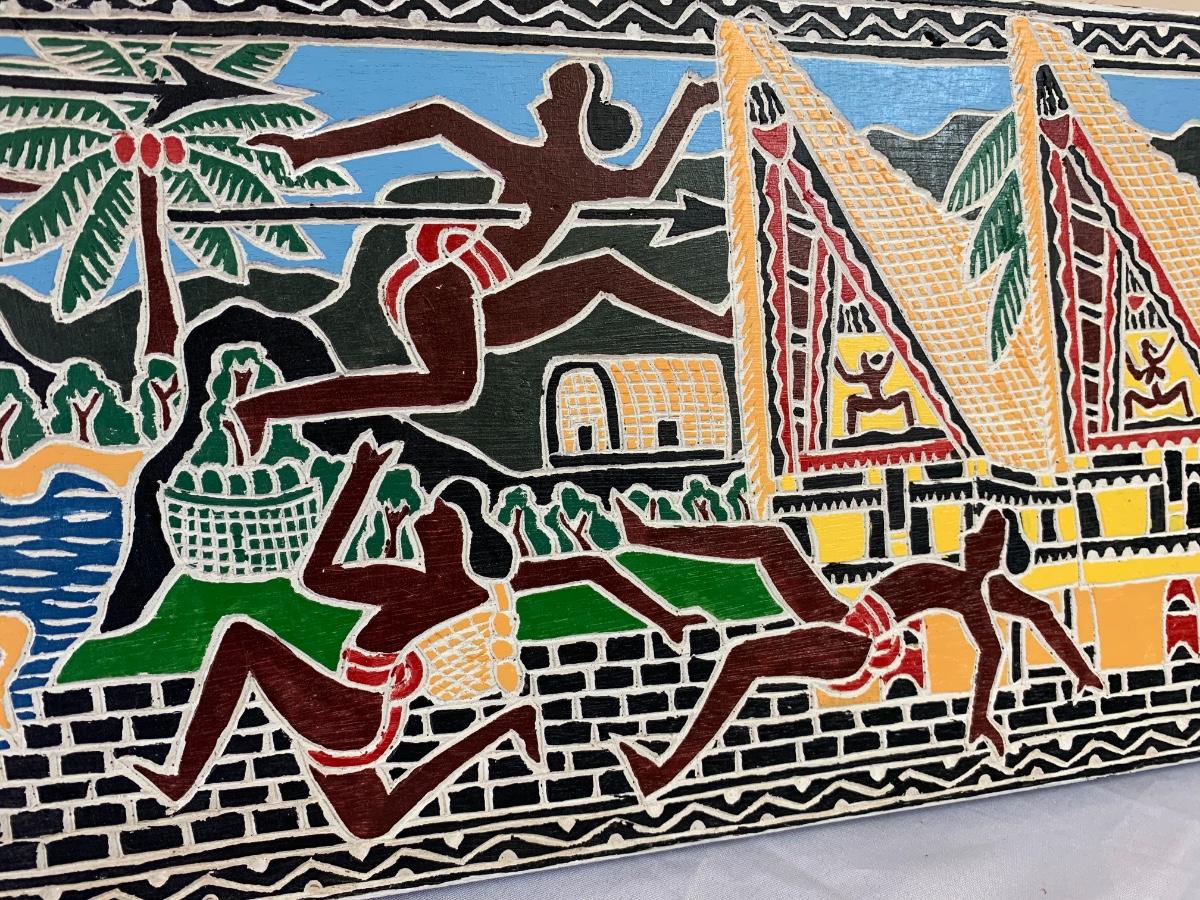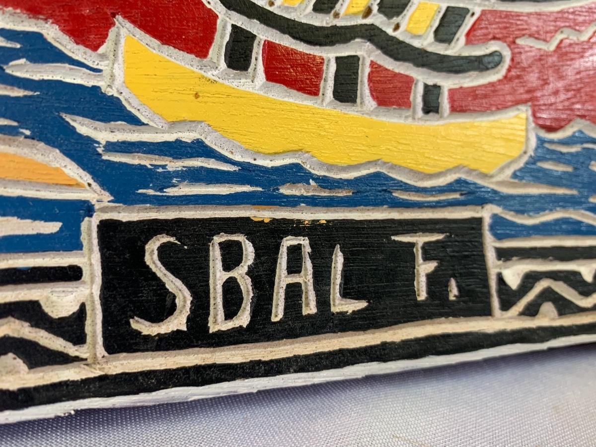 This lot include one long heavy wood carved and painted relief/wall hanging- SBAL F. 3ft 2 in long and 11 in tall and 2 inches thick.