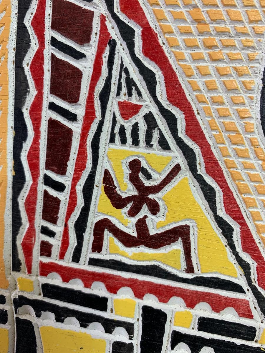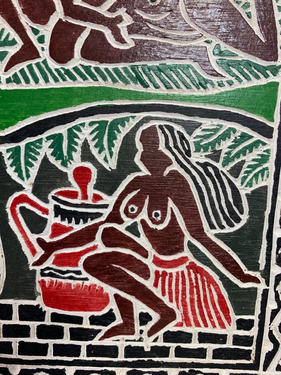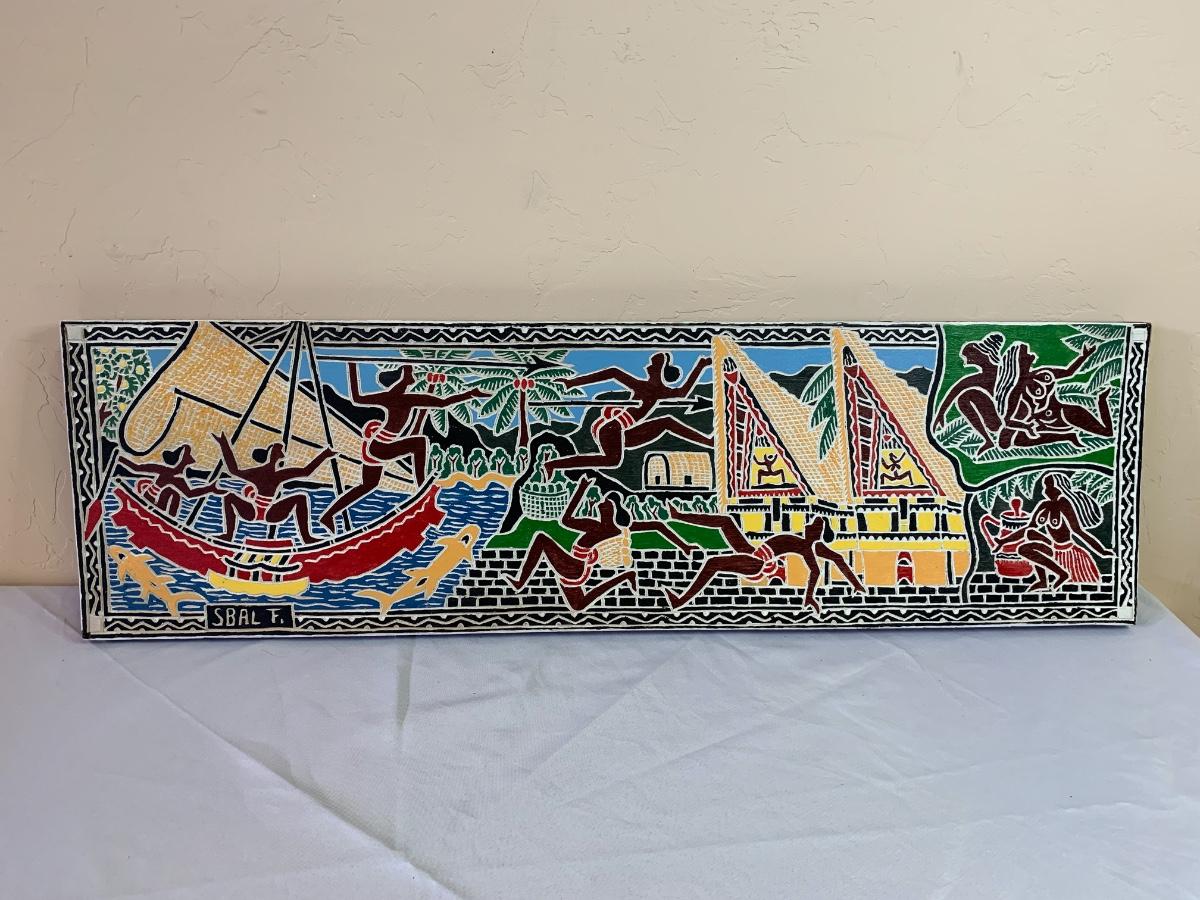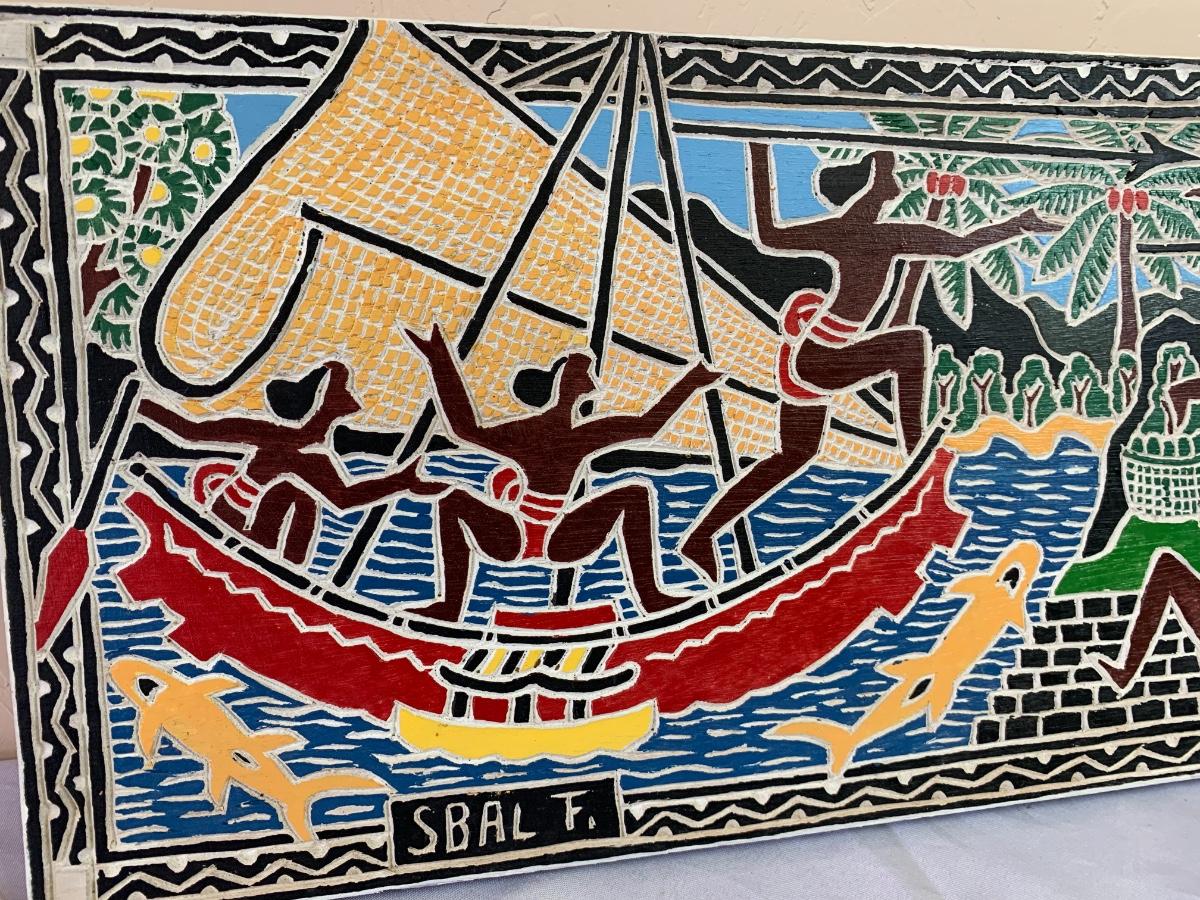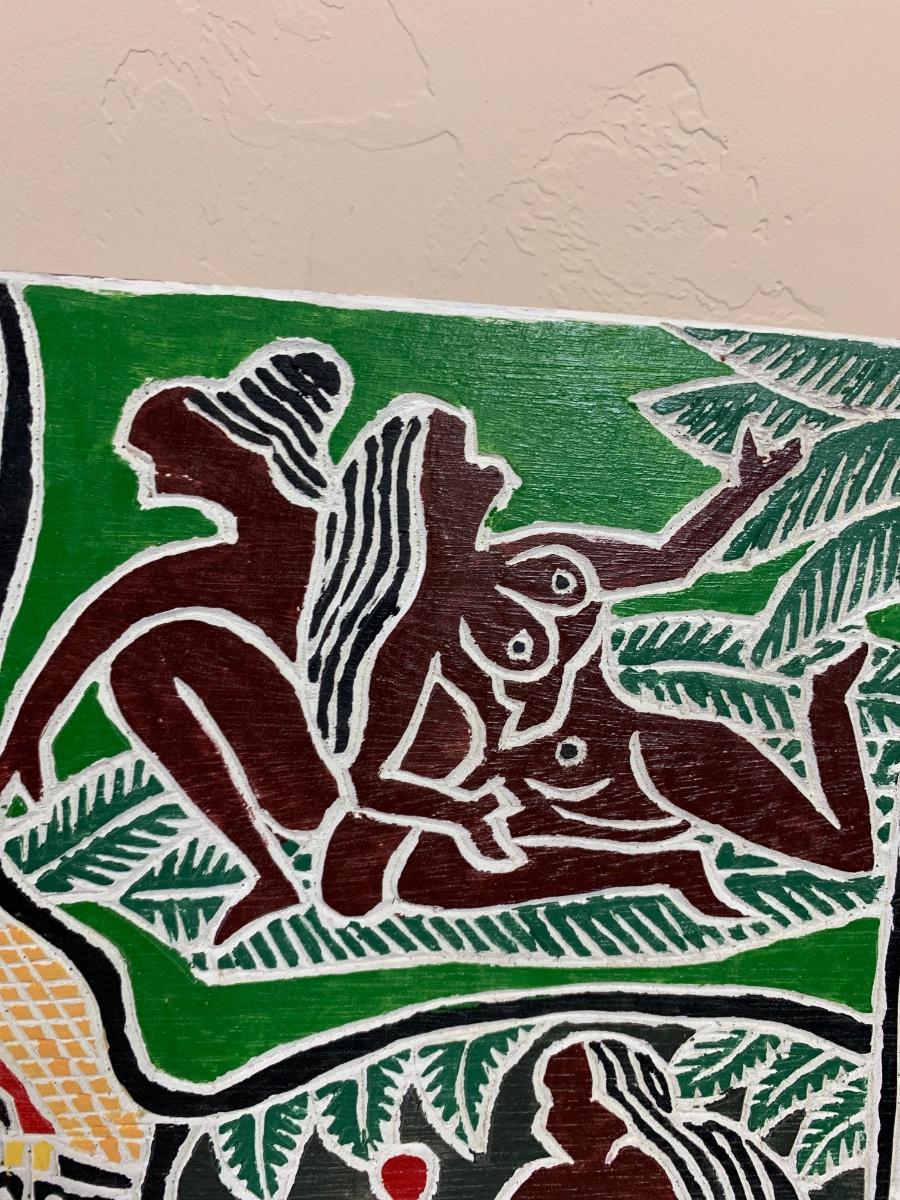 This lot include one long heavy wood carved and painted relief/wall hanging- SBAL F. 3ft 2 in long and 11 in tall and 2 inches thick.