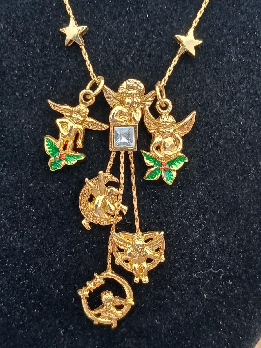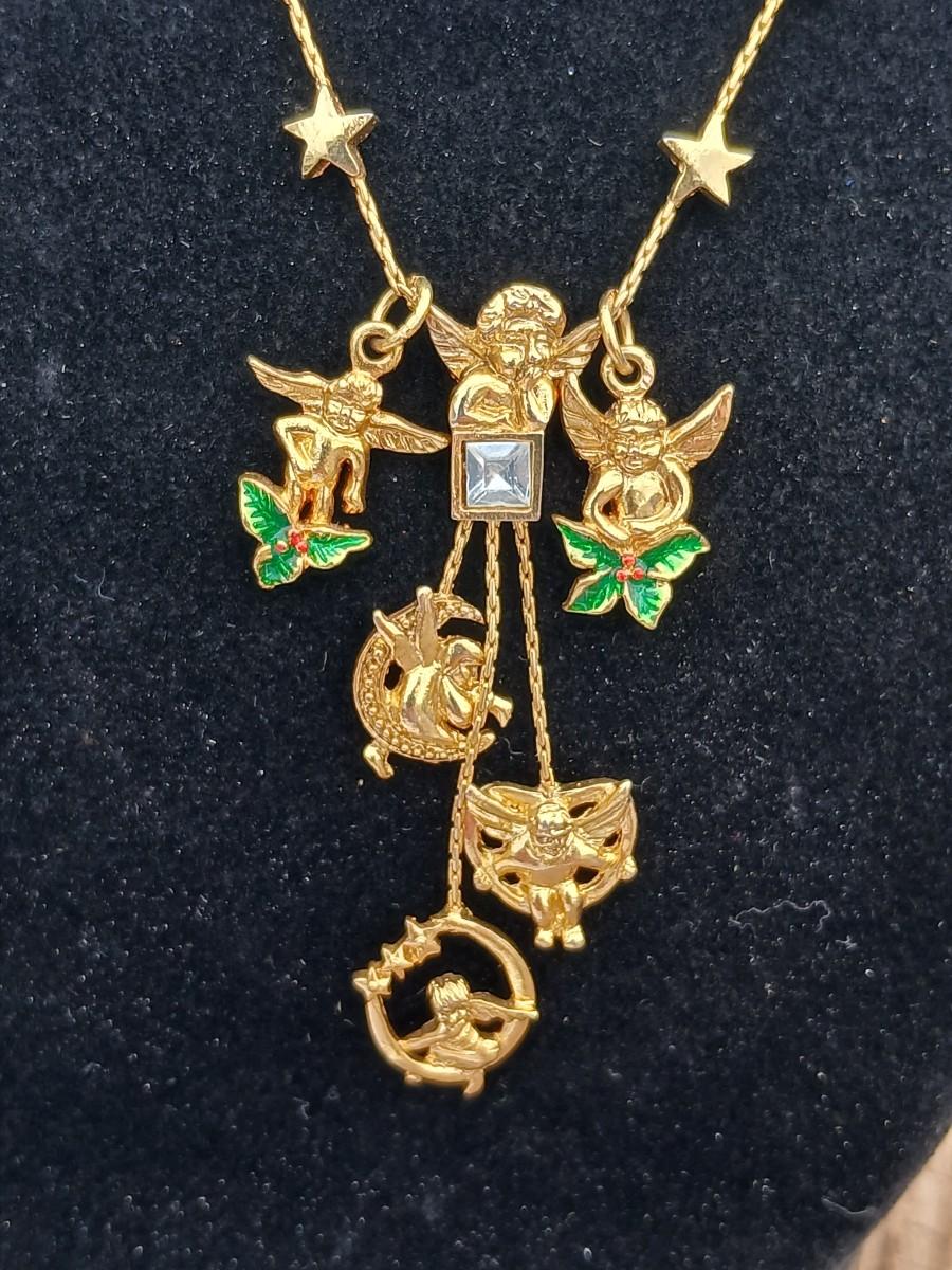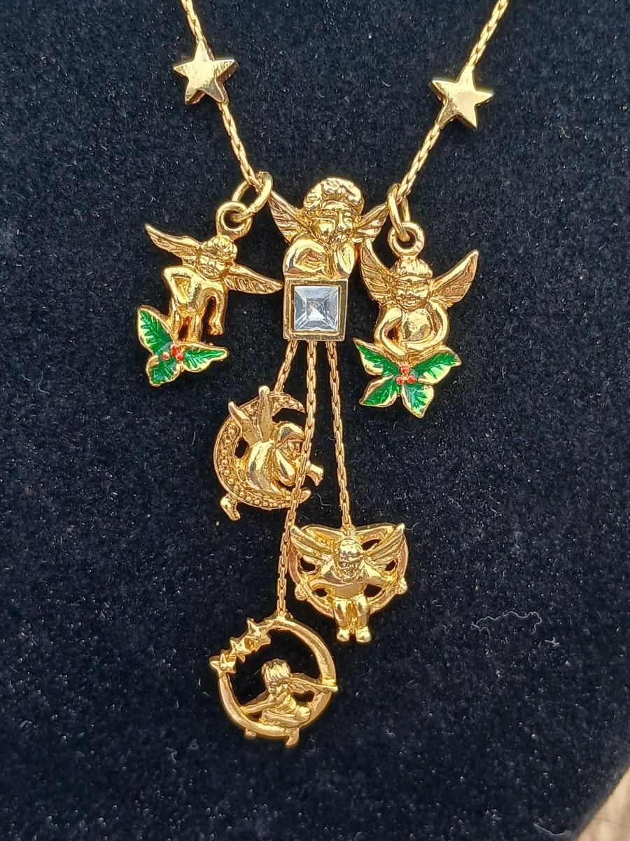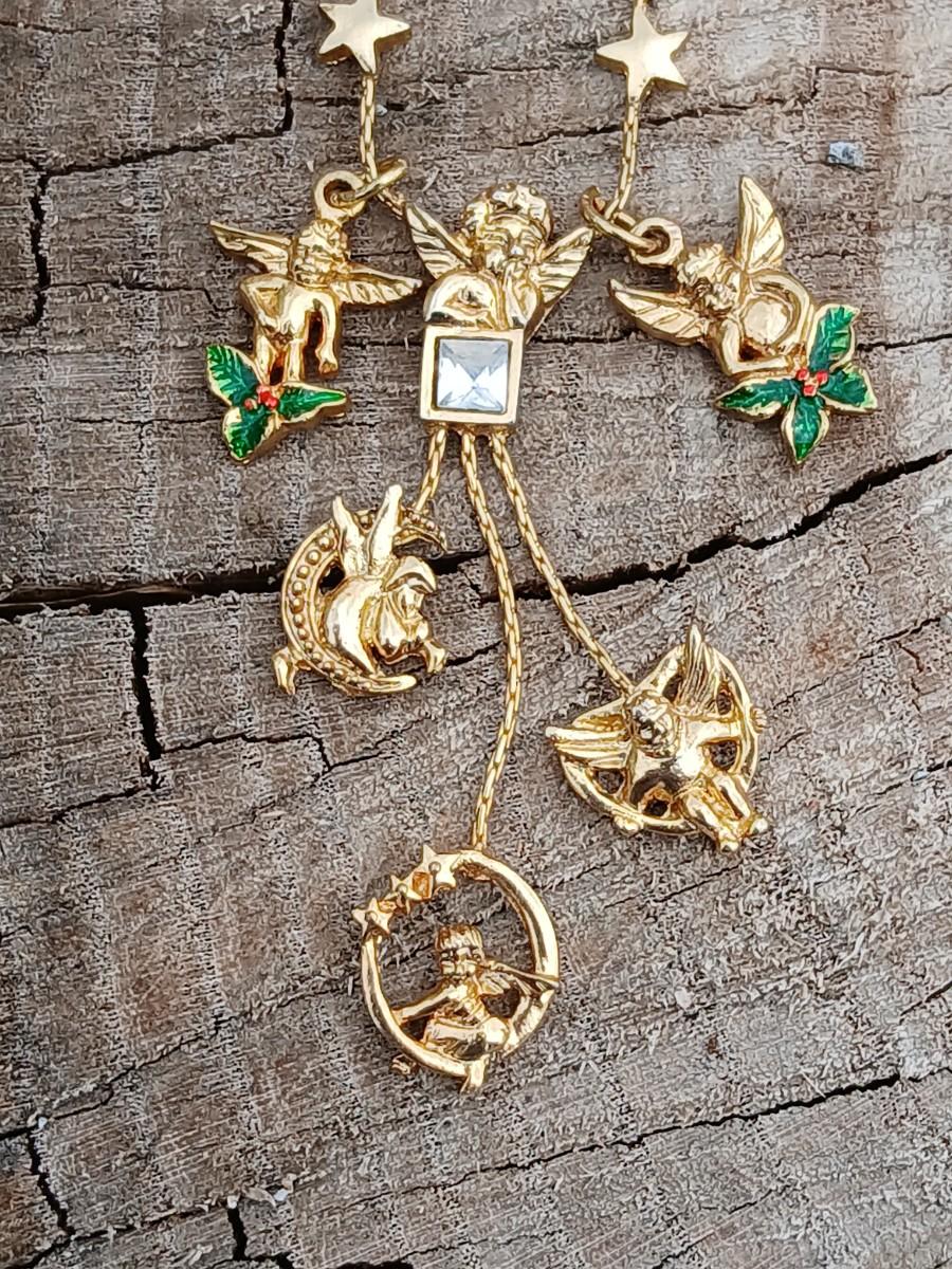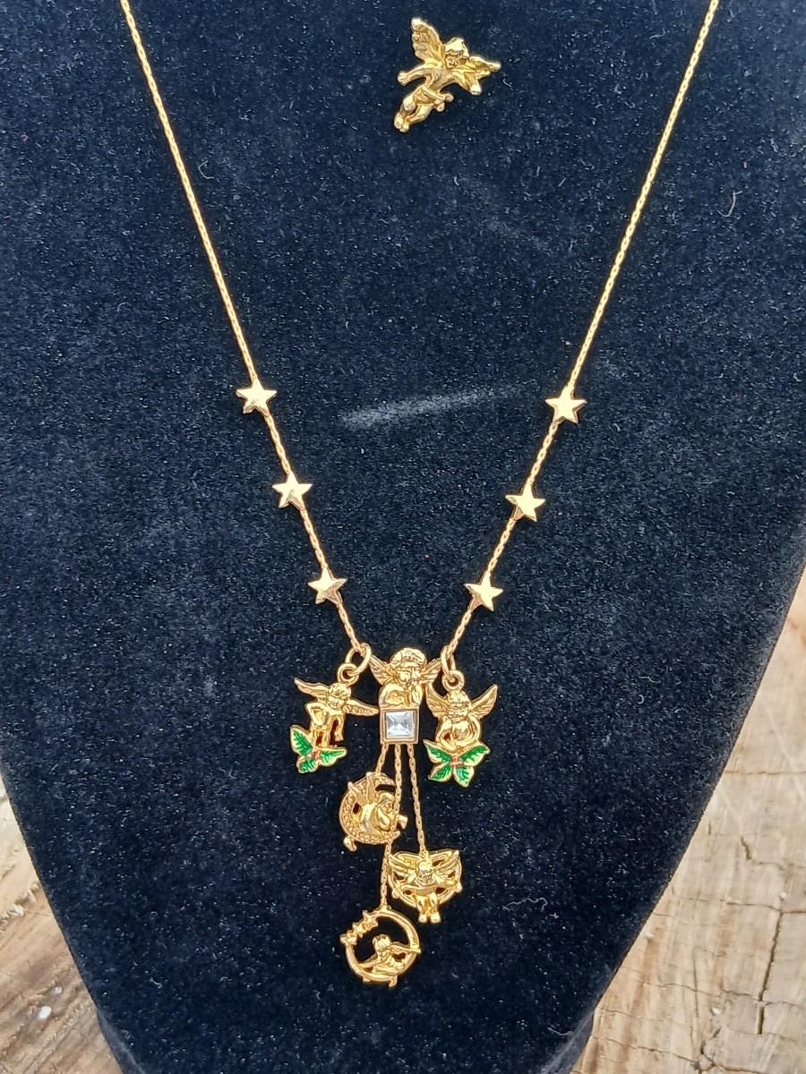 Folly like Cherub moon & stars Dangle / Charm necklace with gemstone like center - unsigned with angel pin