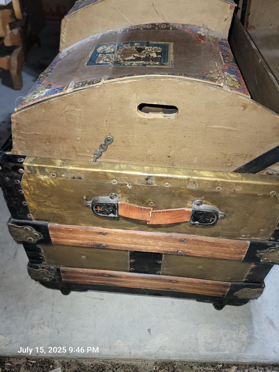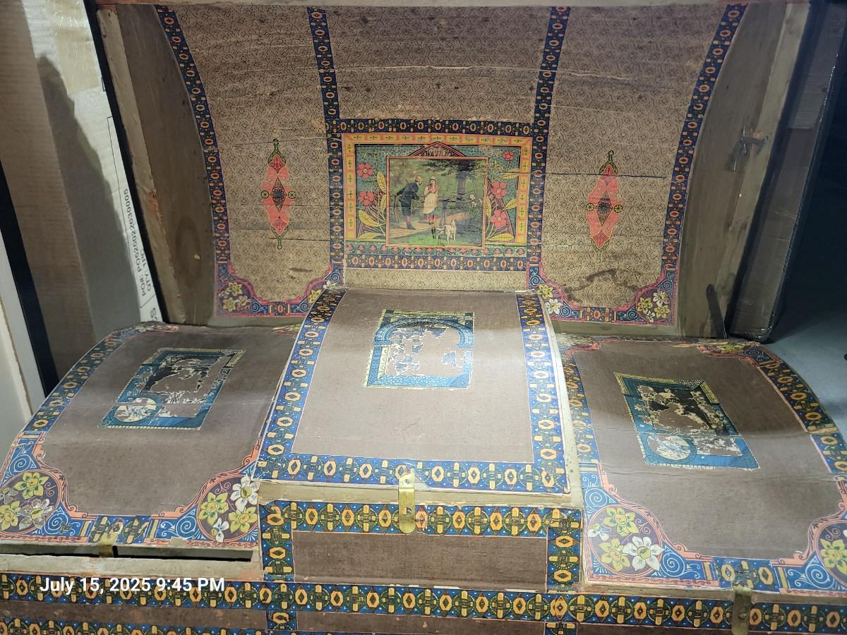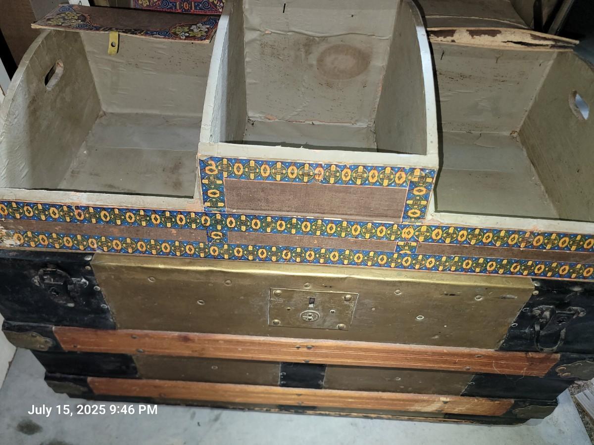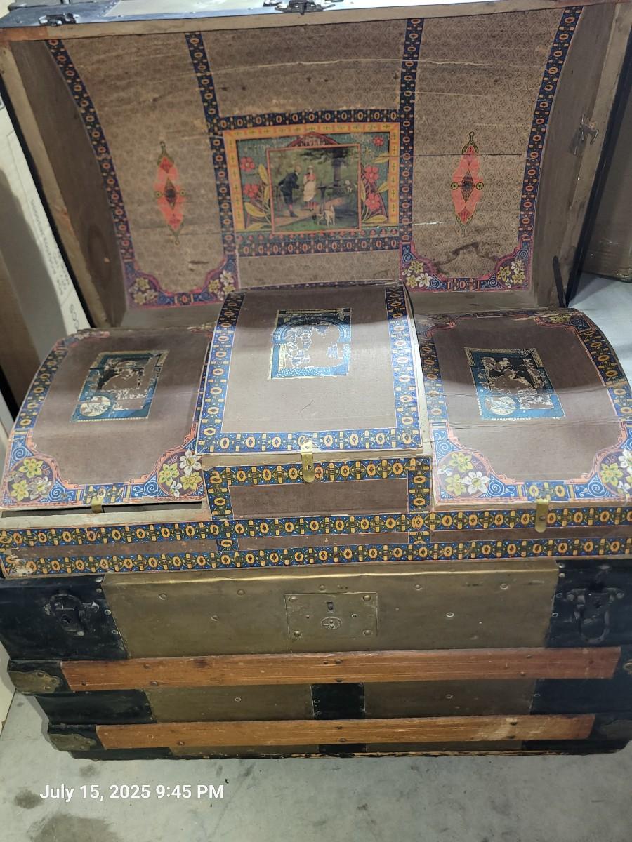 This was probably called a wall trunk instead of a steamer trunk because it opens and the lid stays upright for tighter spqces like trains. Probably manufactured in 1880-1890s, amazing good shape, wheeled, leather straps are broken amd the hinges on yhe interior cases are not in great shape but it smells fine and no water damage visabke