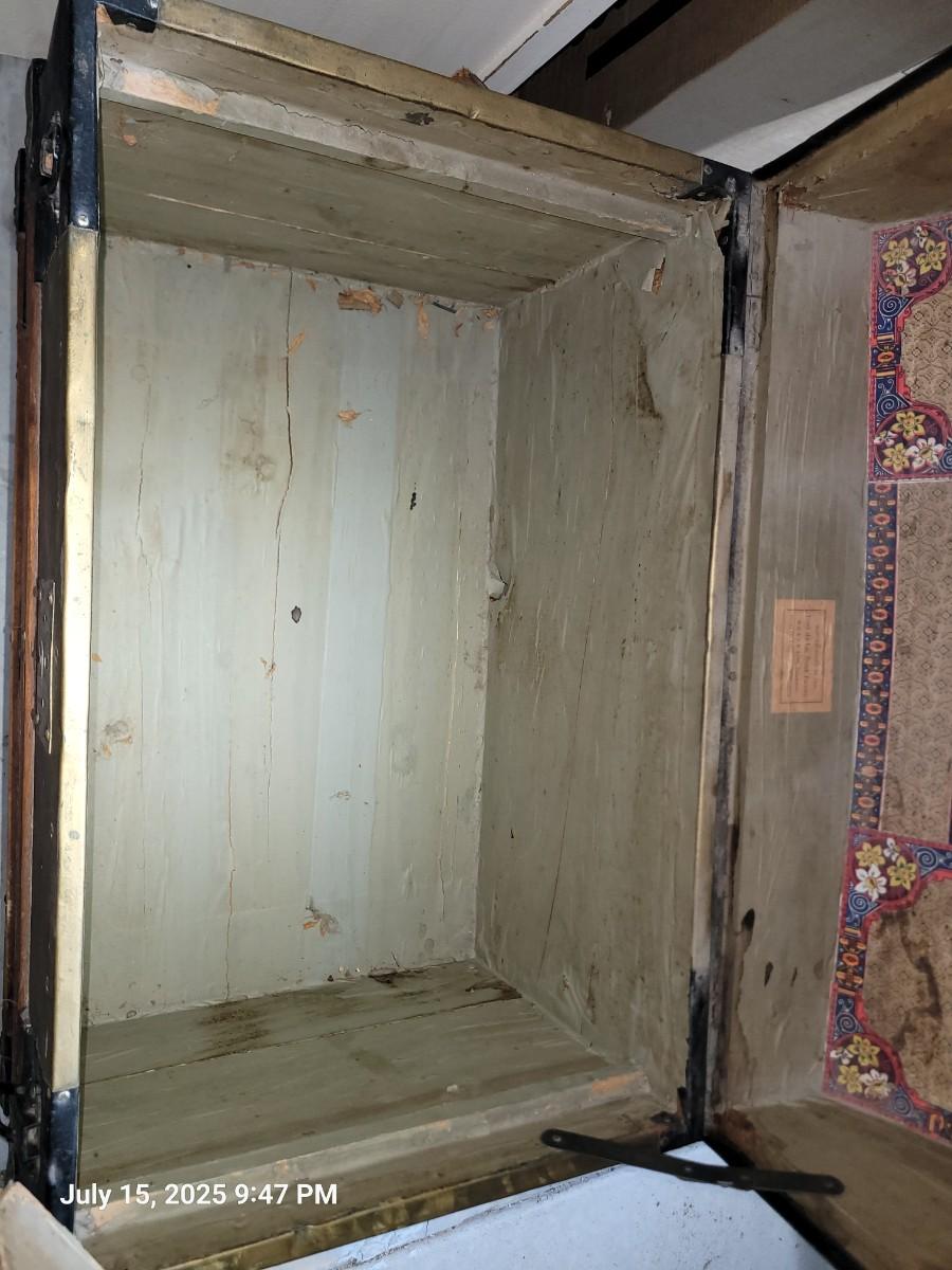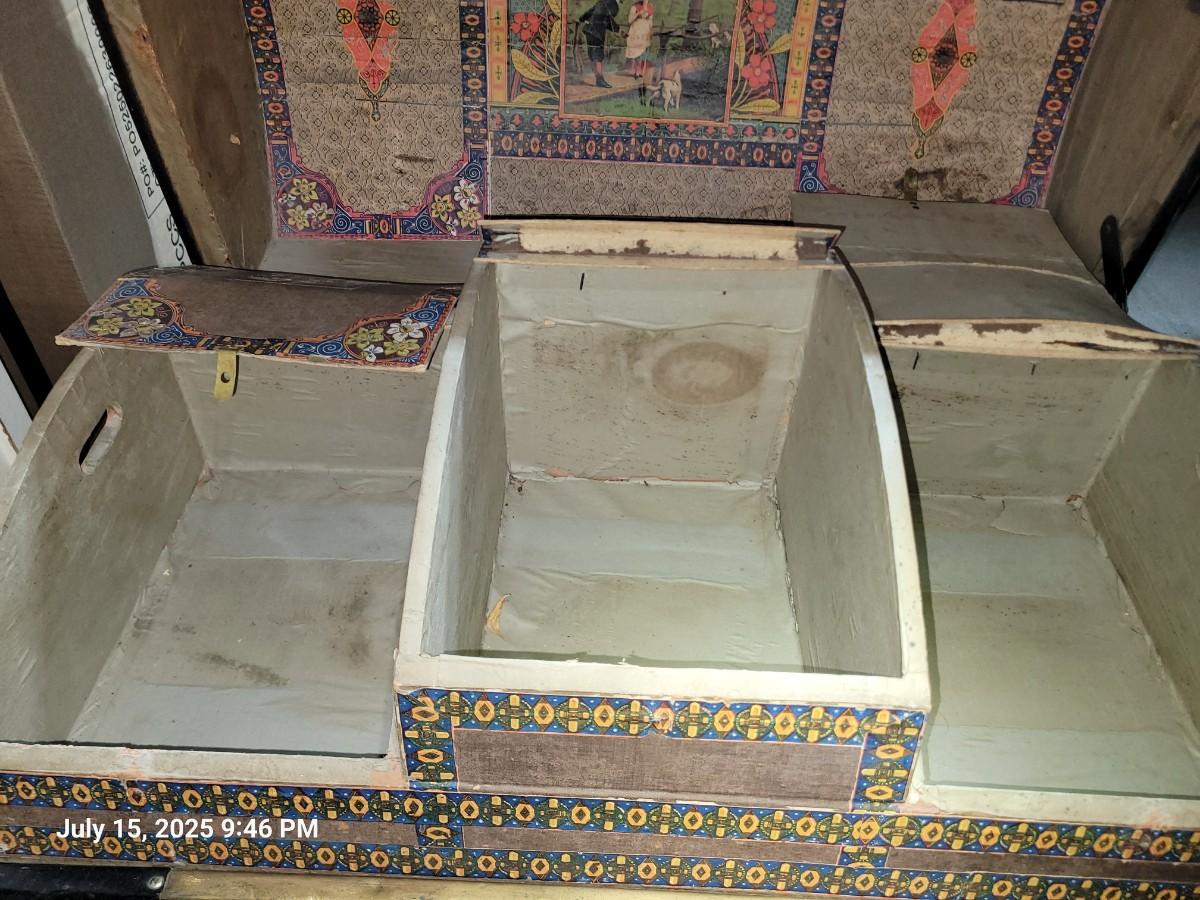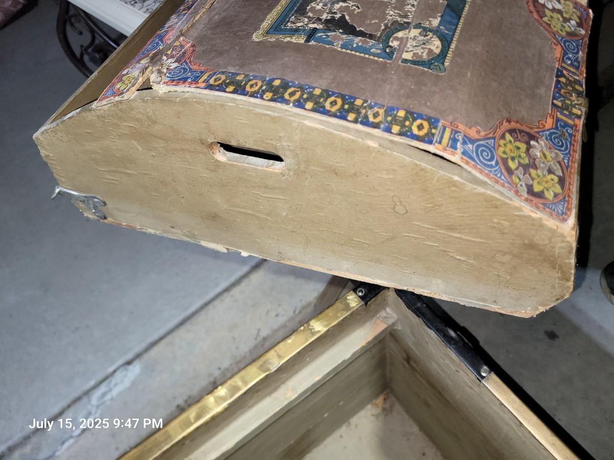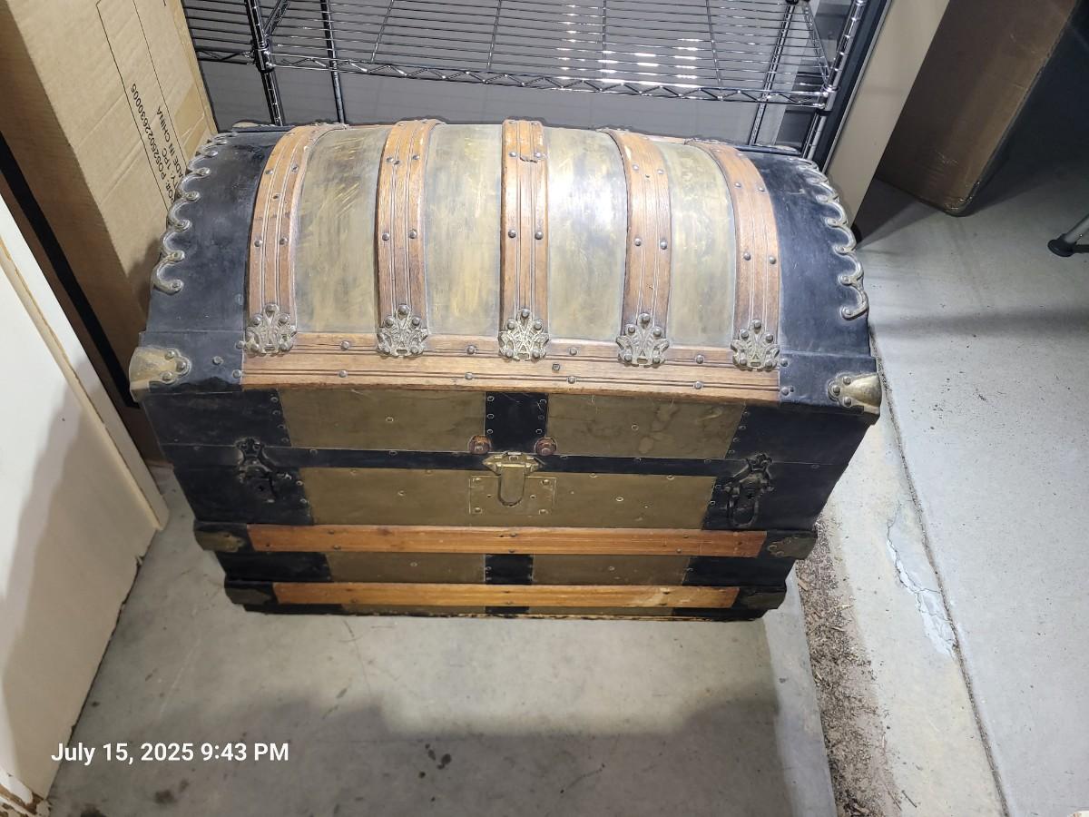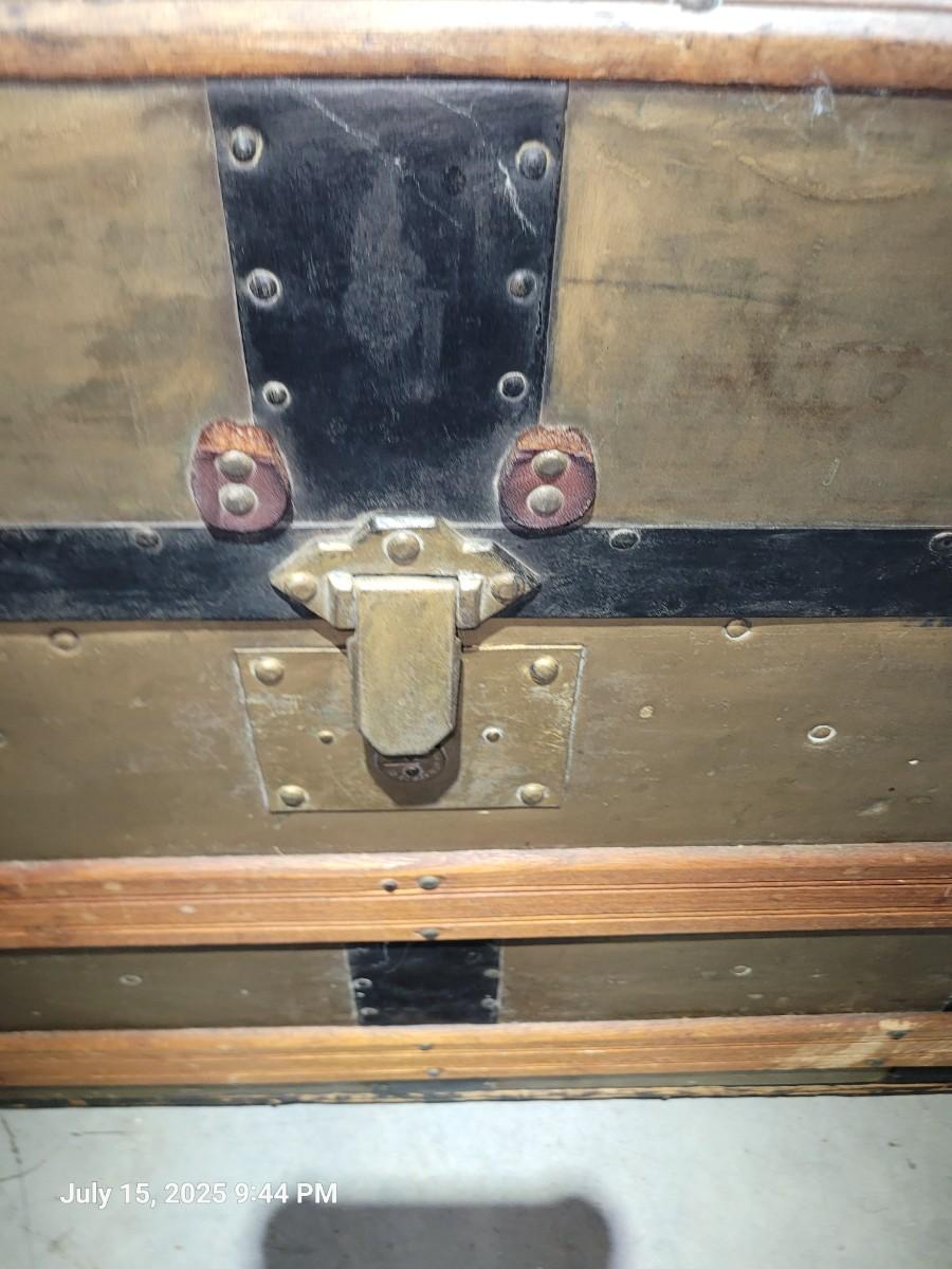 This was probably called a wall trunk instead of a steamer trunk because it opens and the lid stays upright for tighter spqces like trains. Probably manufactured in 1880-1890s, amazing good shape, wheeled, leather straps are broken amd the hinges on yhe interior cases are not in great shape but it smells fine and no water damage visabke