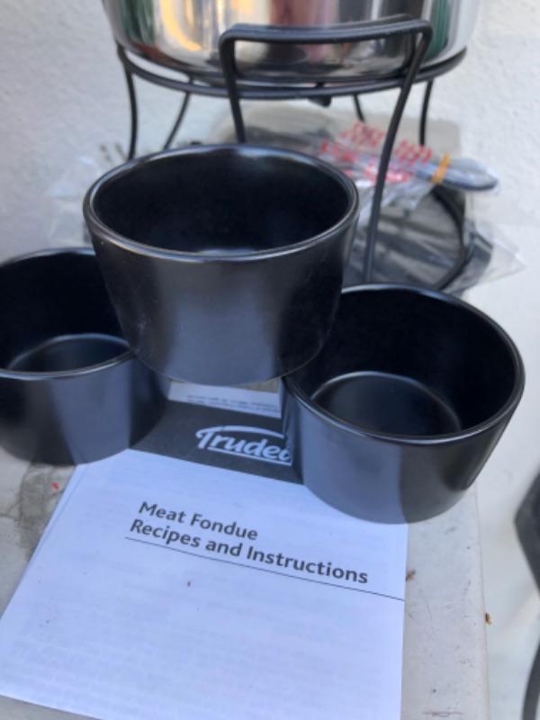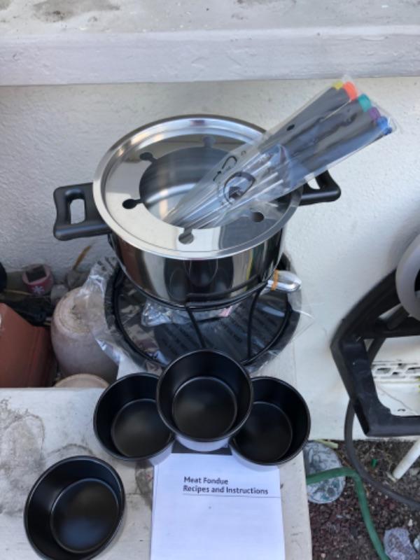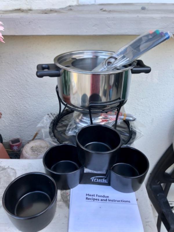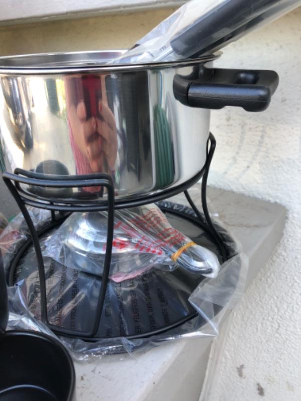 Stainless Steel fondue pot with 4 forks and 4 bowls, plus pot stand