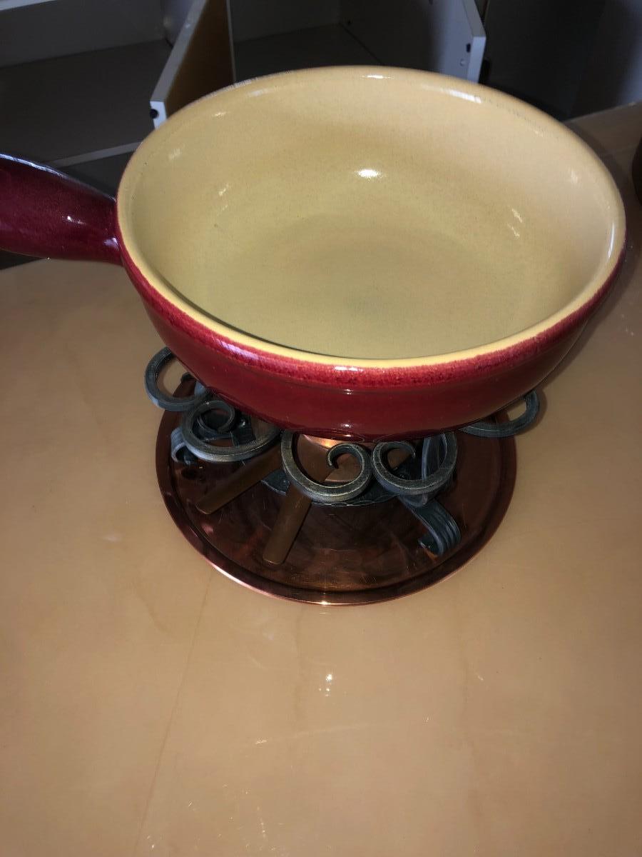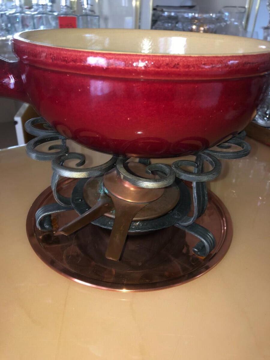 Red ceramic fondue pot over copper and brushed metal. Also includes 1 set of vintage skewers in like new condition.