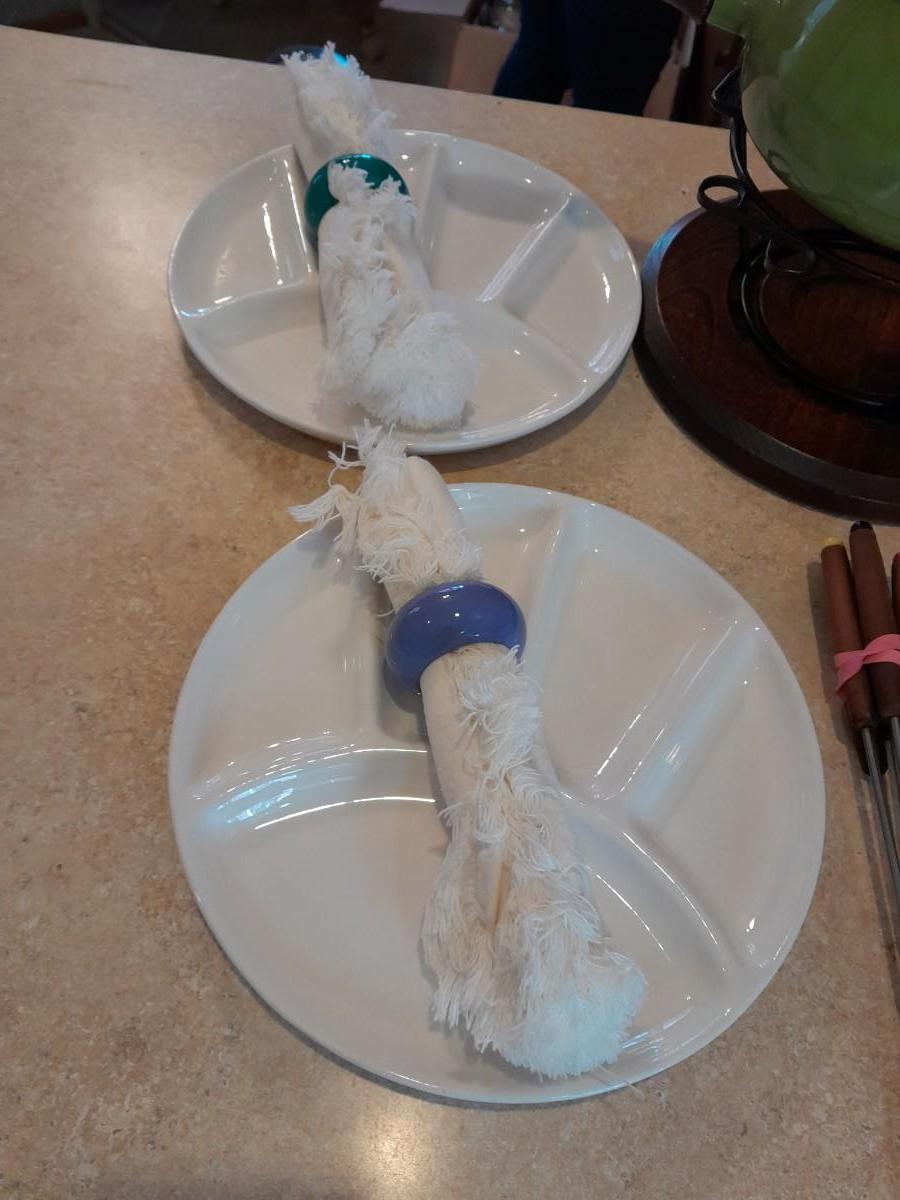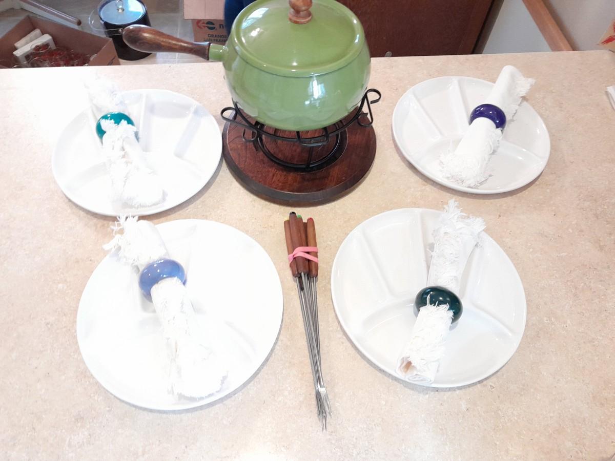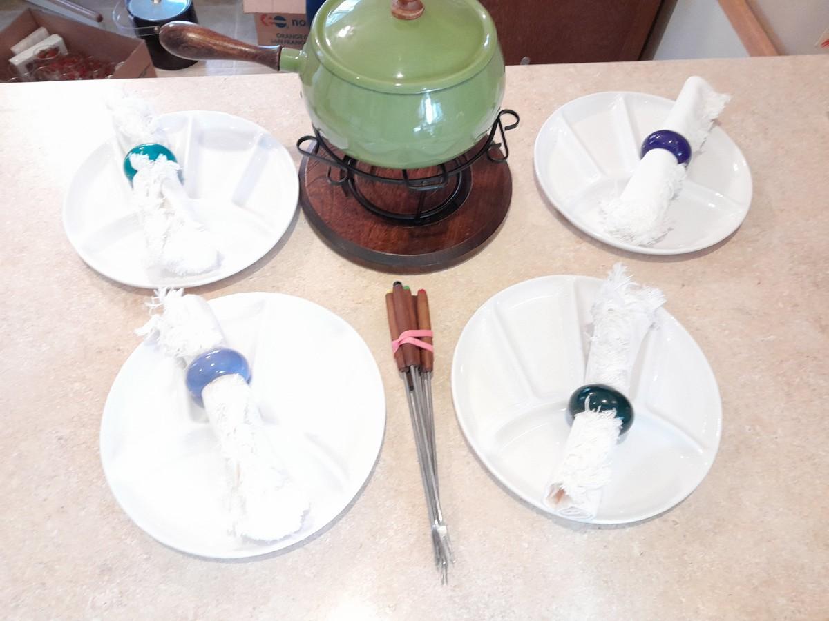 FONDUE POT WITH 4 CERAMIC LIKE SERVING PLATES AND CLOTH NAPKINS IN RINGS