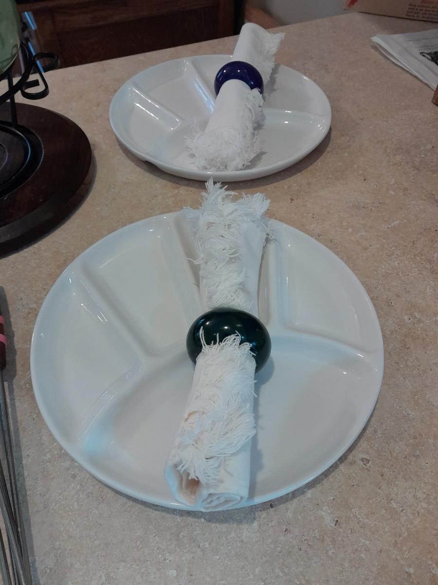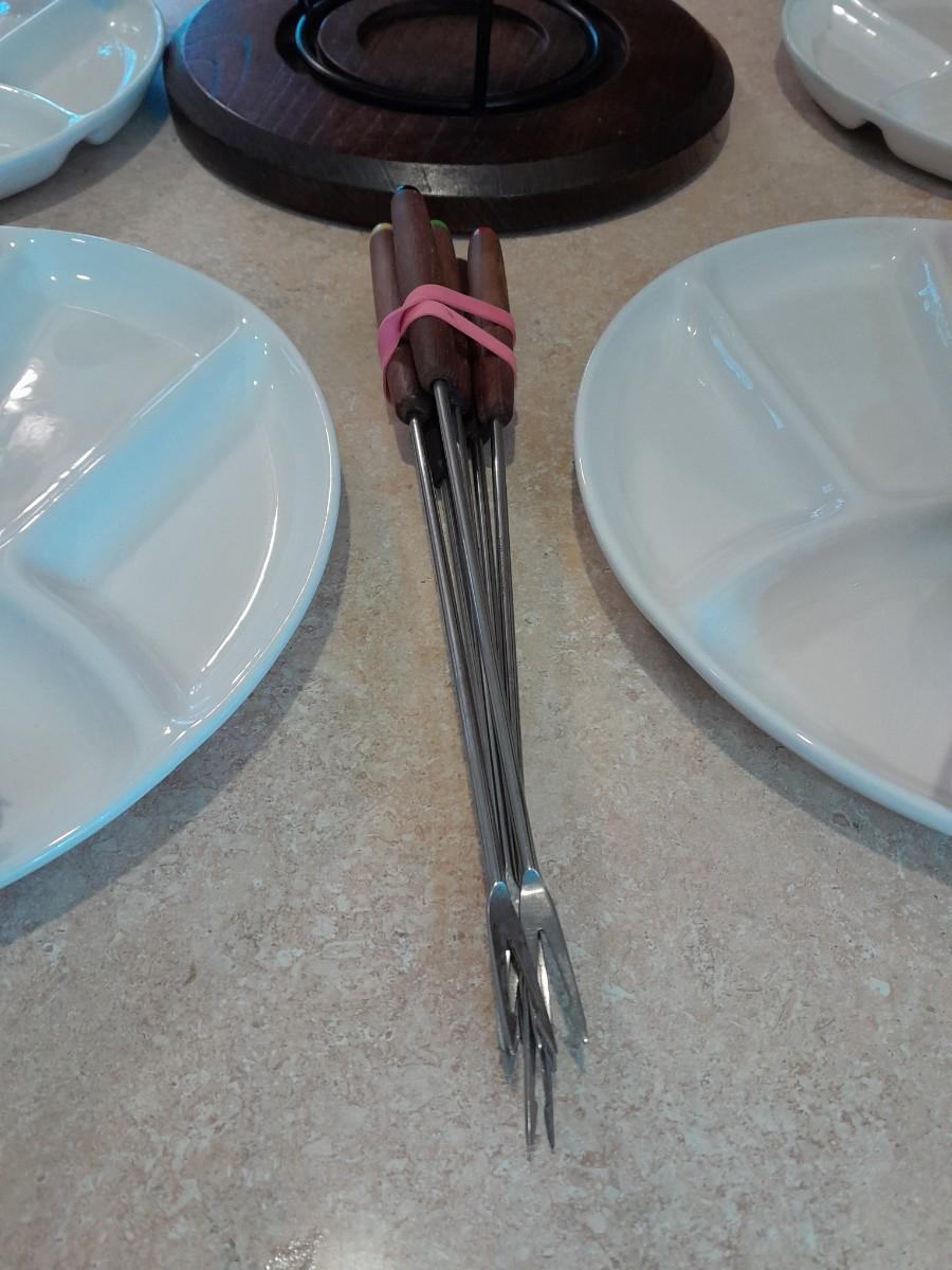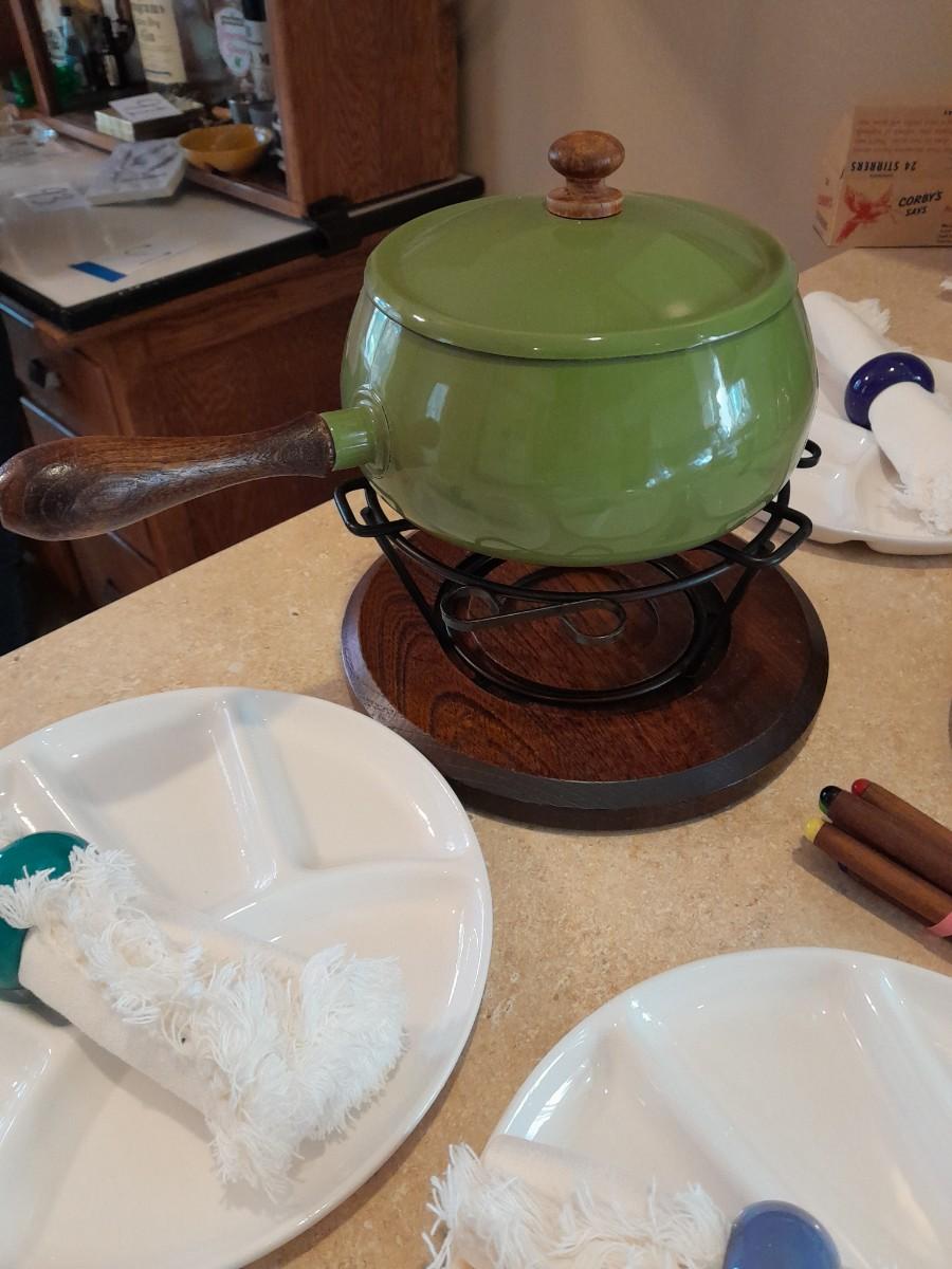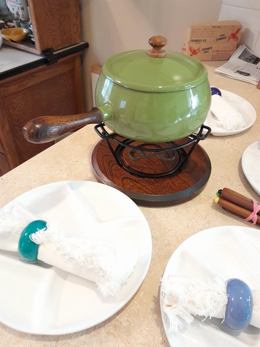 FONDUE POT WITH 4 CERAMIC LIKE SERVING PLATES AND CLOTH NAPKINS IN RINGS