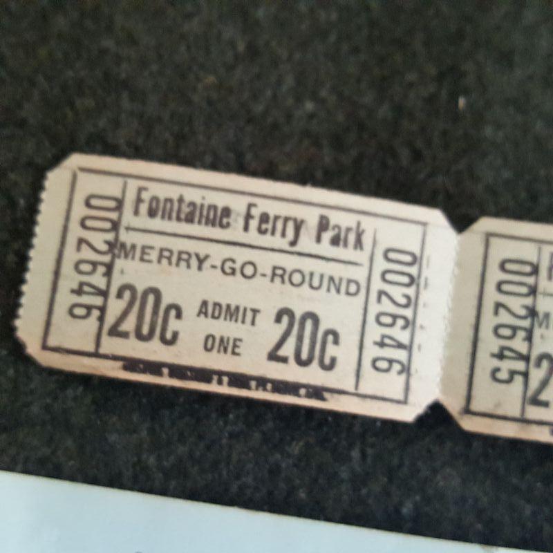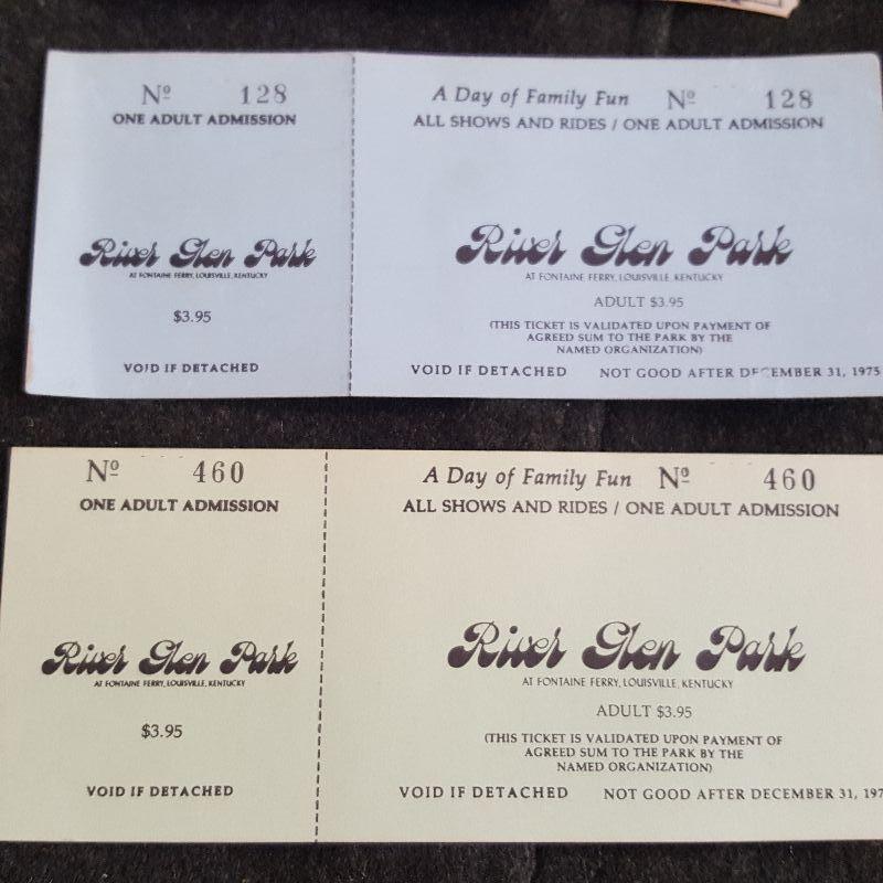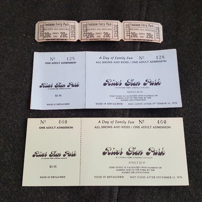 This auction lot is for Fontaine Ferry Tickets. The three Fontaine Ferry tickets are to be used on the Merry-Go-Round and are still connected. The two River Glen Park tickets are for general admission to the park in 1975. The original Fontaine Ferry was renamed River Glen Park in its last days as an amusement park in Louisville, KY