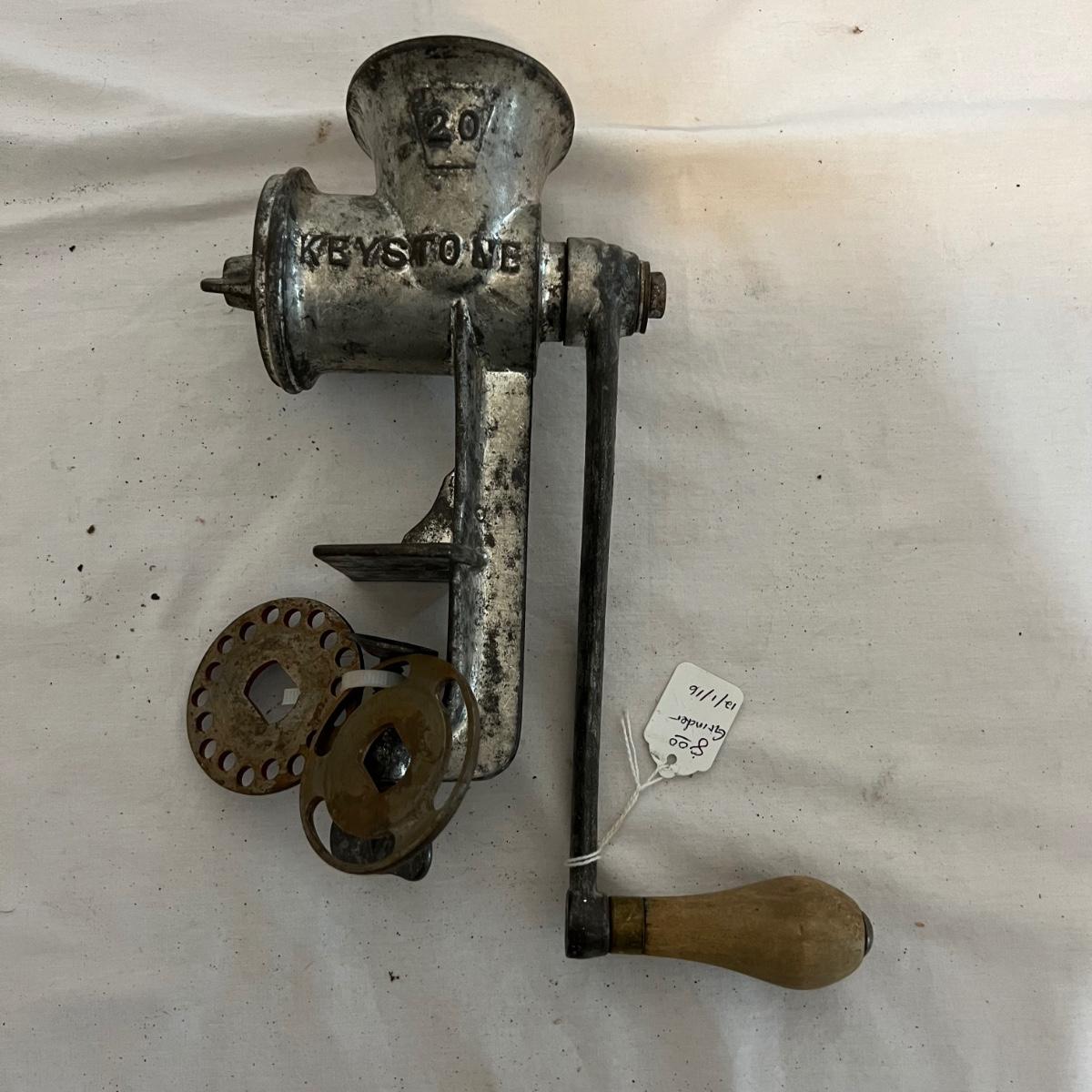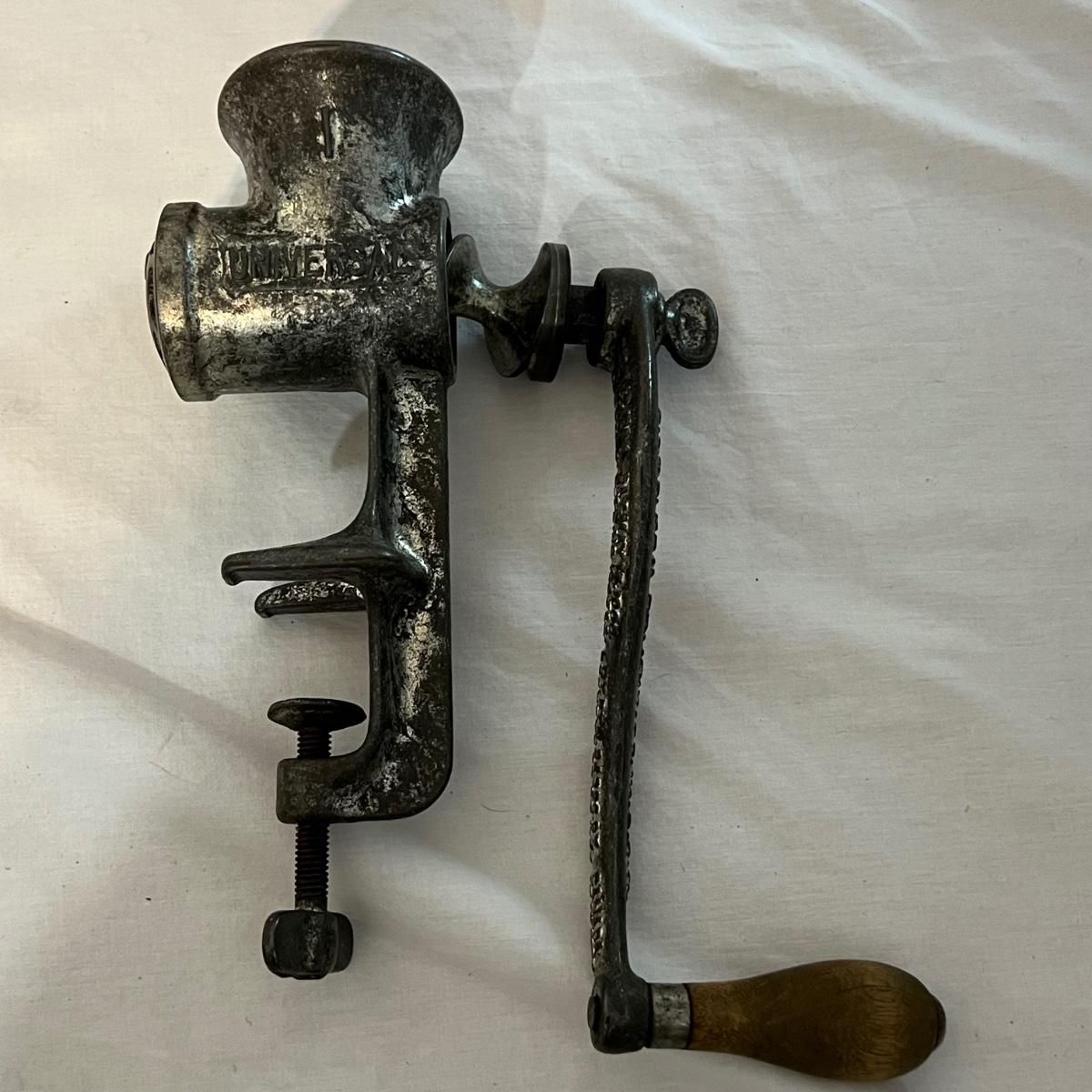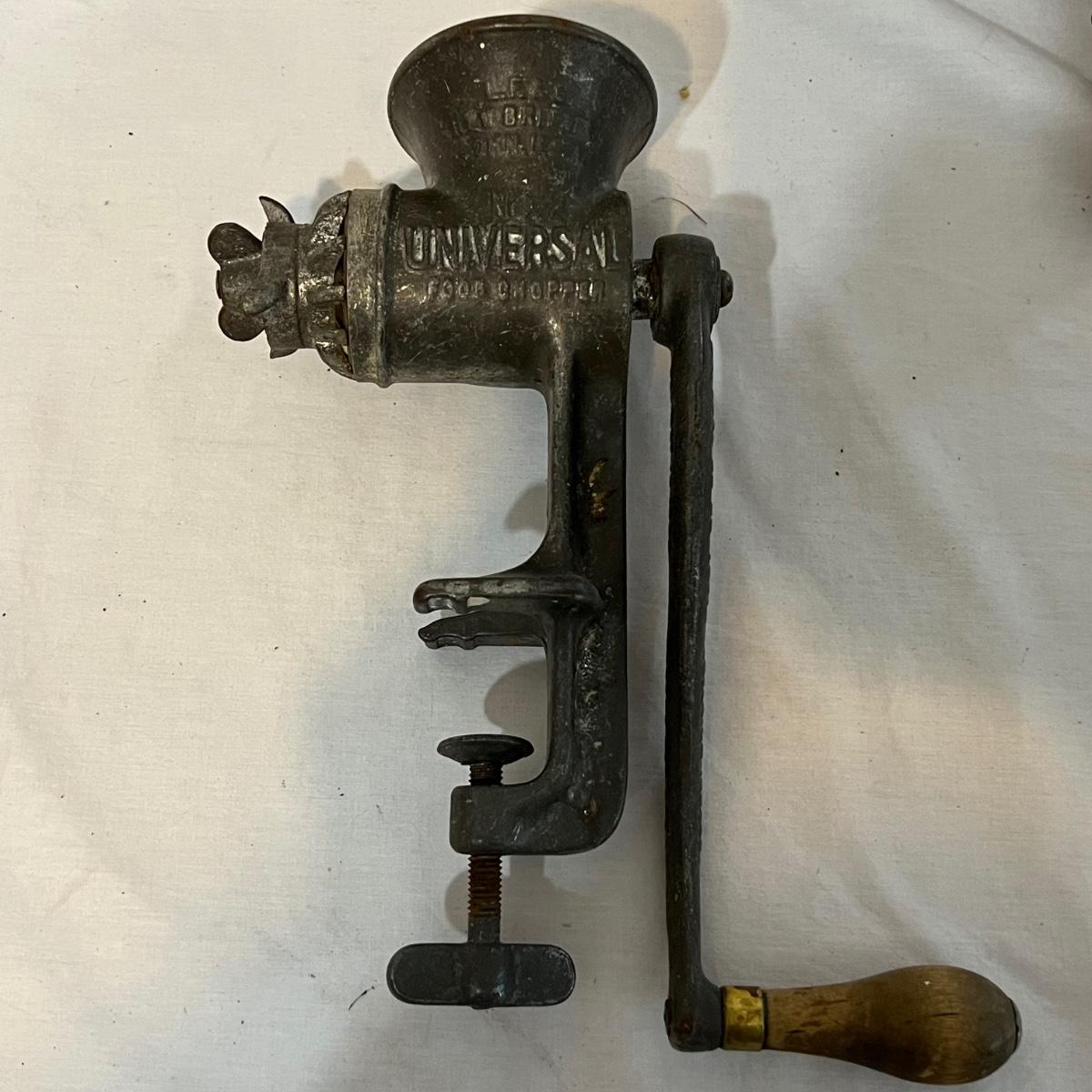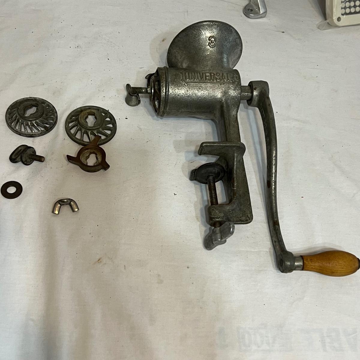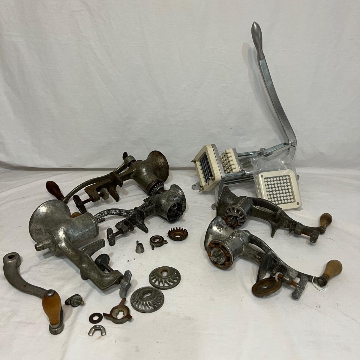 Five vintage food grinders and one potato cutter. Three Universal grinders, one No. 3, one No. 2 and one No. 1. The largest No.#3 measures approximately 5” x 5” x 11”H. All appear to have the necessary parts to function as designed. One Keystone No. 20 grinder with two blades. One potato slicer measures approximately 13” x 7” x 11”H and has two different cutting blades.