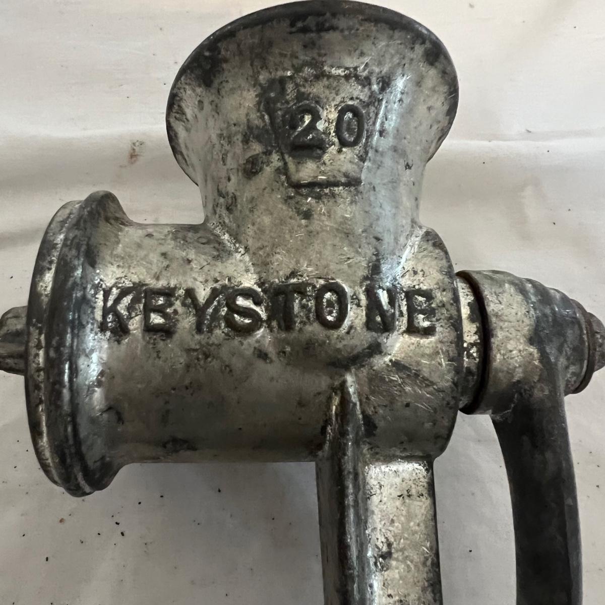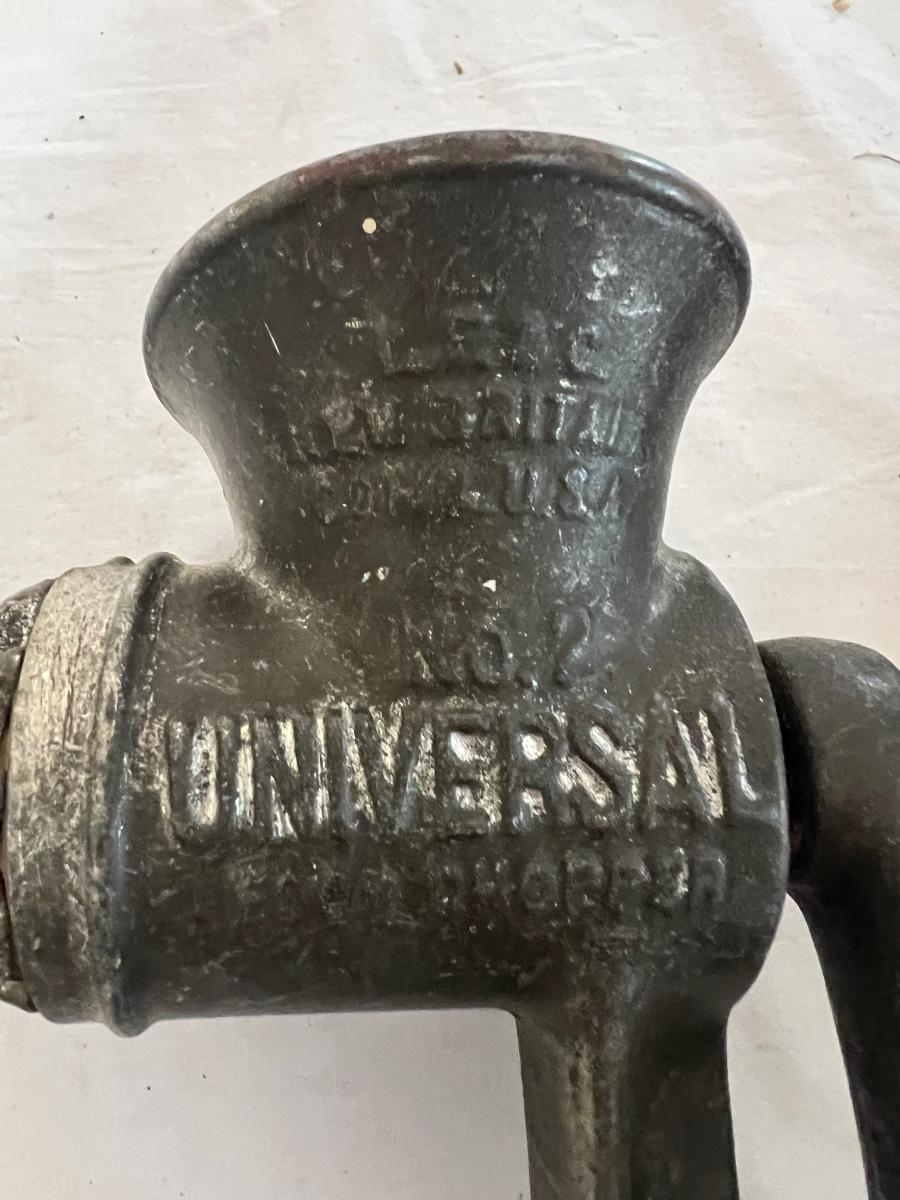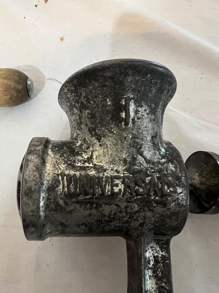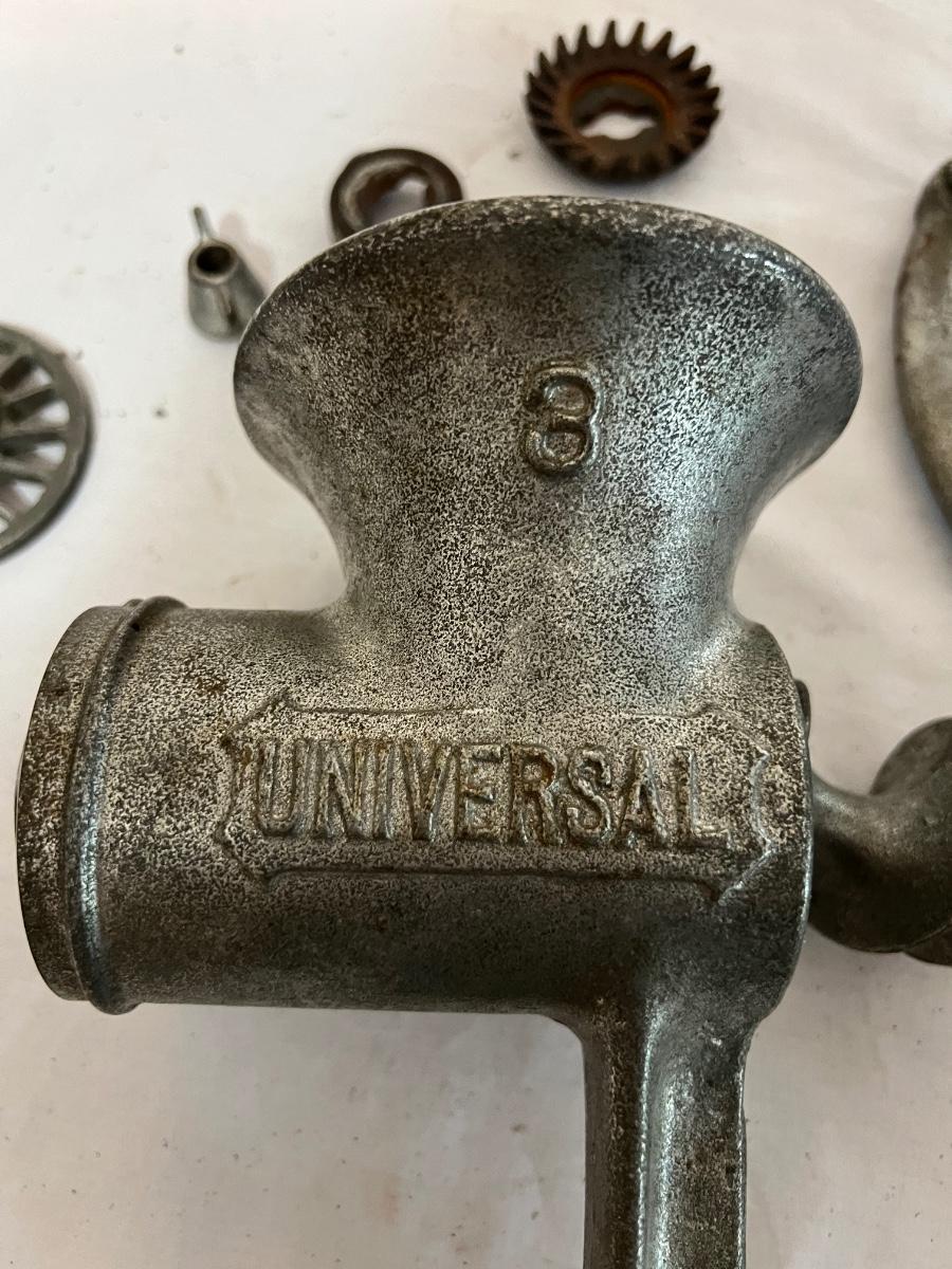 Five vintage food grinders and one potato cutter. Three Universal grinders, one No. 3, one No. 2 and one No. 1. The largest No.#3 measures approximately 5” x 5” x 11”H. All appear to have the necessary parts to function as designed. One Keystone No. 20 grinder with two blades. One potato slicer measures approximately 13” x 7” x 11”H and has two different cutting blades.