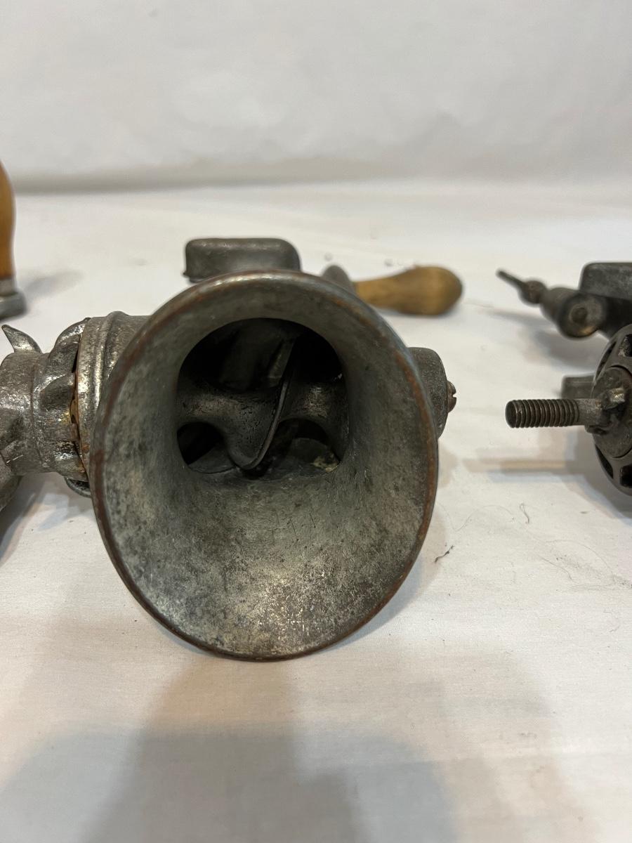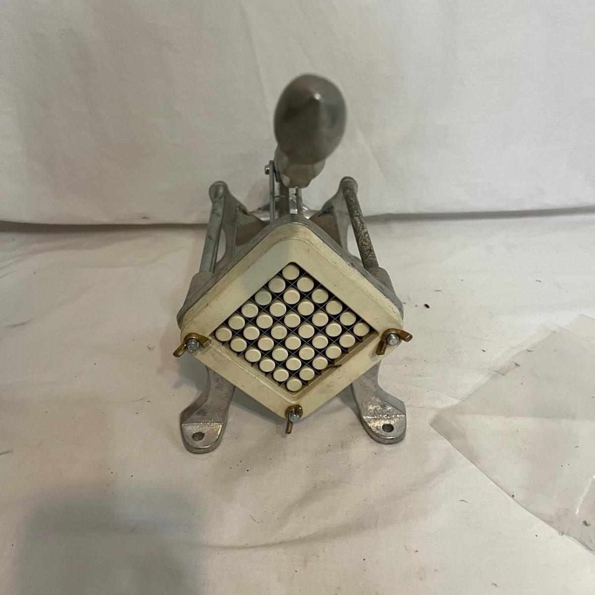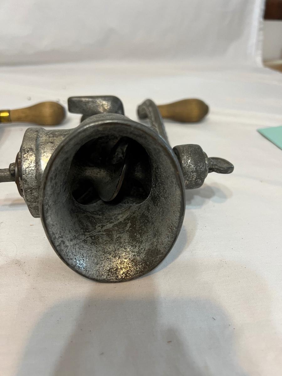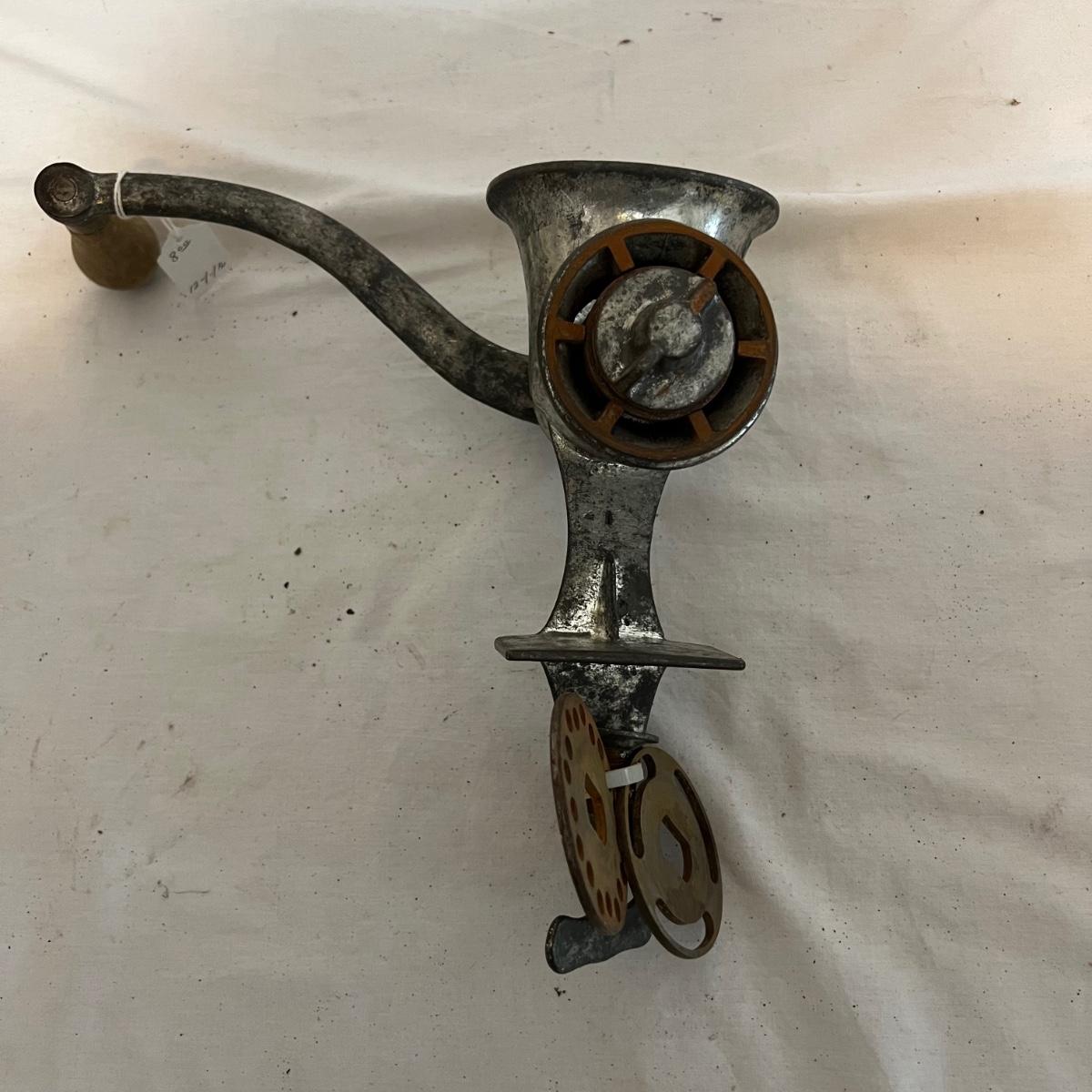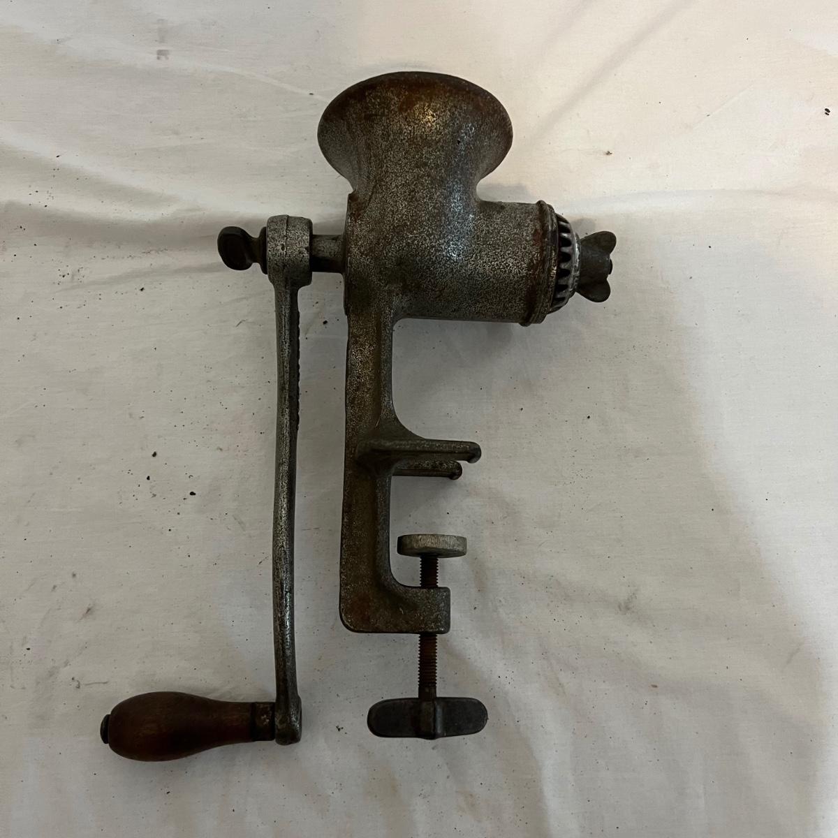 Five vintage food grinders and one potato cutter. Three Universal grinders, one No. 3, one No. 2 and one No. 1. The largest No.#3 measures approximately 5” x 5” x 11”H. All appear to have the necessary parts to function as designed. One Keystone No. 20 grinder with two blades. One potato slicer measures approximately 13” x 7” x 11”H and has two different cutting blades.