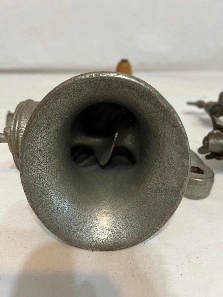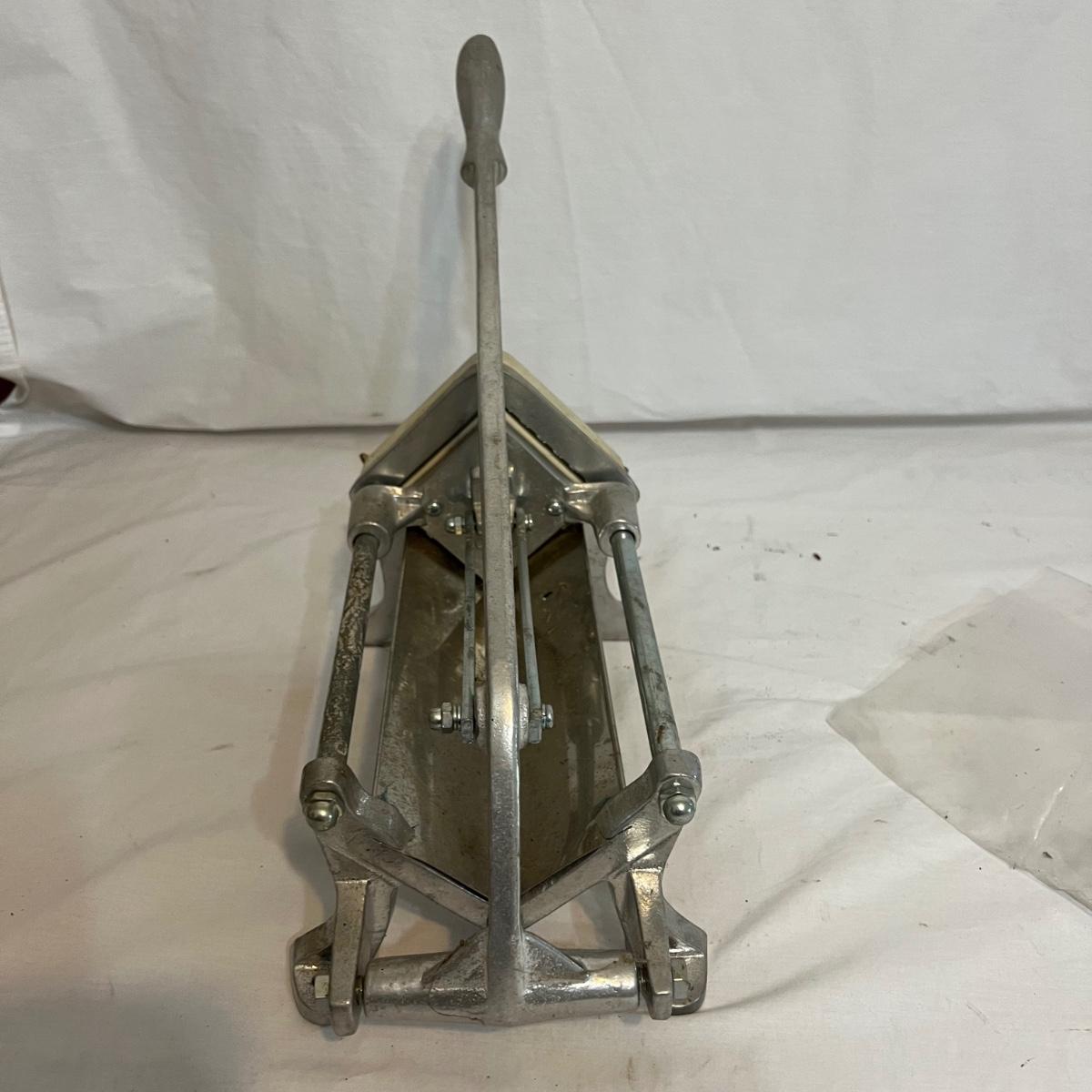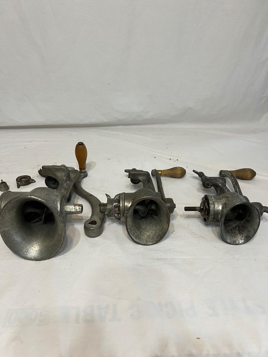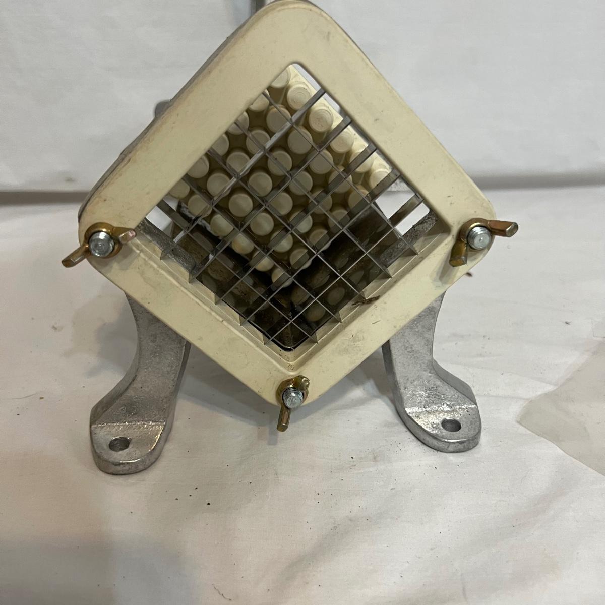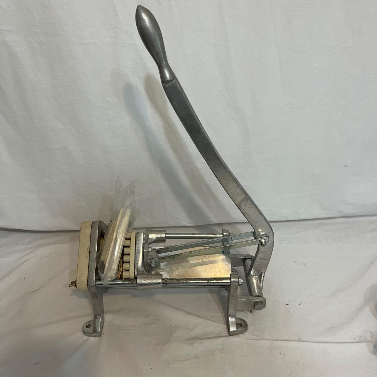 Five vintage food grinders and one potato cutter. Three Universal grinders, one No. 3, one No. 2 and one No. 1. The largest No.#3 measures approximately 5” x 5” x 11”H. All appear to have the necessary parts to function as designed. One Keystone No. 20 grinder with two blades. One potato slicer measures approximately 13” x 7” x 11”H and has two different cutting blades.