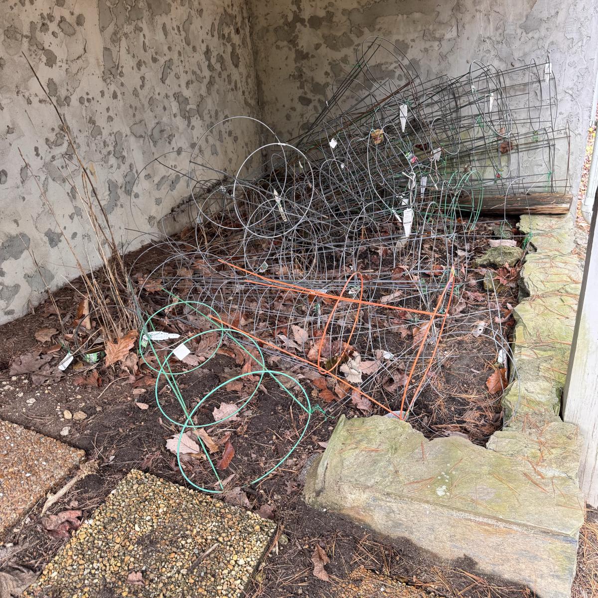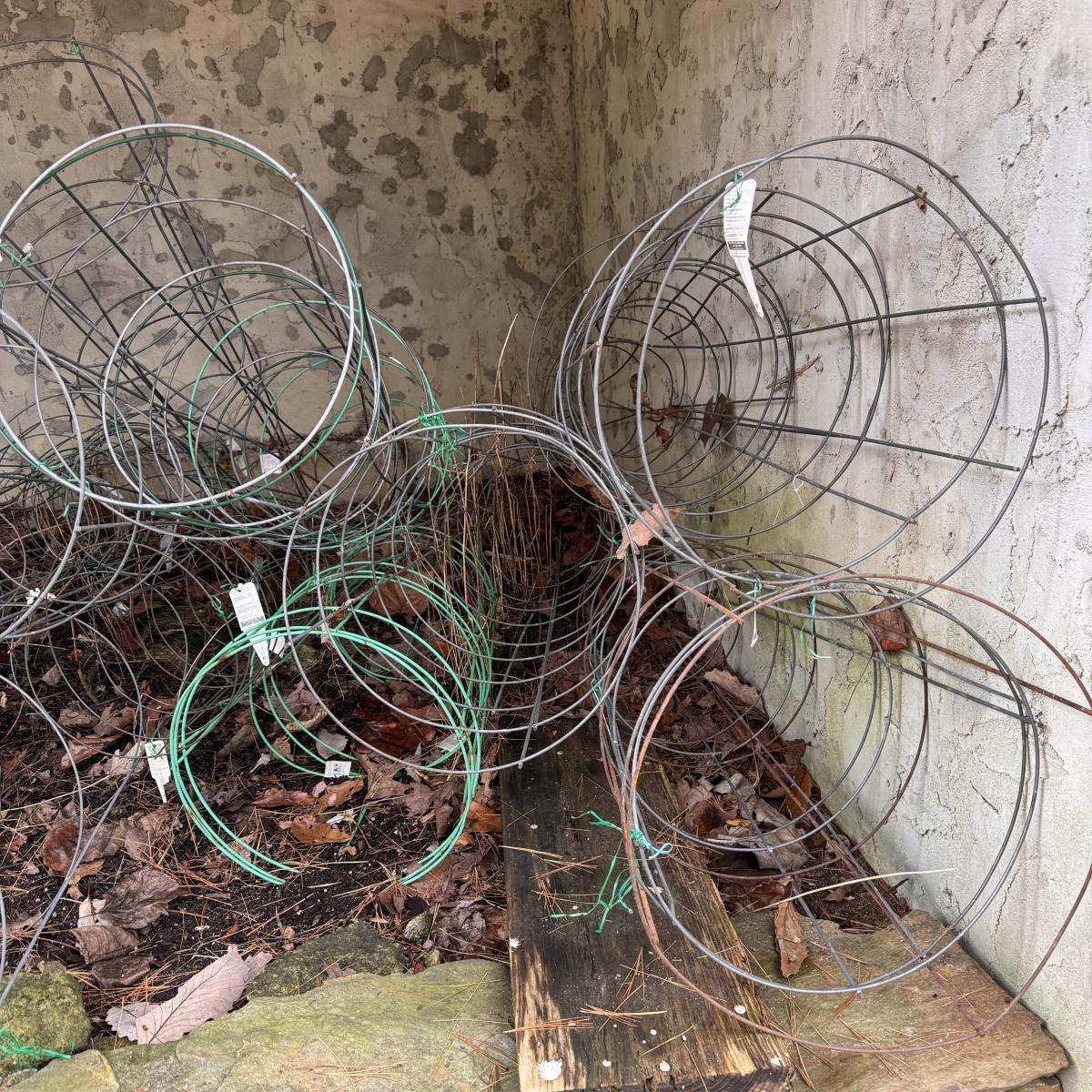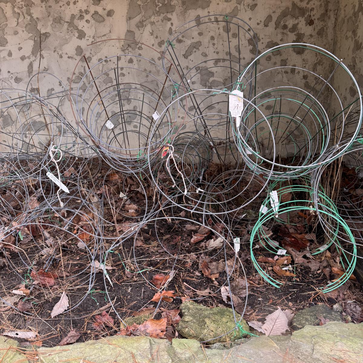This lot includes over ten tomato cages - mostly silver, but some are green and orange. They have all been used. Local pickup only.