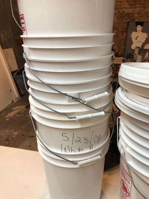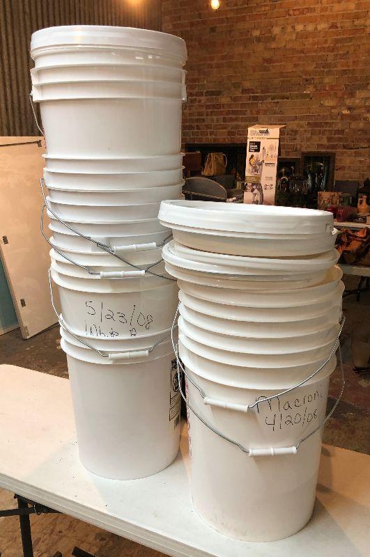 Here is a lot of six(6) food grade plastic buckets with lids...used just once...