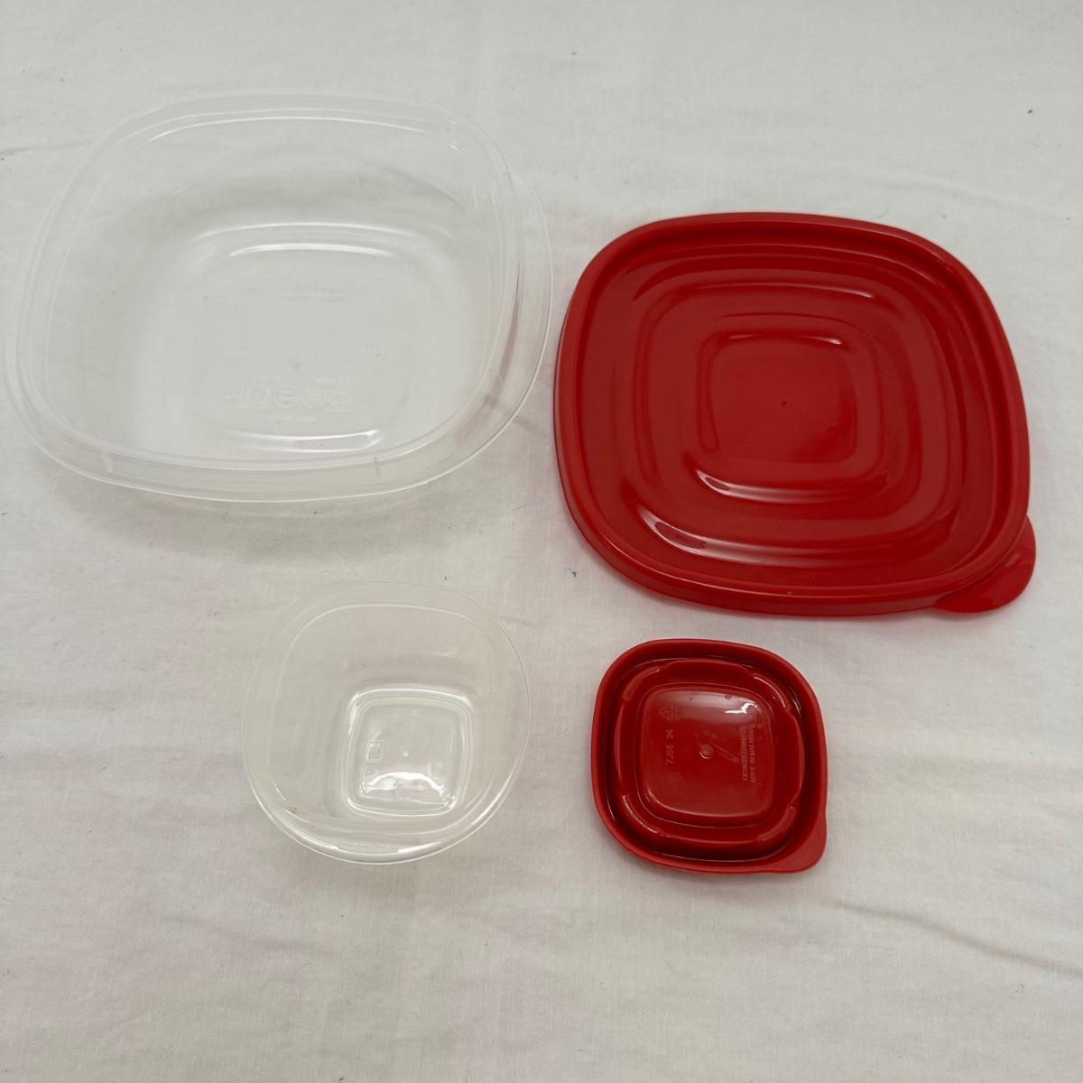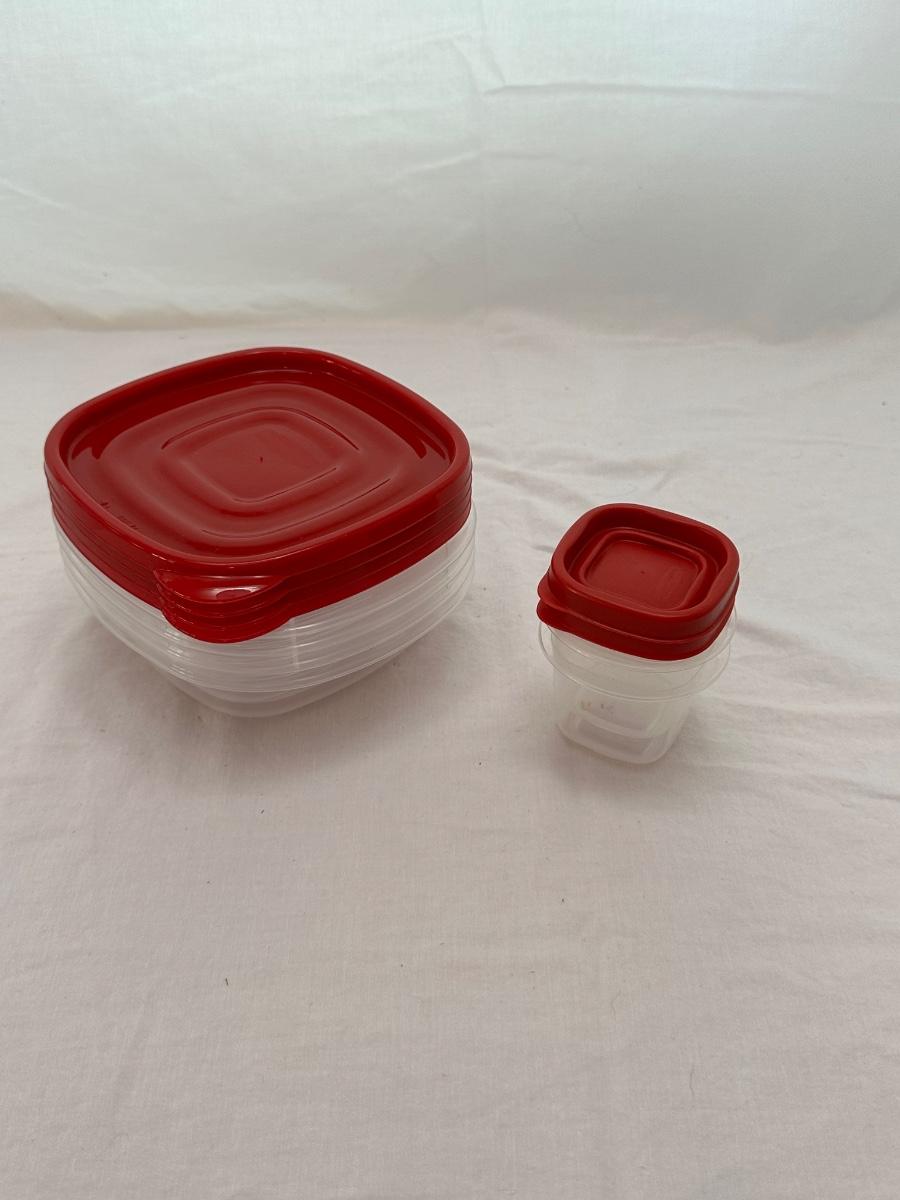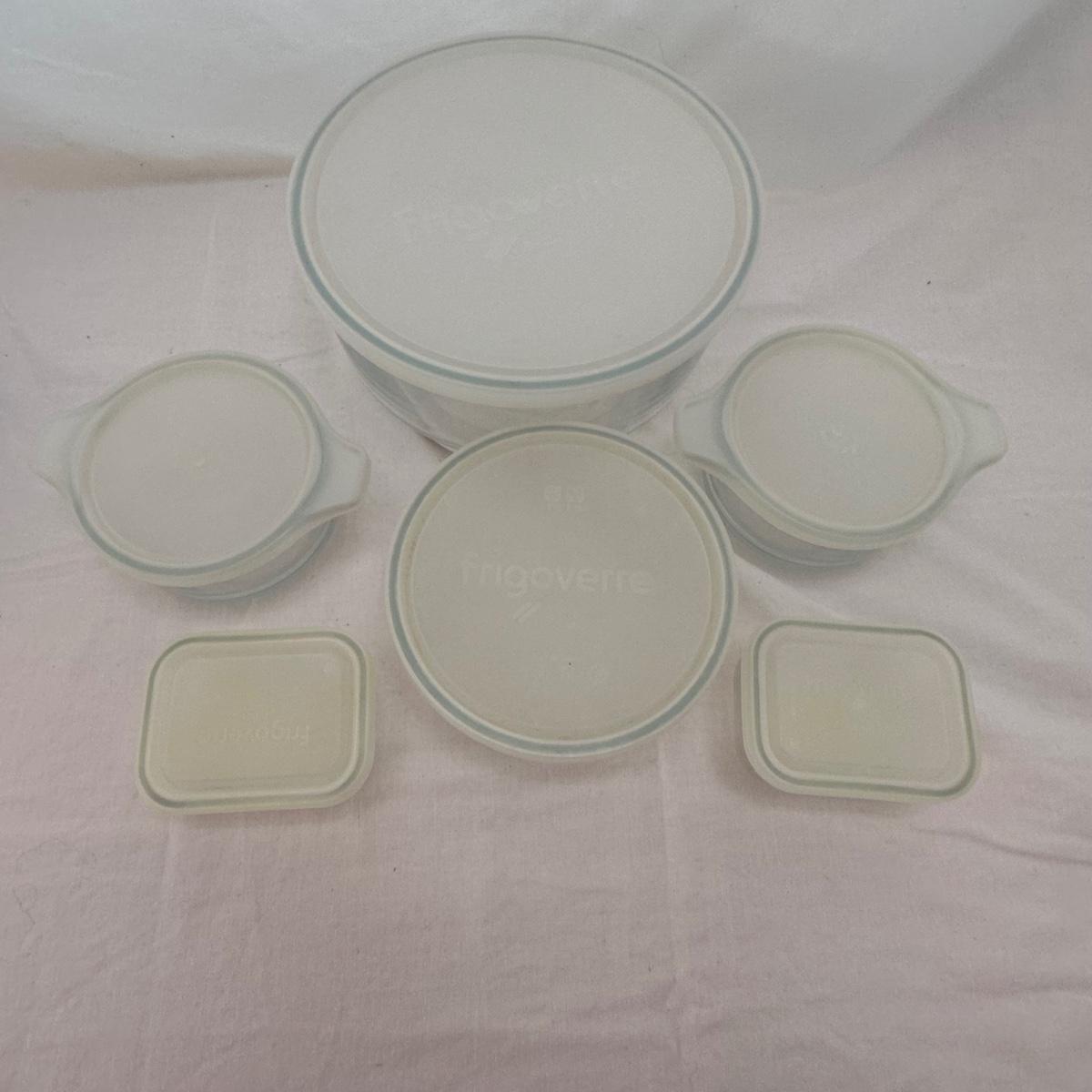 Six lidded pieces of Frigoverre, seven lidded pieces of Snapware, an assortment of Rubbermaid and Pyrex. Two bowls do not have lids.