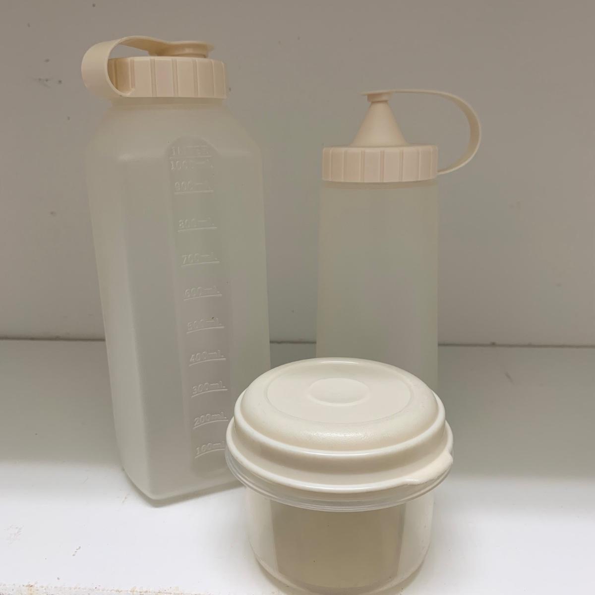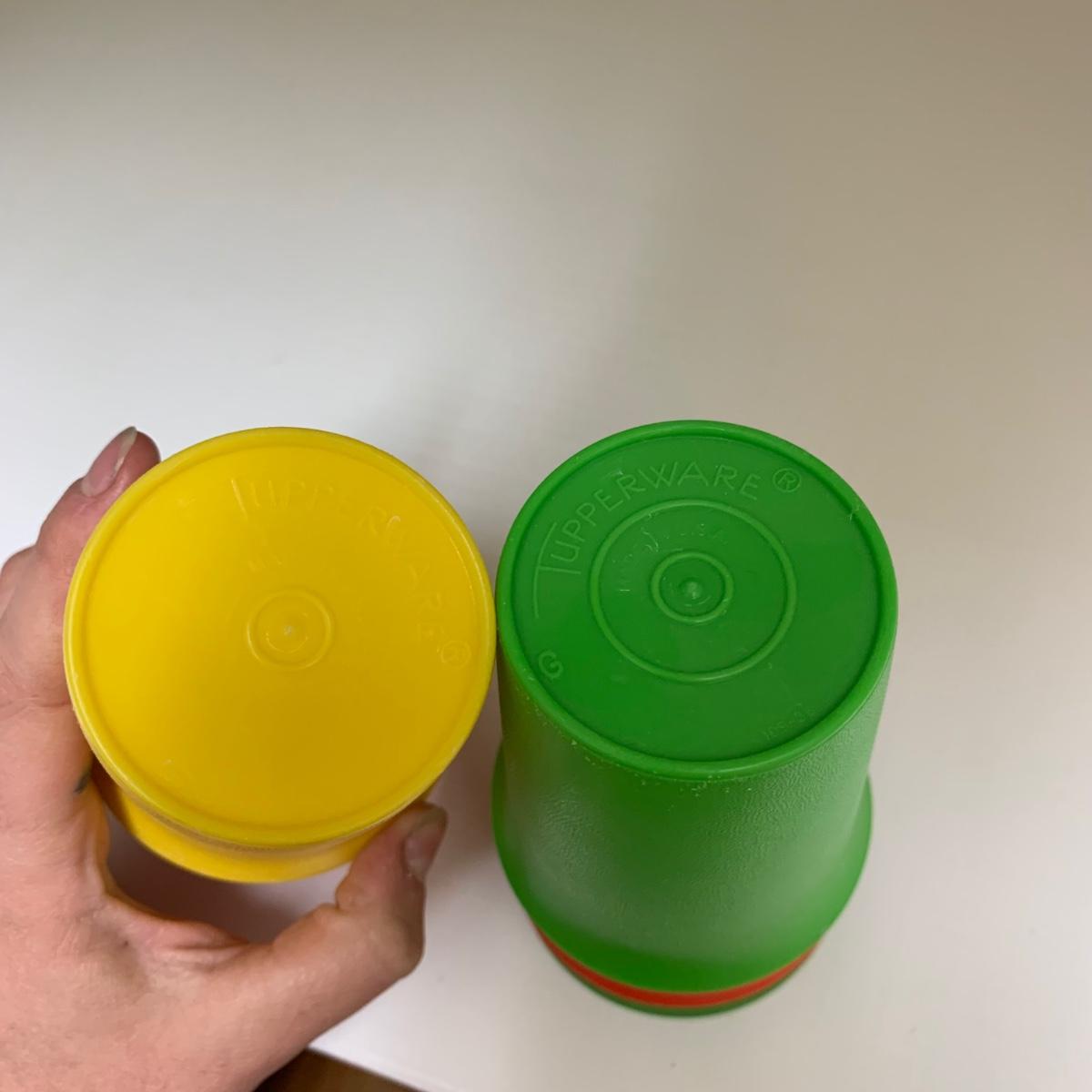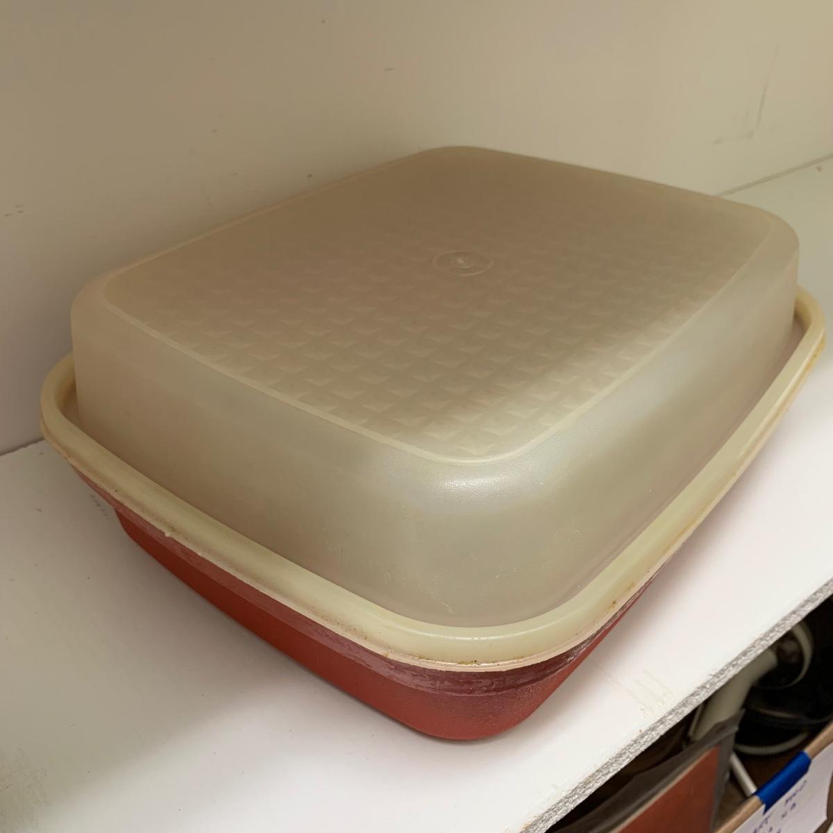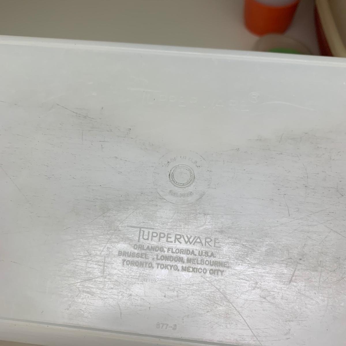 A collection of modern food storage containers and some fun vintage Tupperware items! There are 11 Rubbermaid and Lock & Lock items. For the vintage Tupperware there are two lidded containers, a jello mold with interchangeable top, five small lidded containers, six cups, and a pitcher. The vintage items do show their age and bit, see photos. Jello mold is 8”D x 3.5”H.