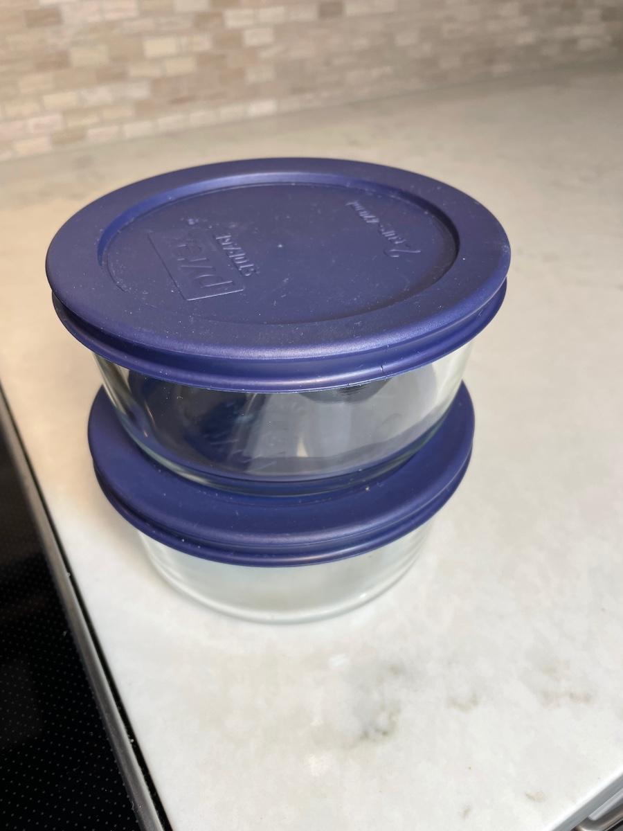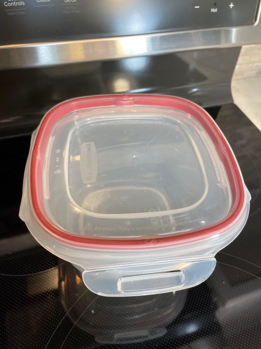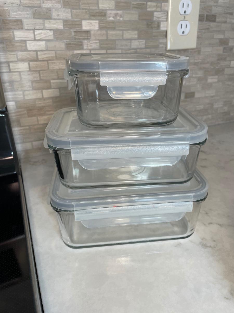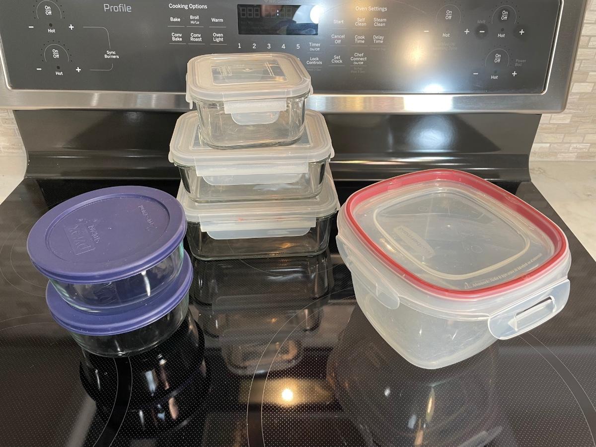 5 assorted covered glass food containers and a rubbermaid plastic container