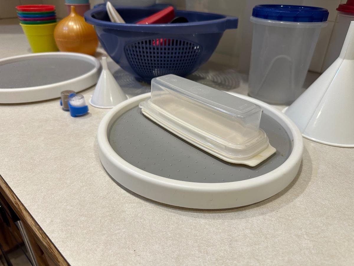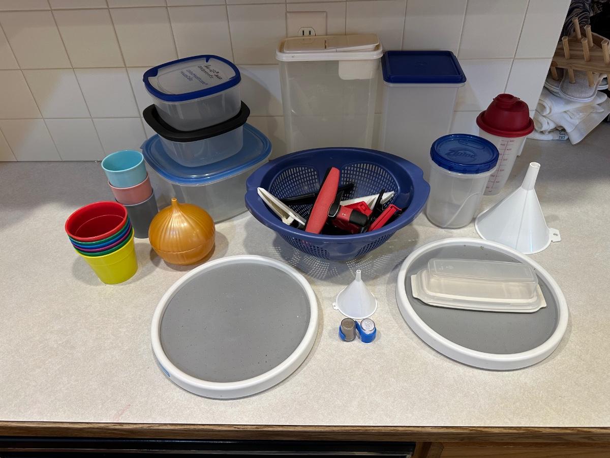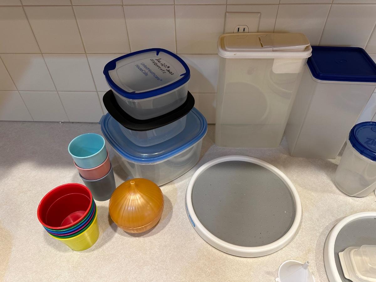 FOOD STORAGE CONTAINERS, 2 LAZY SUSANS, CHIP CLIPS AND TUMBLERS