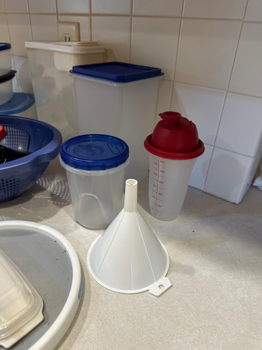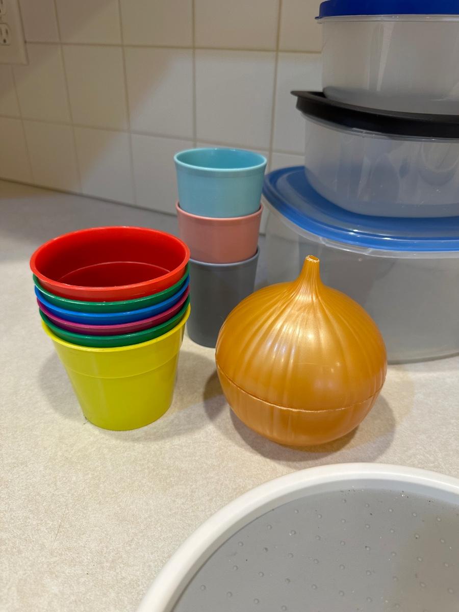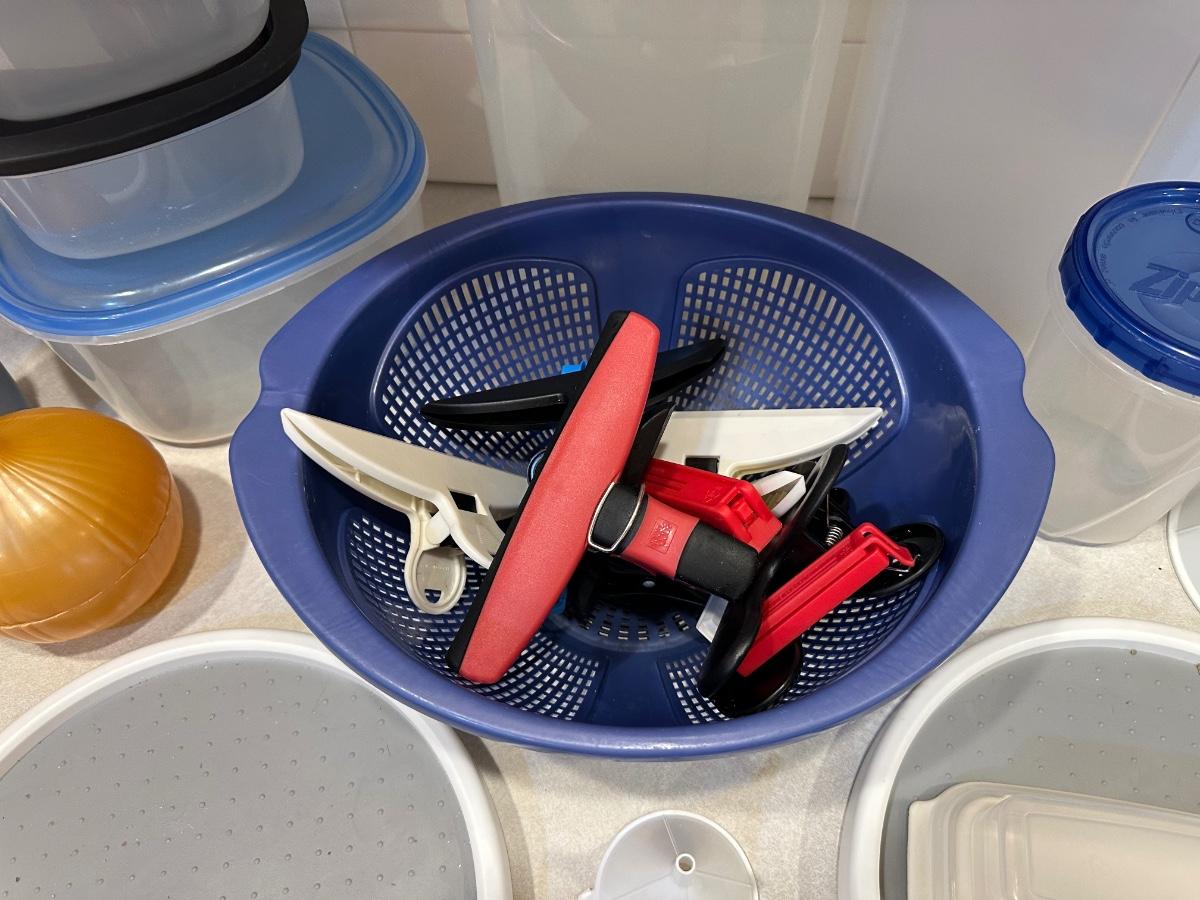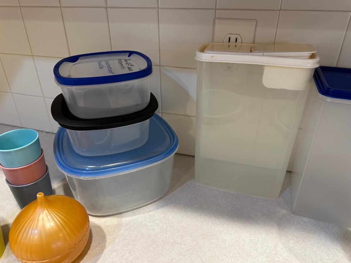 FOOD STORAGE CONTAINERS, 2 LAZY SUSANS, CHIP CLIPS AND TUMBLERS
