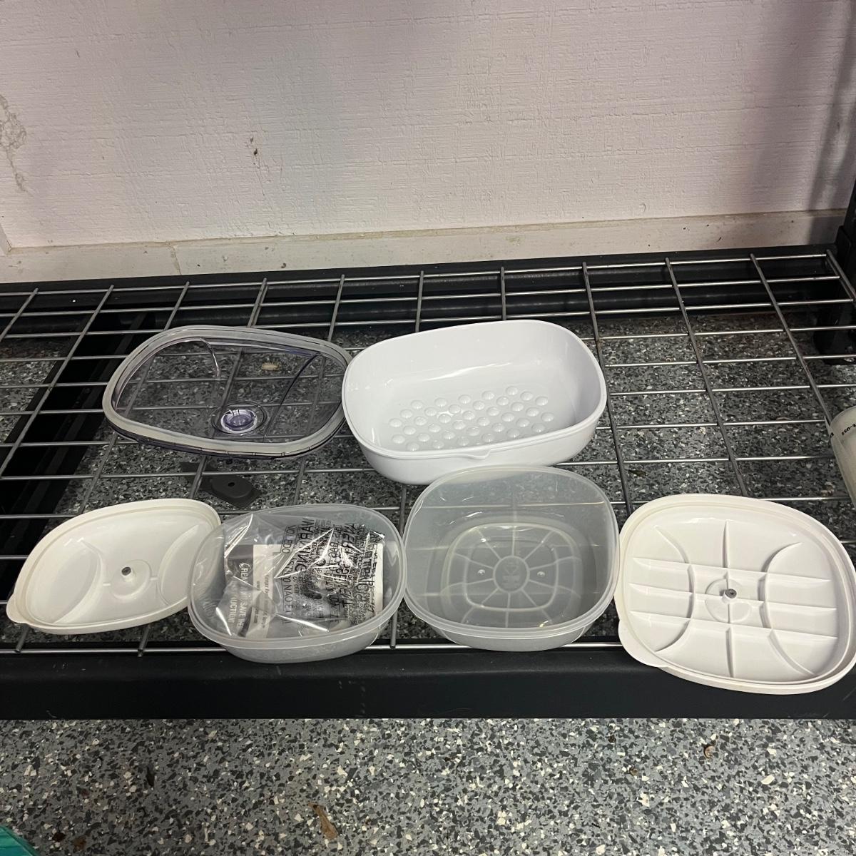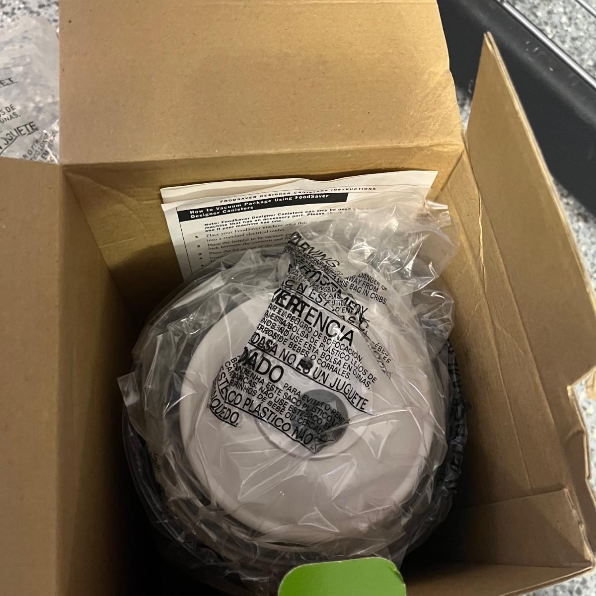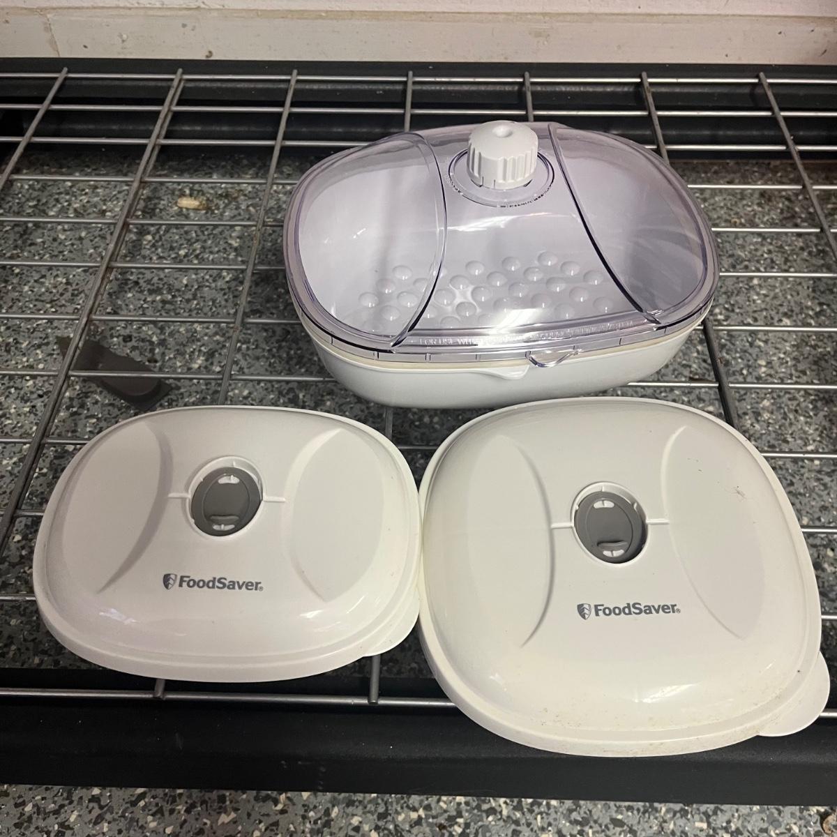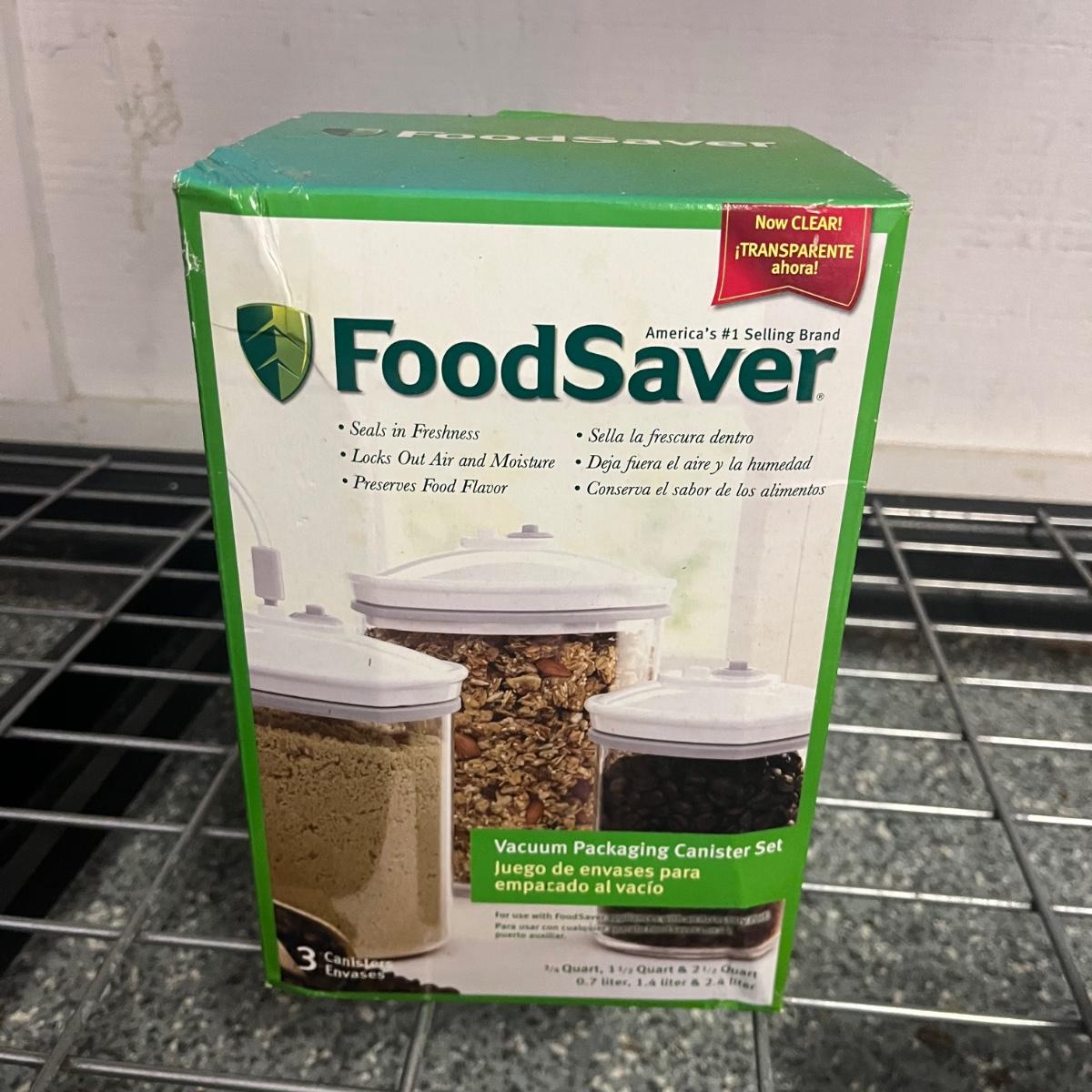 Lot has three FoodSaver bowls with lids, one NIB Vacuum packaging canister set and two FoodSaver plastic sheet rolls.