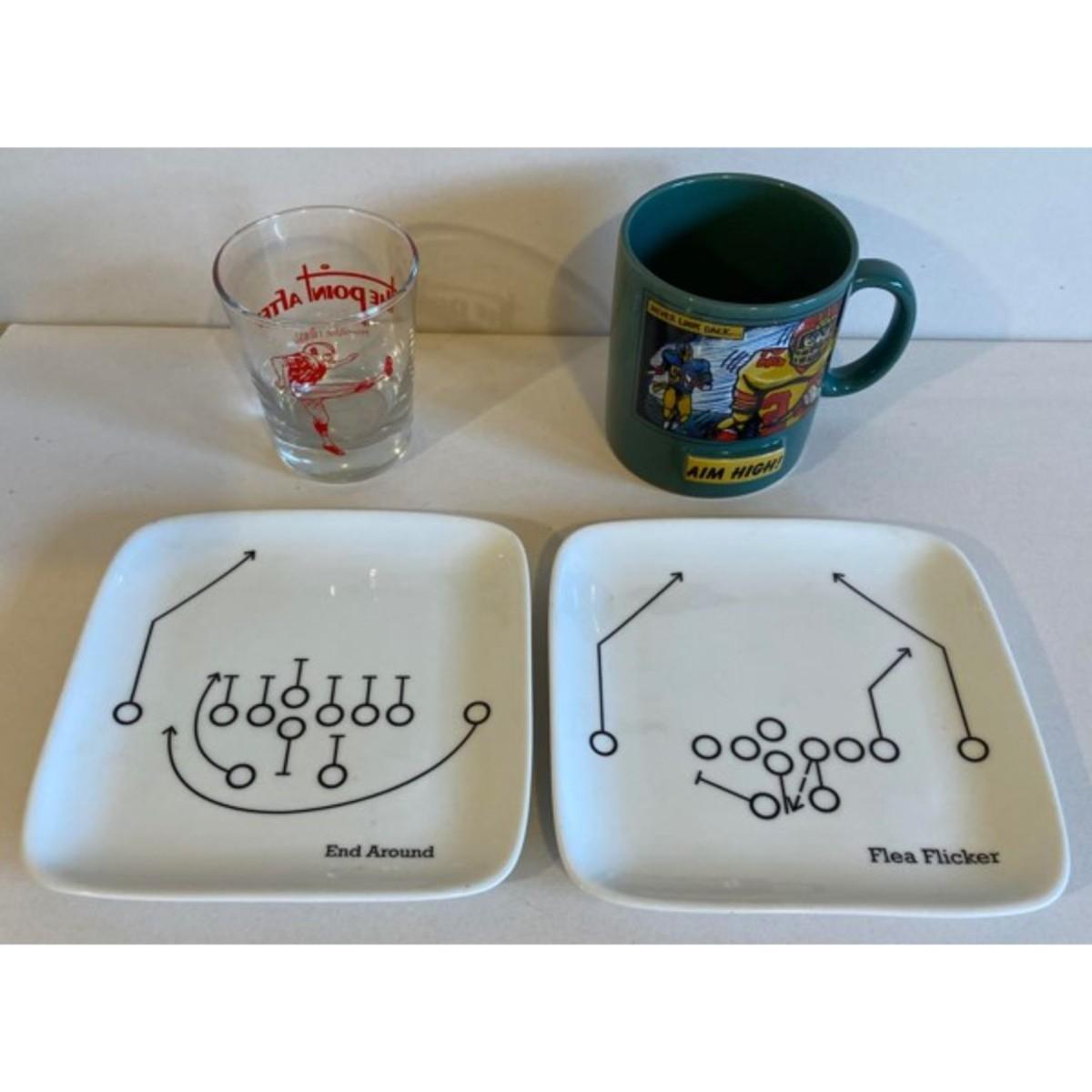 Football Dishware: End Around & Flea Flicker Plates / Whiskey Glass / Coffee Mug