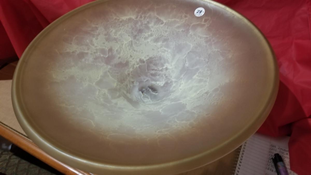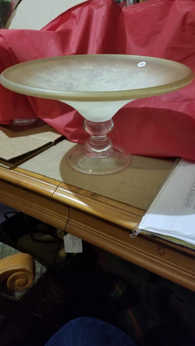 15" across, 3.5" deep, 8.5" tall. Bowl has brownish tint,