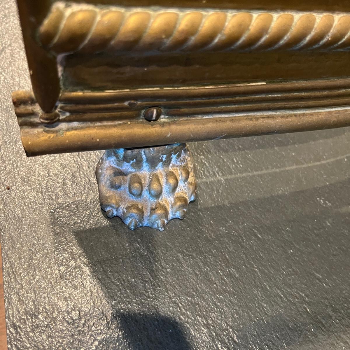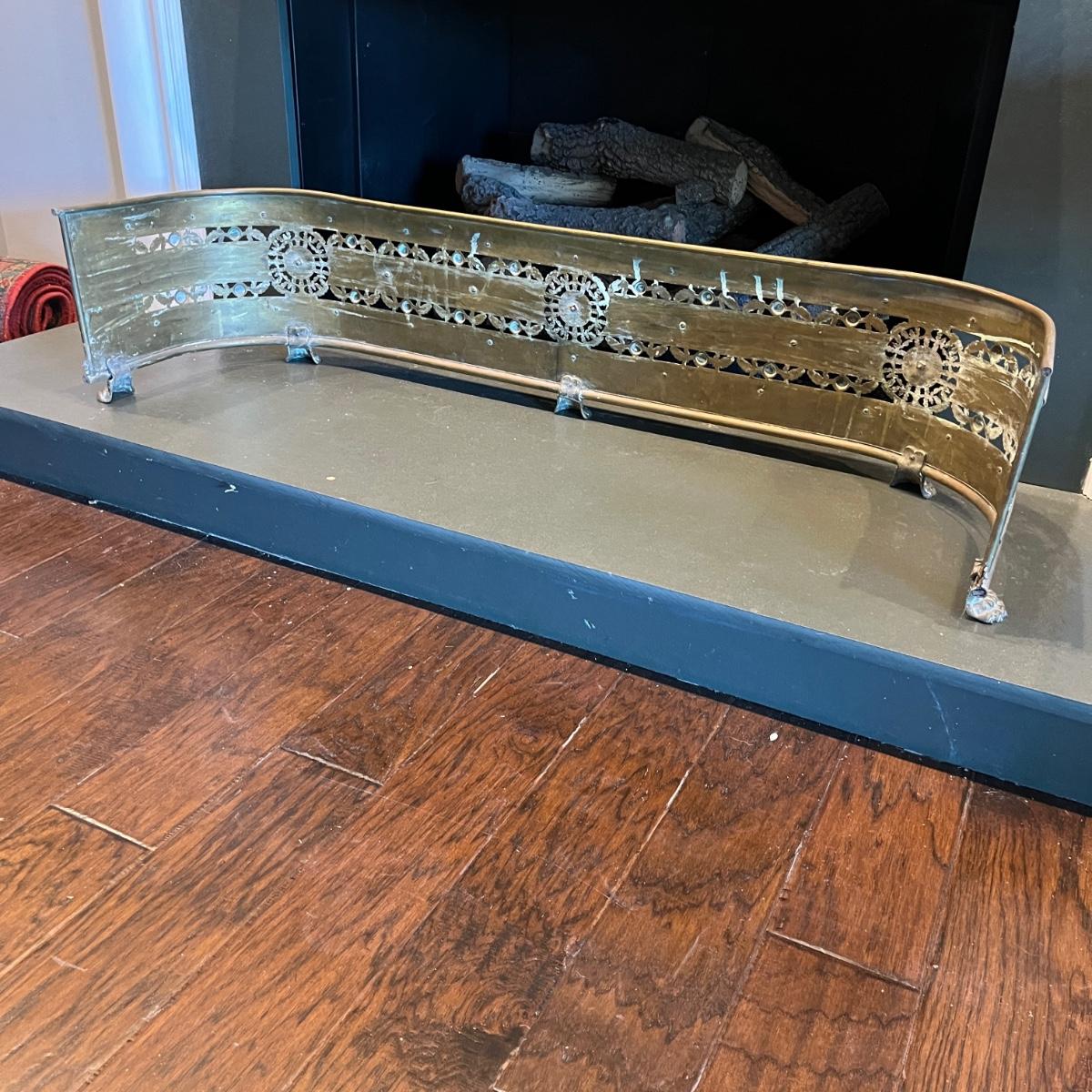 This brass footed fireplace guard measures 48" x 13" x 11"H. The feet are removable.