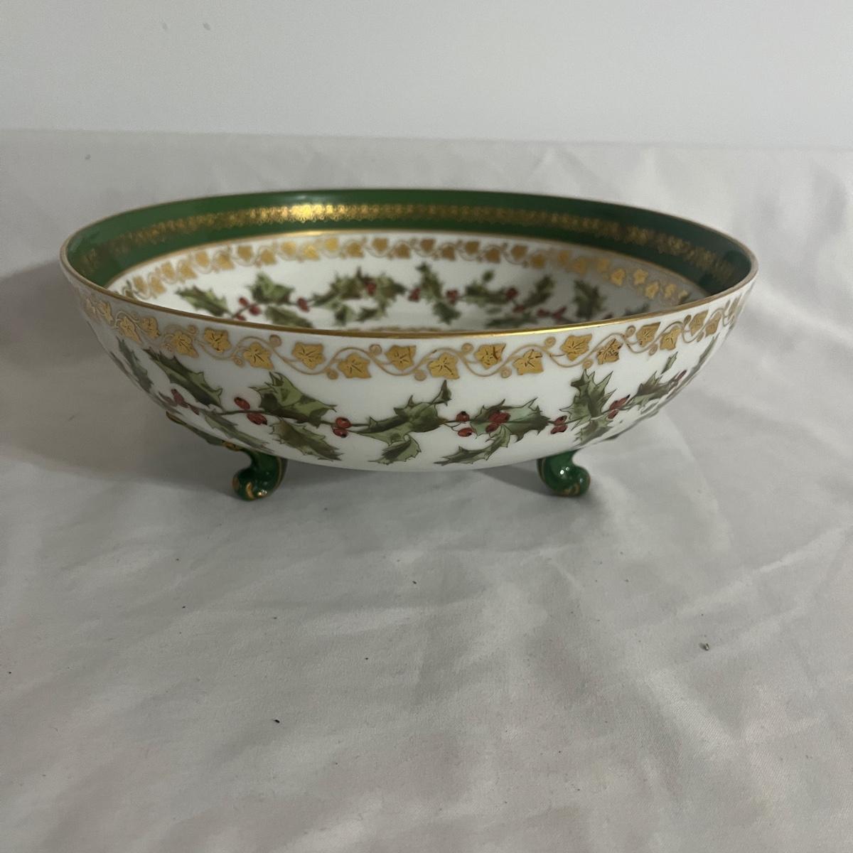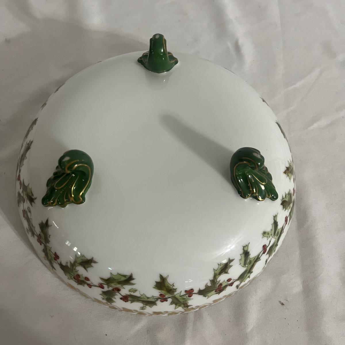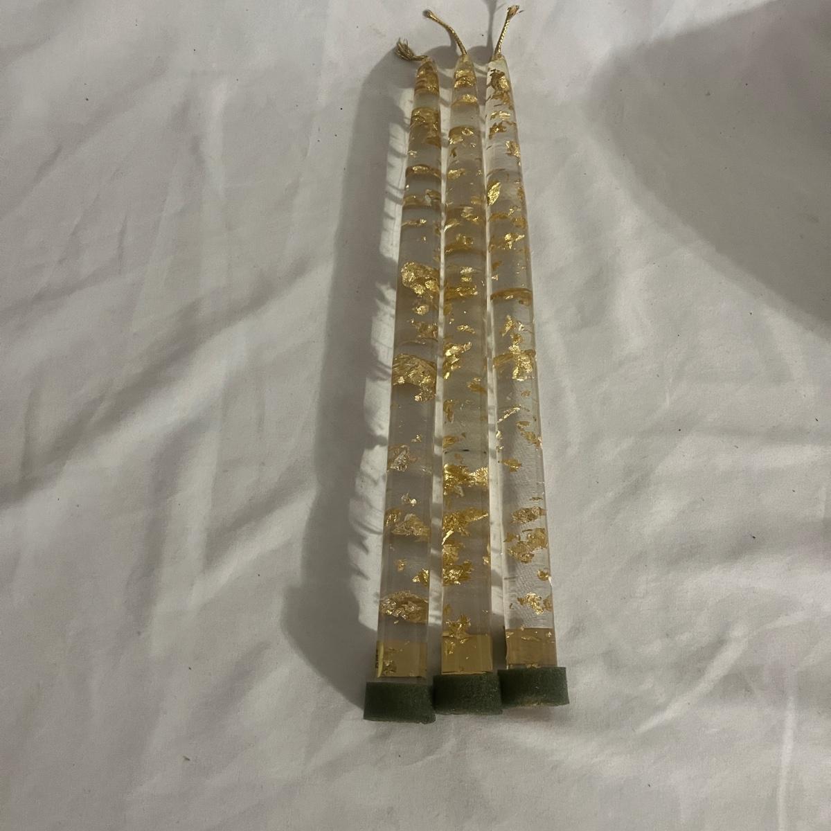 Lot includes an unmarked ceramic Christmas bowl that measures 8”D x 3”H. Also includes three decorative acrylic tapered candles with sparkly gold colored flakes throughout.