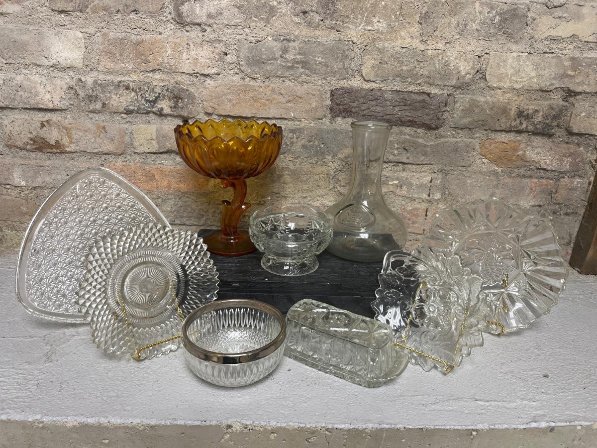 Amber glass footed compote, anchor hocking pressed glass, miscellaneous candy dishes and tidbits
