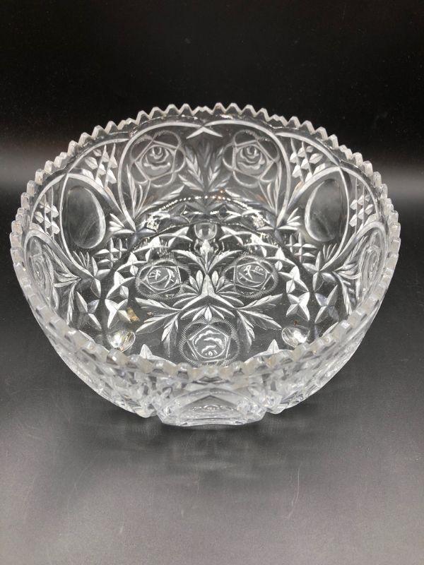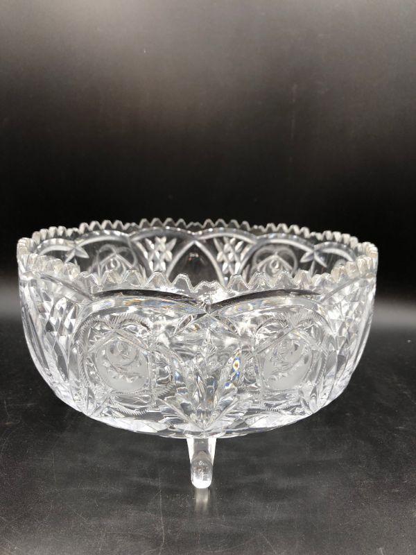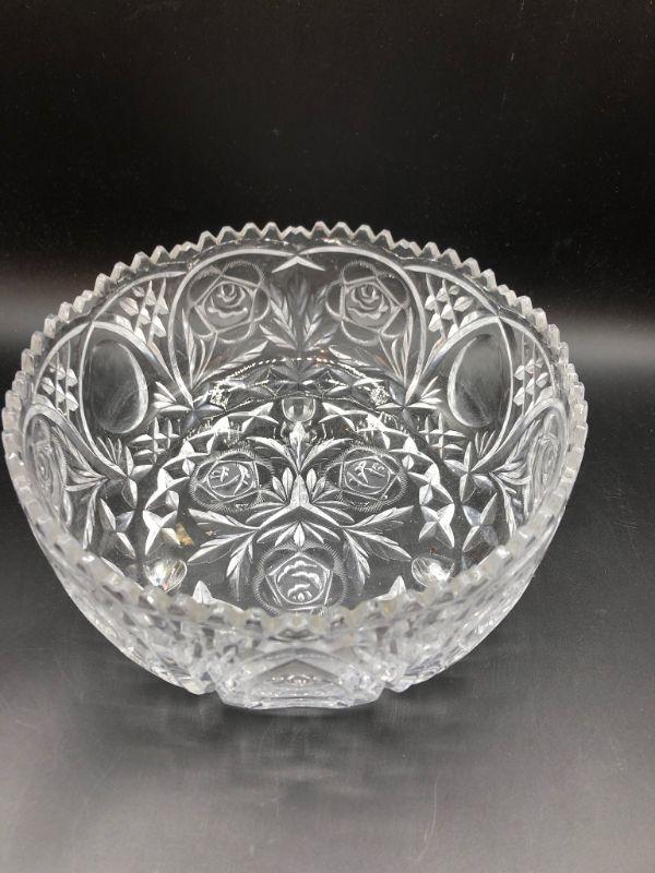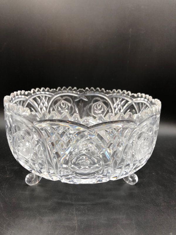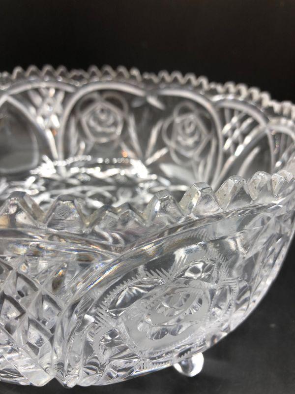 Footed crystal bowl. Rose pattern. Sawtooth edge has a few small chips, hardly noticeable.