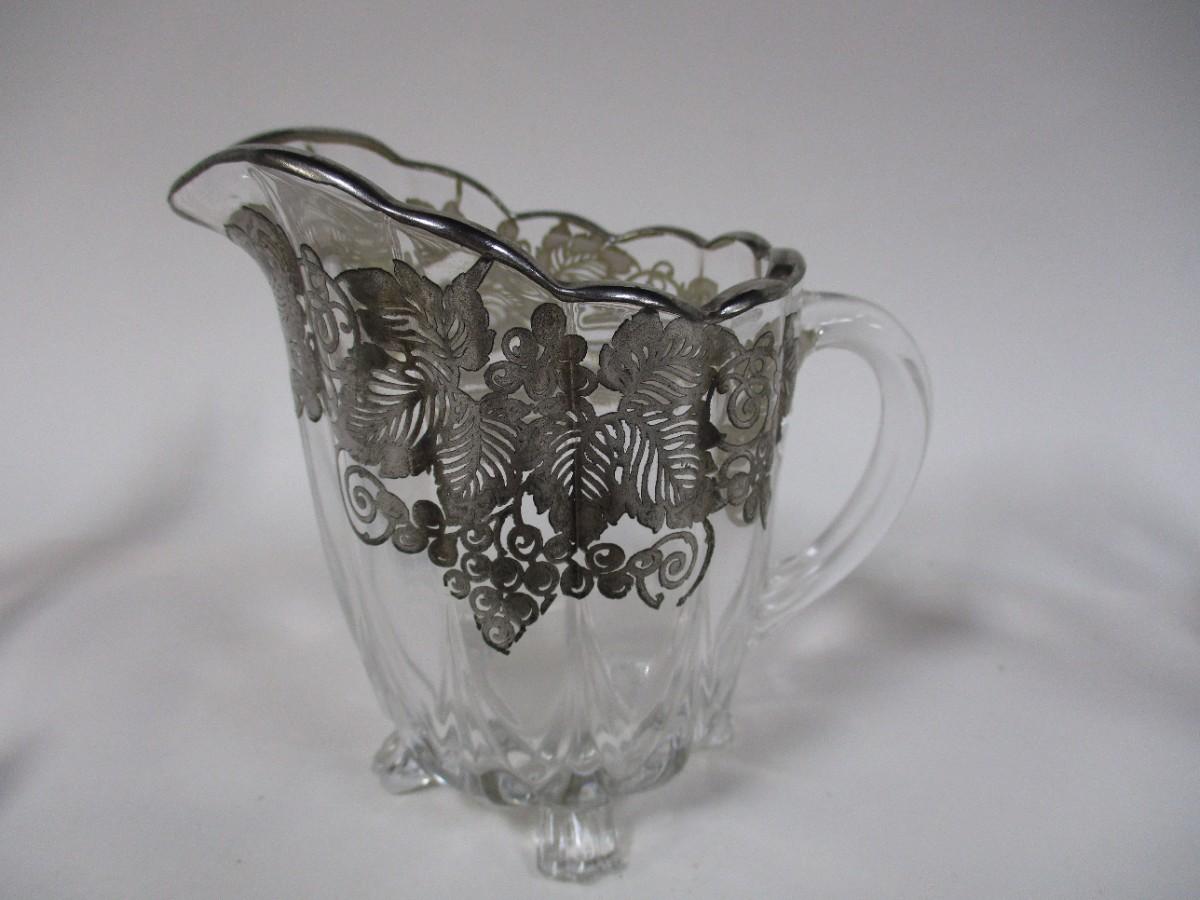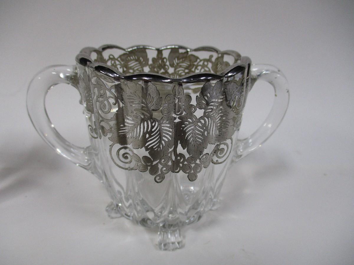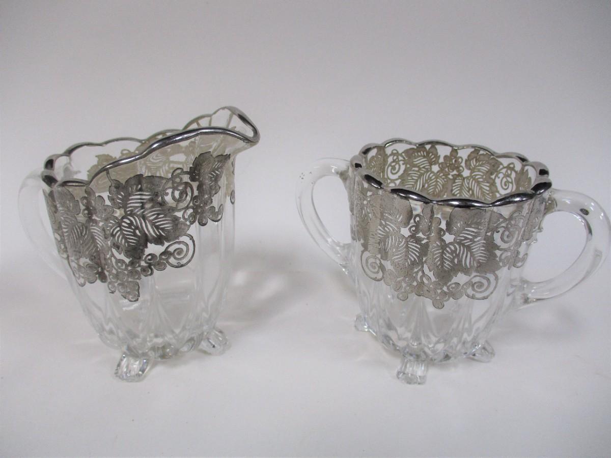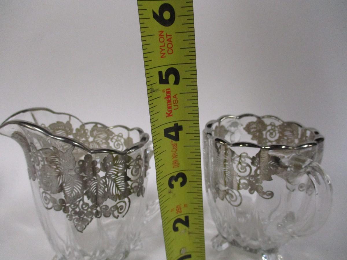 Footed Open Sugar & Creamer Clear Glass Silver Overlay