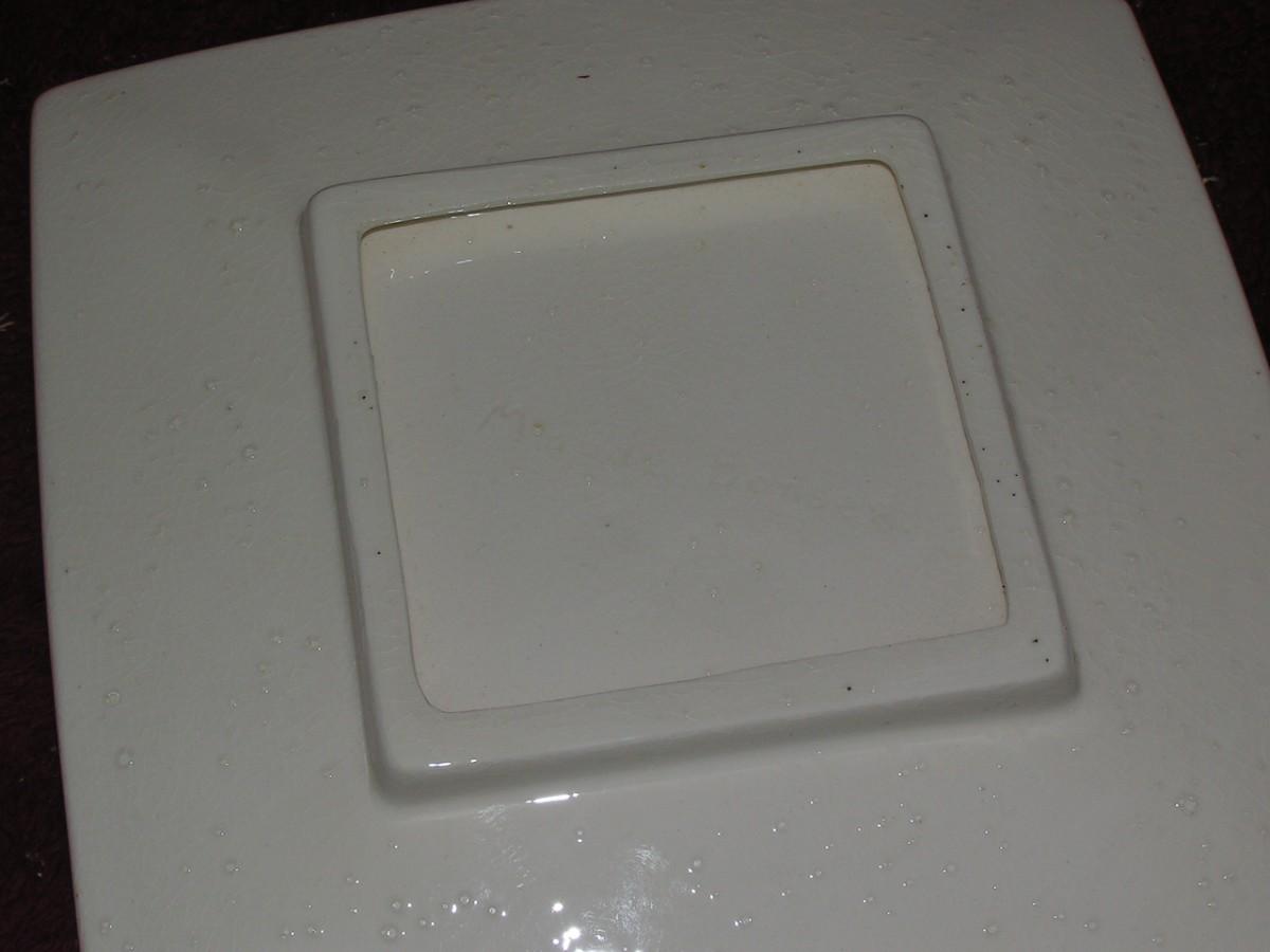 Footed square flat dish. Glazed ceramic, not labeled,