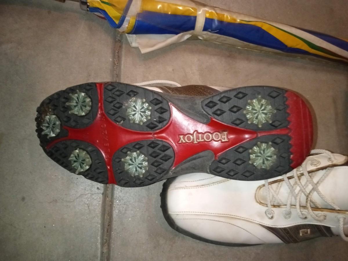 FOOTJOY GOLF SHOES 11M, BALL SHAGGER, GOLF BALLS, TEES AND UMBRELLA